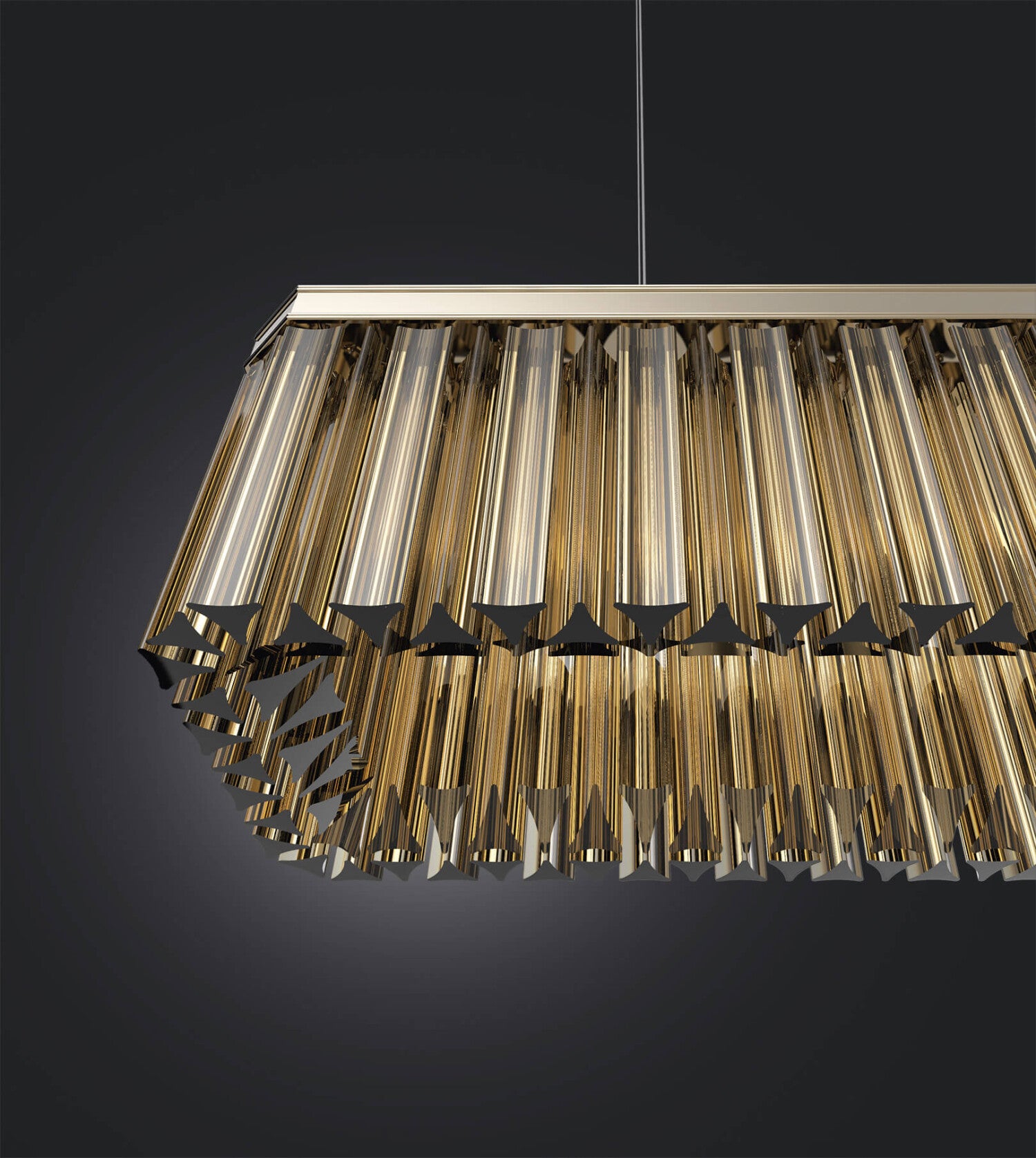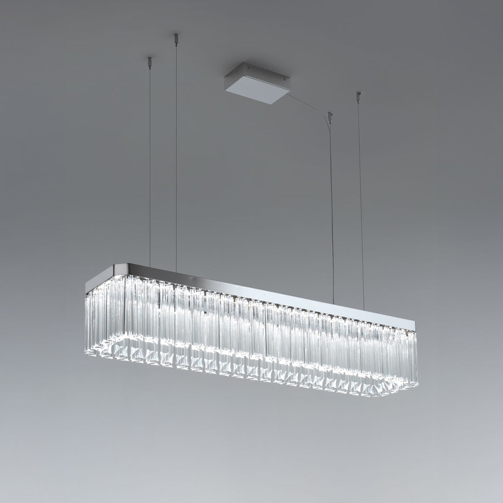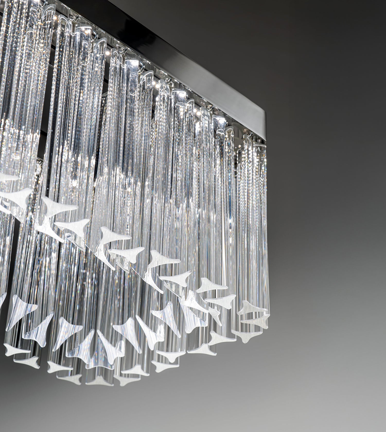 The 4013 suspension consists of a minimal metal structure from which drop precious glass quadrihed.