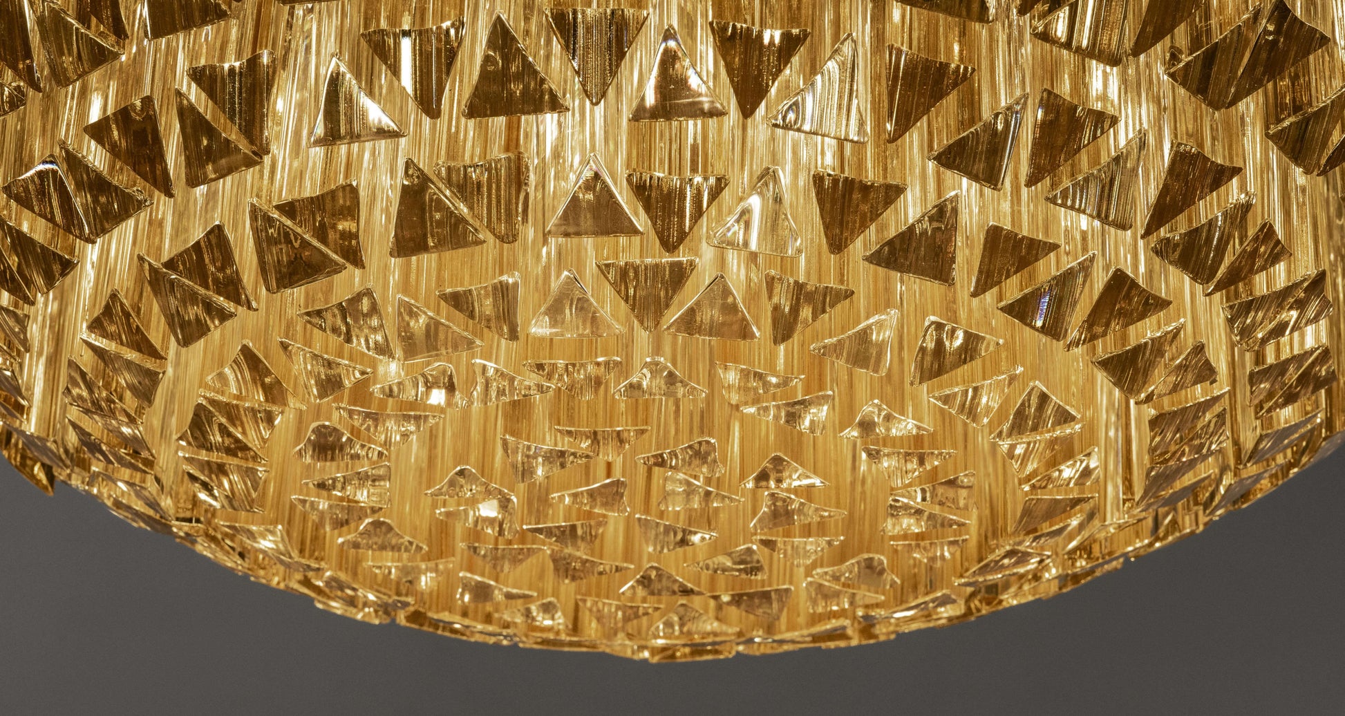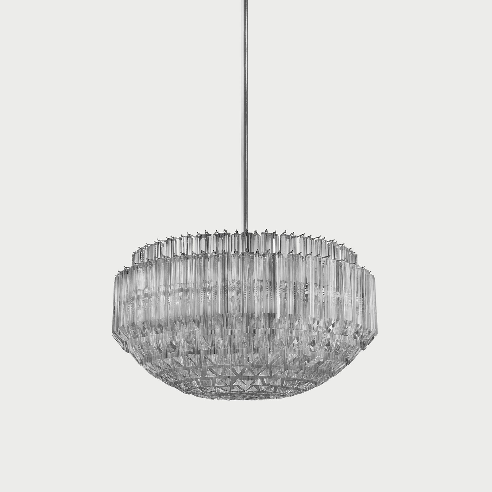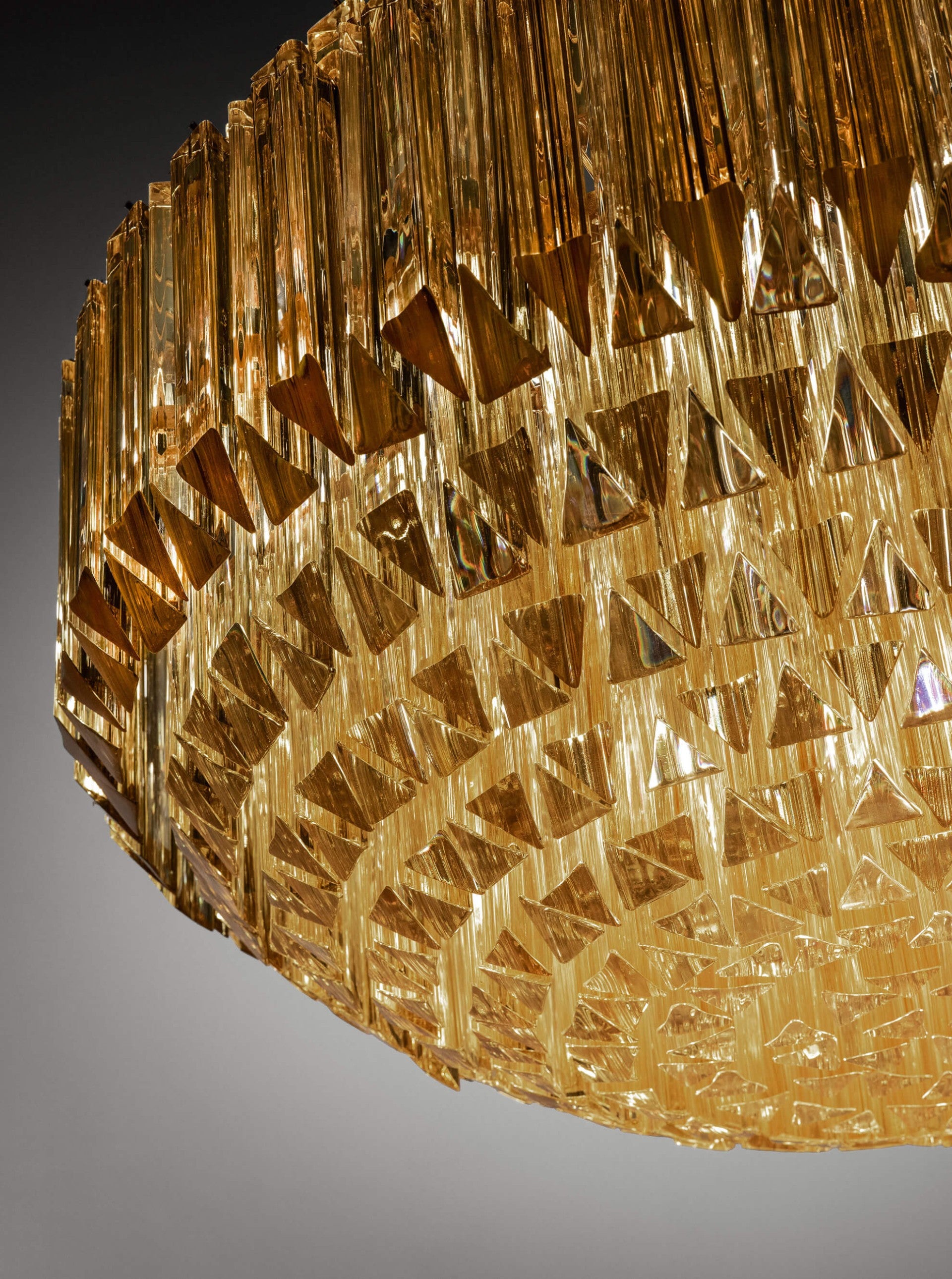 Pendant made of glass trihedrons with amber or transparent finish, light gold or chrome metal finish.