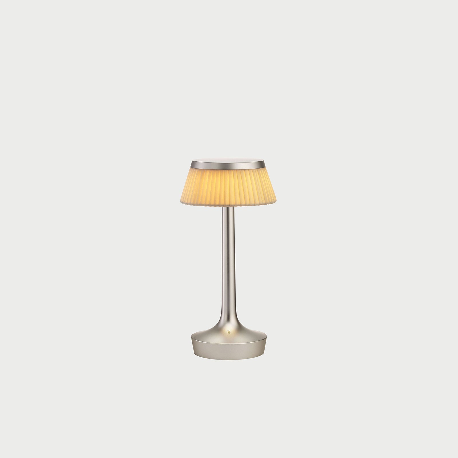 Cordless table lamp providing direct light. Painted or electroplated base and top cover in ABS. Injection moulded PMMA clear transparent diffuser and lampshade. Edge Lighting technology light source. 6/24 hours battery life, rechargeable with Micro-USB. Optical switch sensor on the base that provide 4-step dimming function. USB-C charger cable included in the package useful length 120 cm. Plug-in USB battery charger with interchangeable plugs