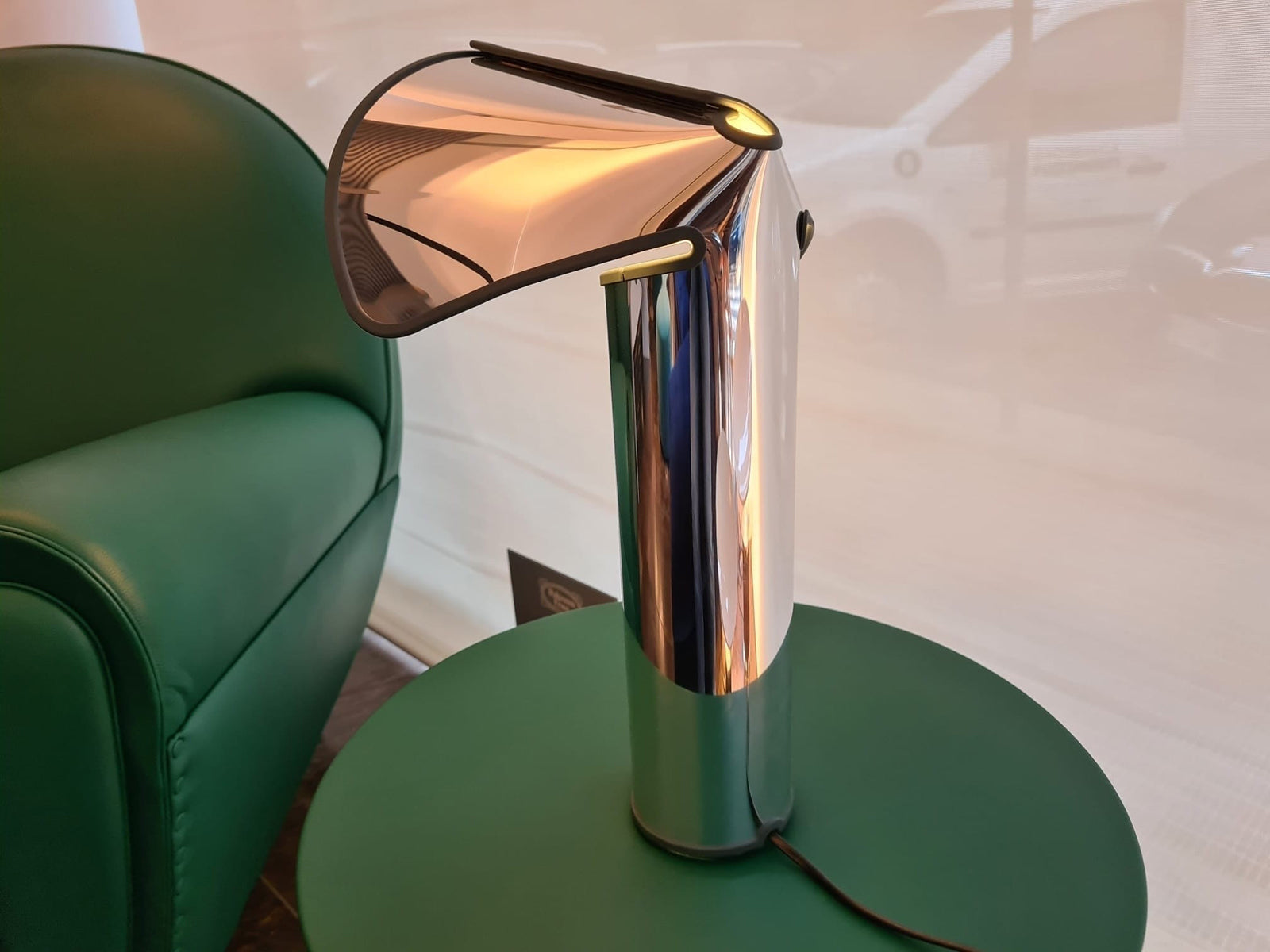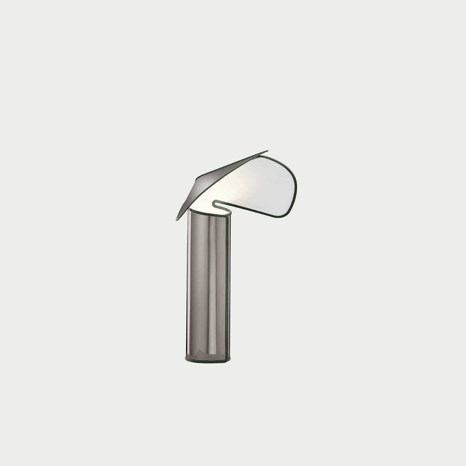Table lamp composed of a reflecting body in aluminium in 3 colour variations, finished internally with an opaque white plastic film and folded and closed via hooks riveted to the sheet metal. A coloured seal in moulded tpu runs along the entire profile of the body. The internal base in extruded aluminium is attached to the body for stability and it also supports the bulb socket. The power cable has a dimmer switch to adjust the brightness. Usable cable length: 1.9 m