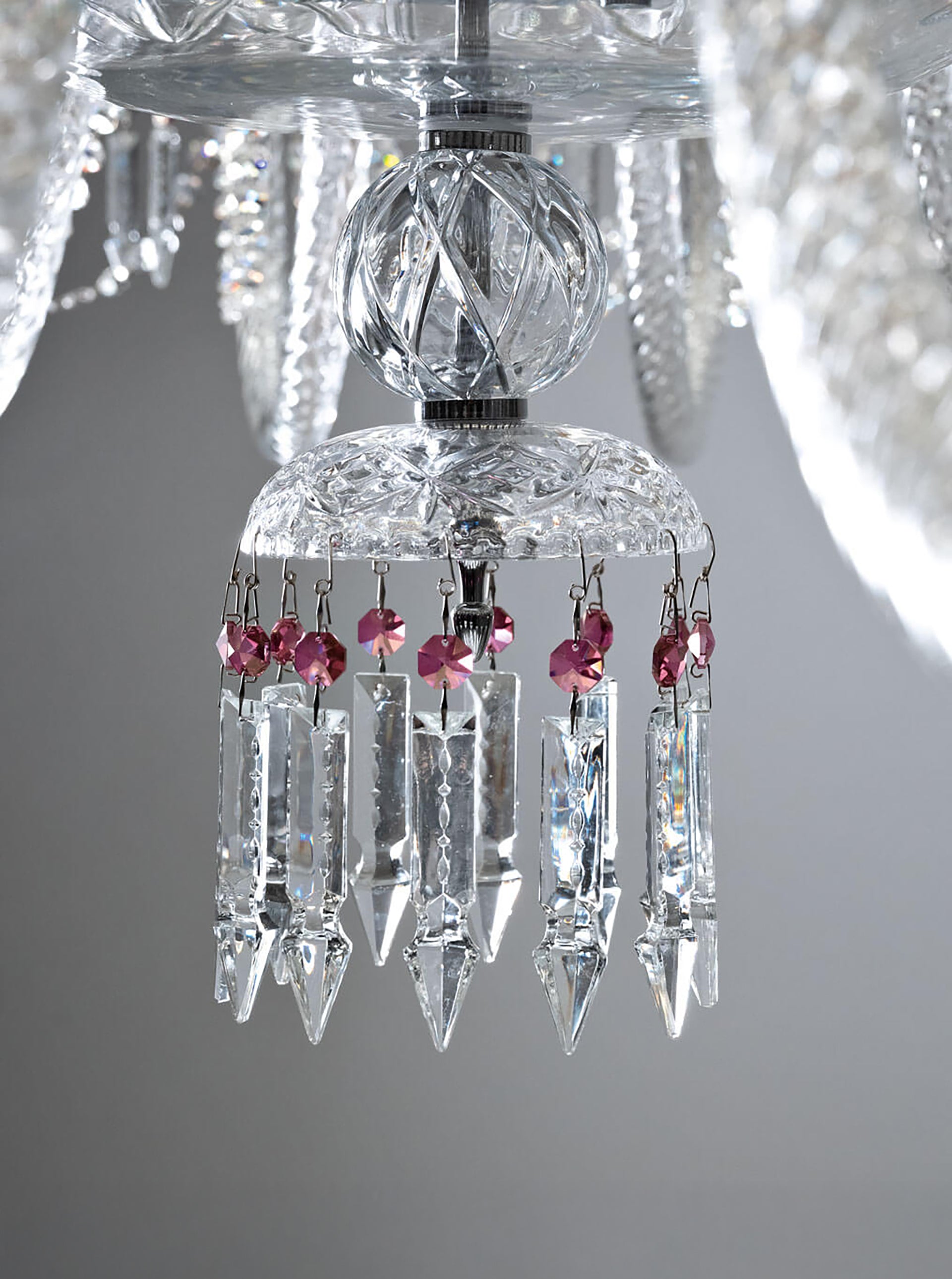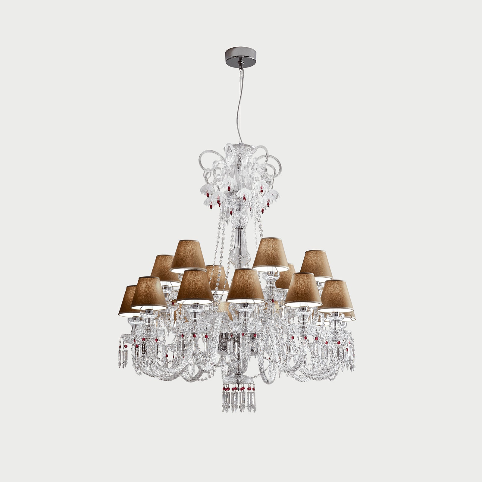 The Chanel chandelier is an iconic piece of our collection, with a magnetic personality that can attract attention for its timeless design. It is made of hand-carved crystal, transparent or black, embellished with burgundy pendants (or black) and supported by a metal structure with chrome finish.
