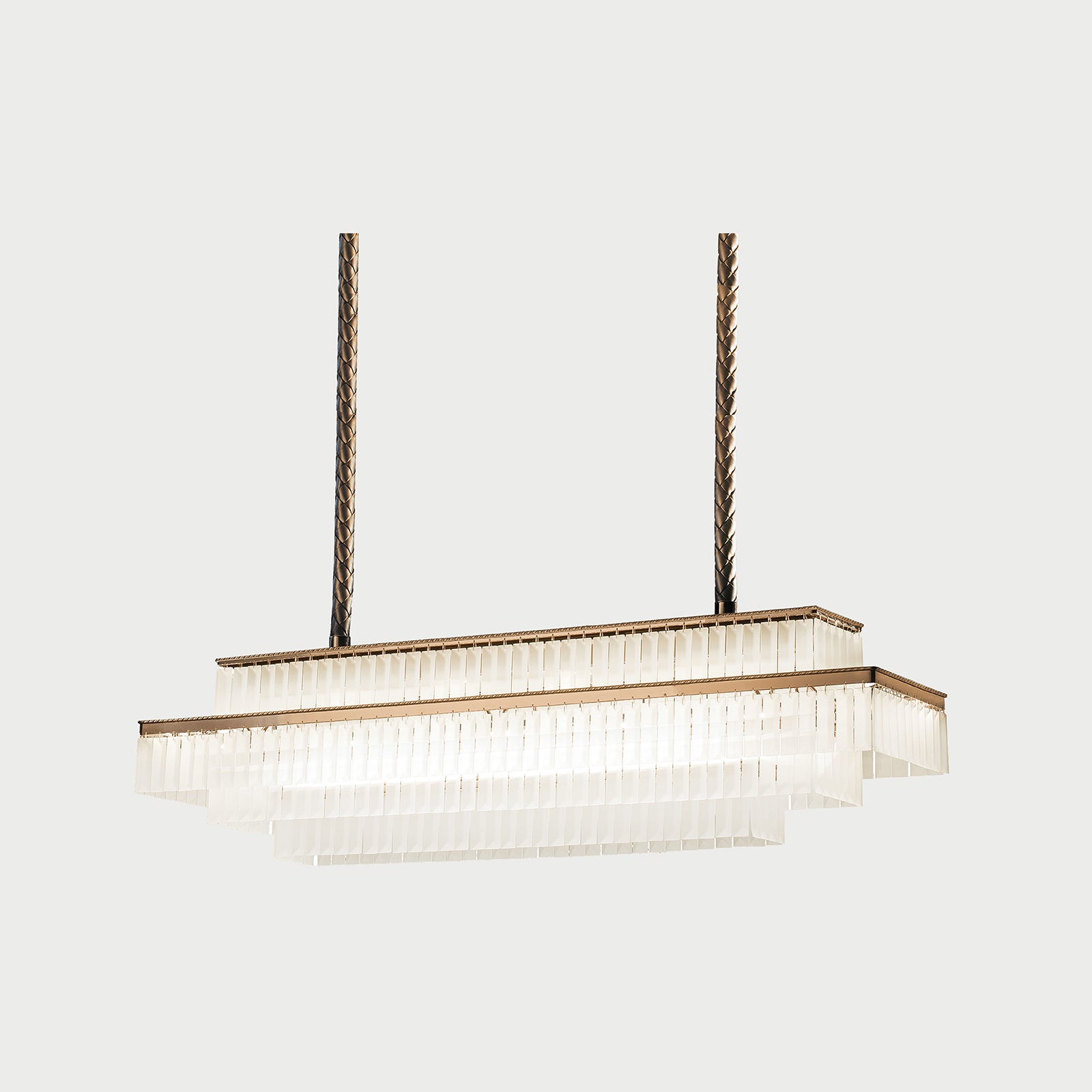 Suspension lamp in metal with gold nickel finish, satin glass elements and leather details.