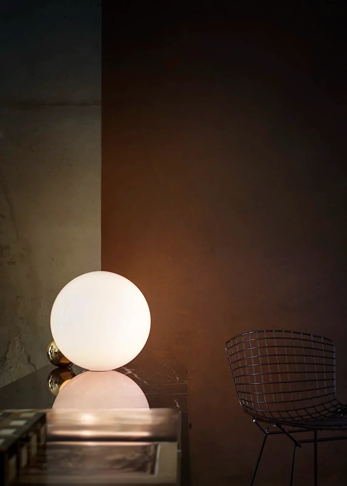 Table lighting fixture comprising an aluminium sphere machined from solid and then gold-coated with 24 K gold. Blown glass opal diffuser. LED light source with dimmer switch on the power cable.