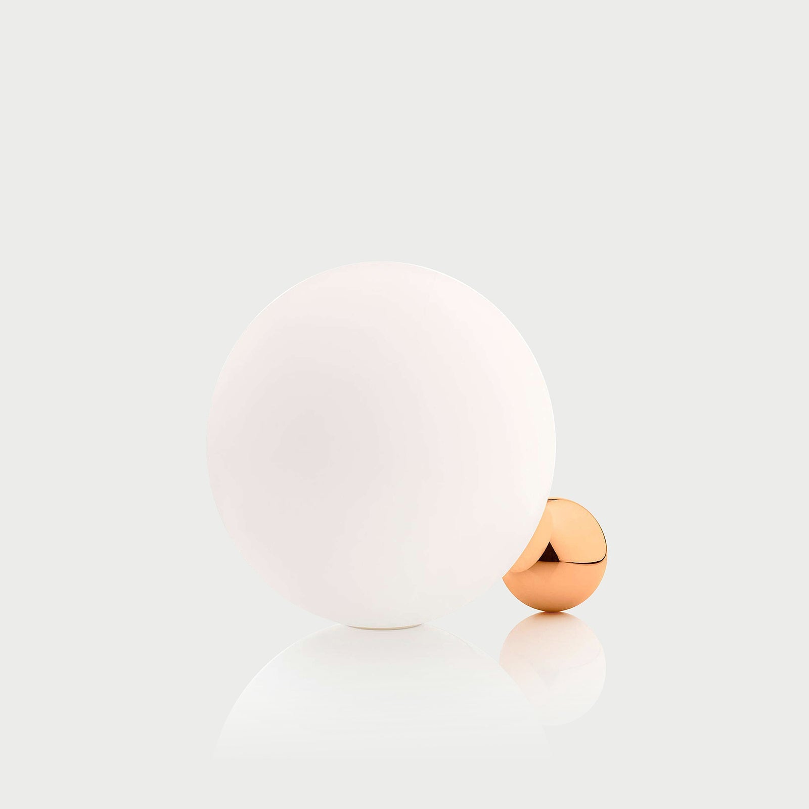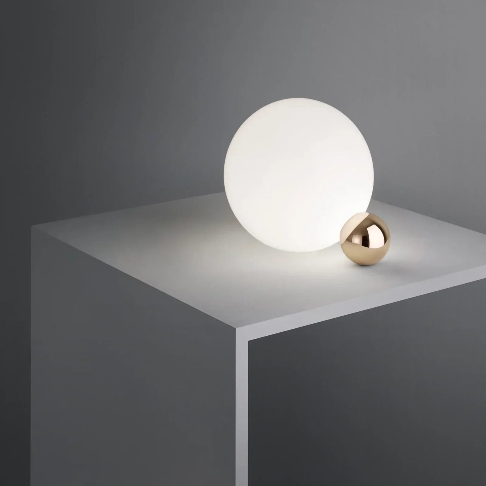 Table lighting fixture comprising an aluminium sphere machined from solid and then gold-coated with 24 K gold. Blown glass opal diffuser. LED light source with dimmer switch on the power cable.