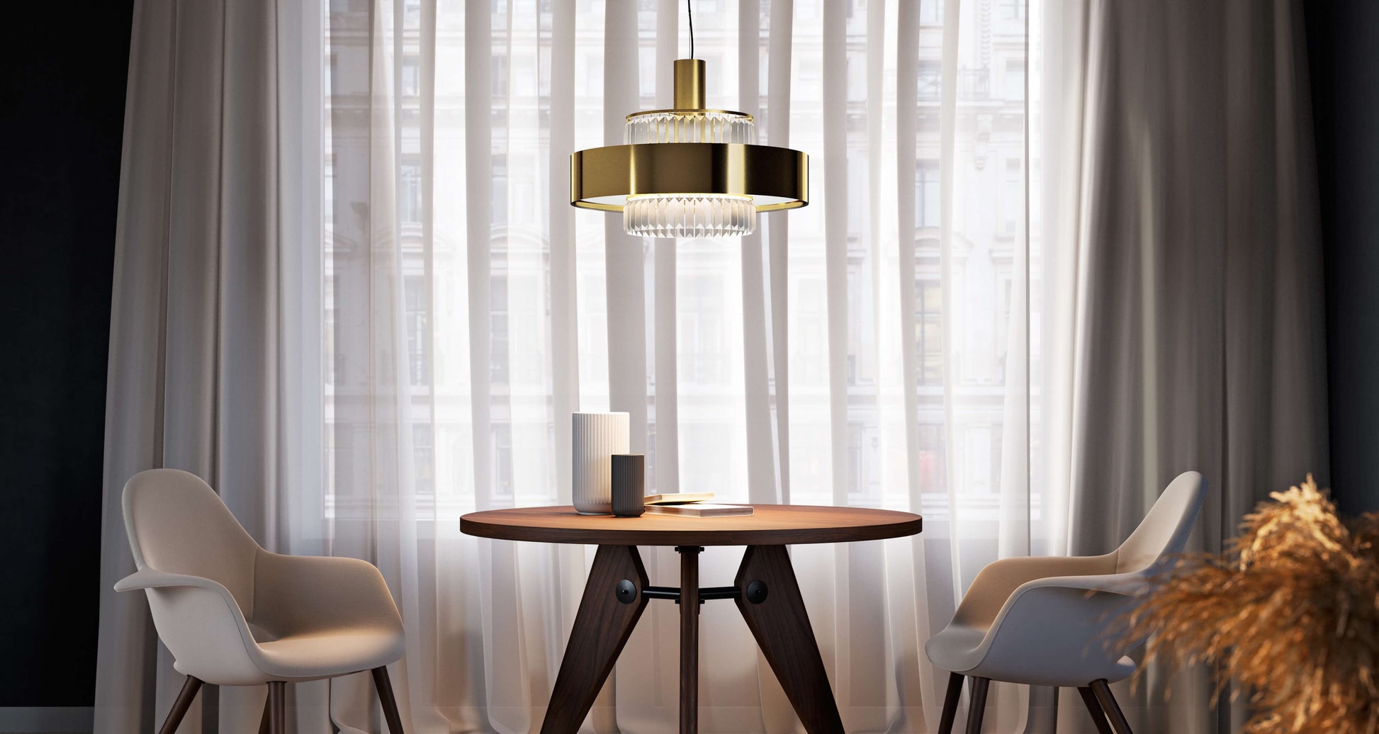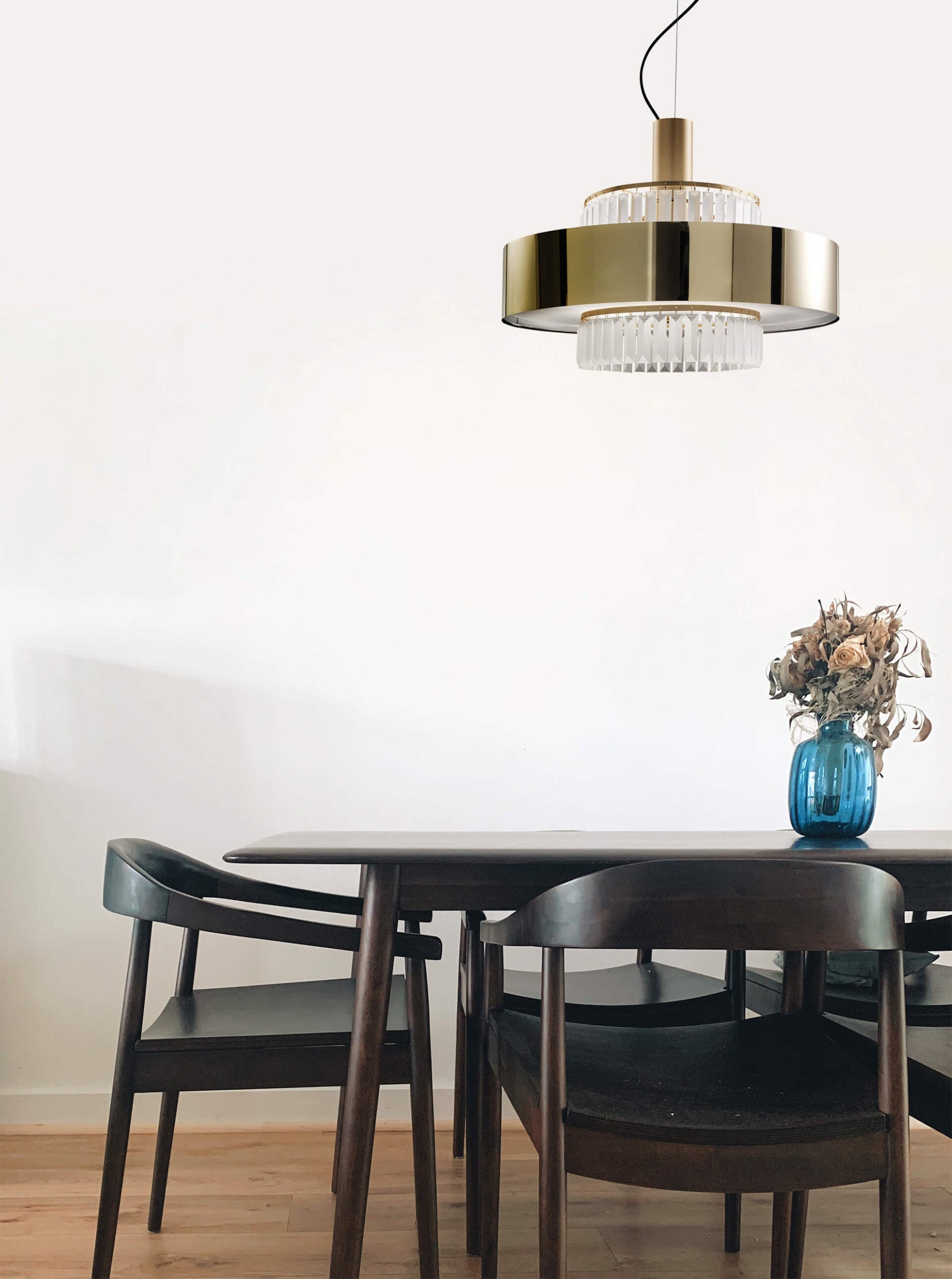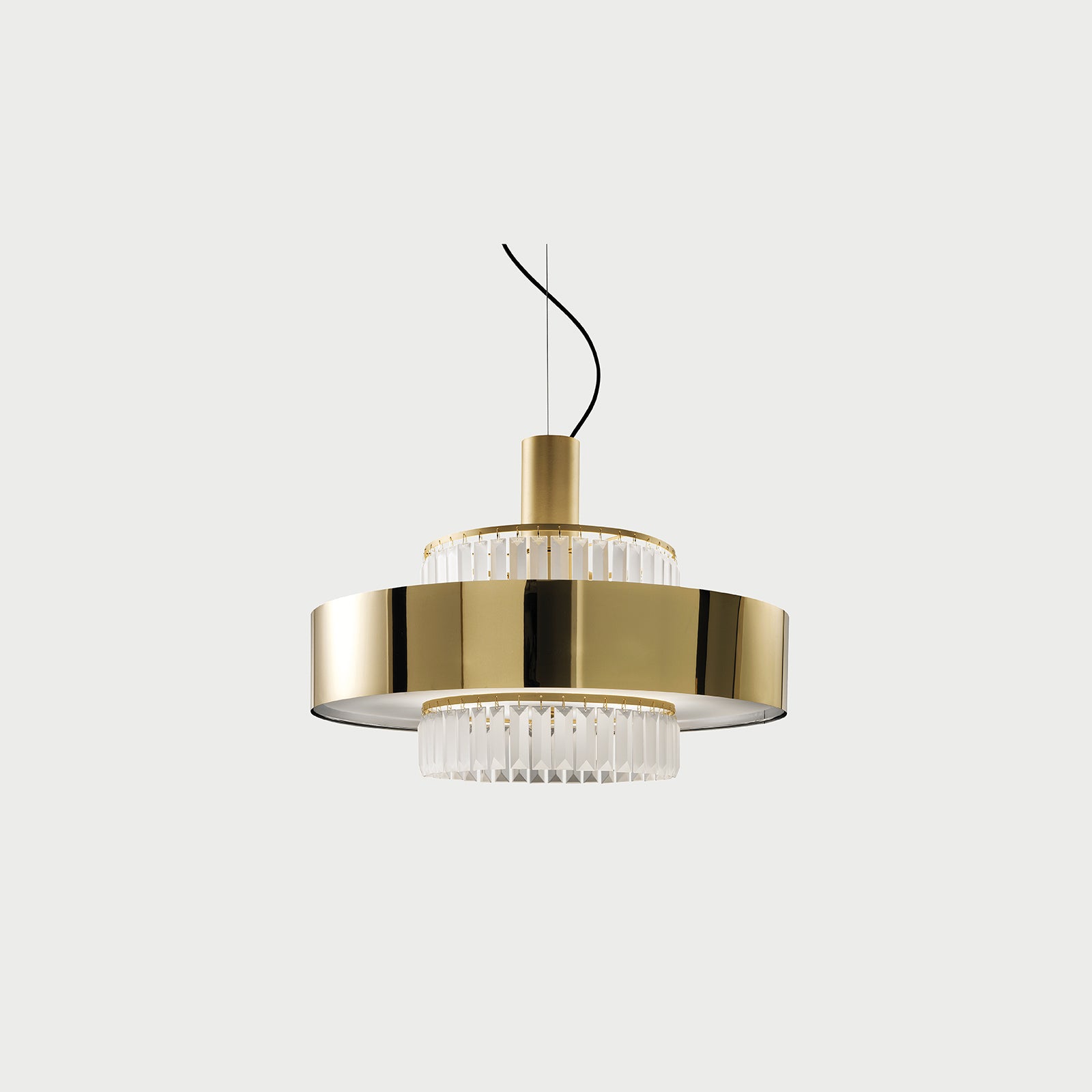 Crono is a collection of floor, wall and suspension lamps composed of a metal structure and a foil diffuser embellished with satin glass pendants.
