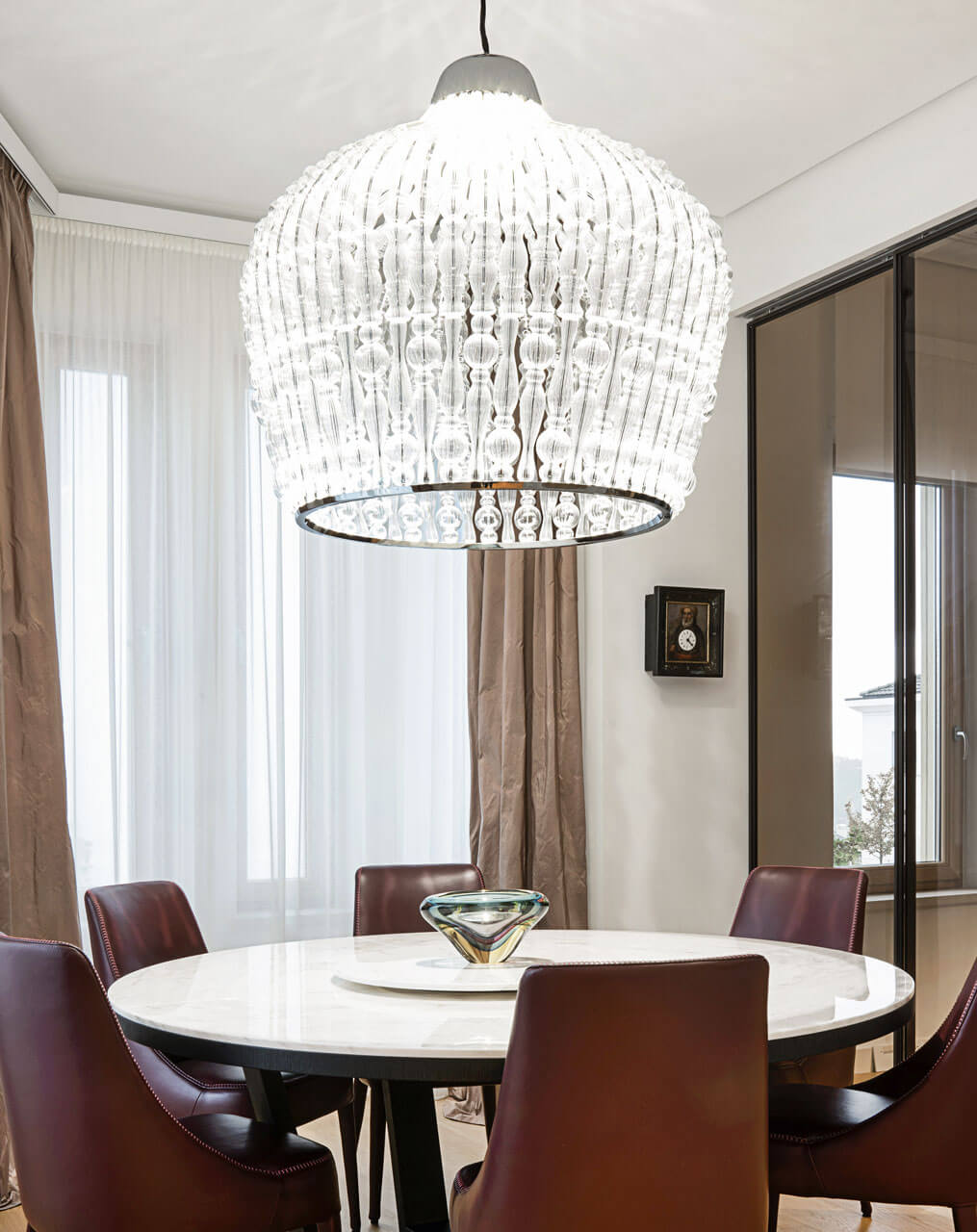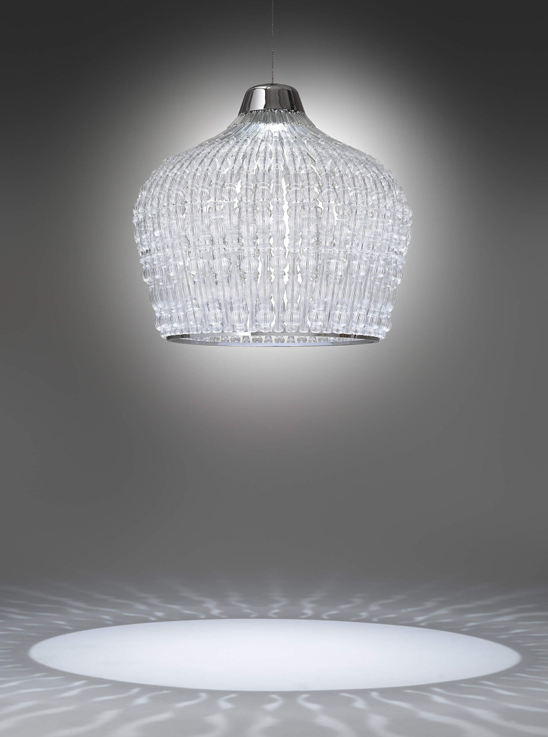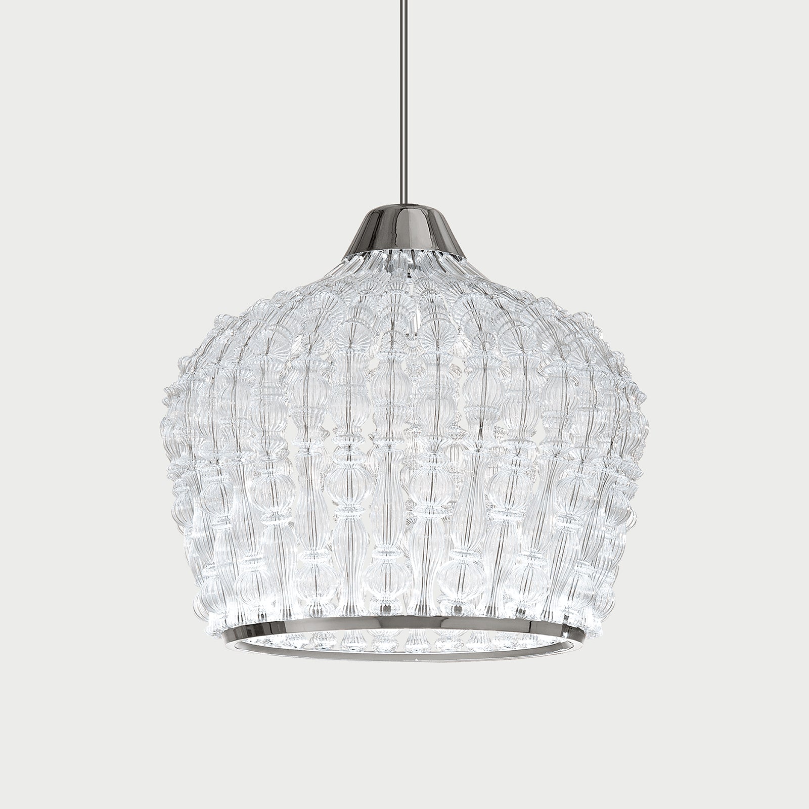 Suspension lamp with chrome metal structure and transparent blown glass elements.