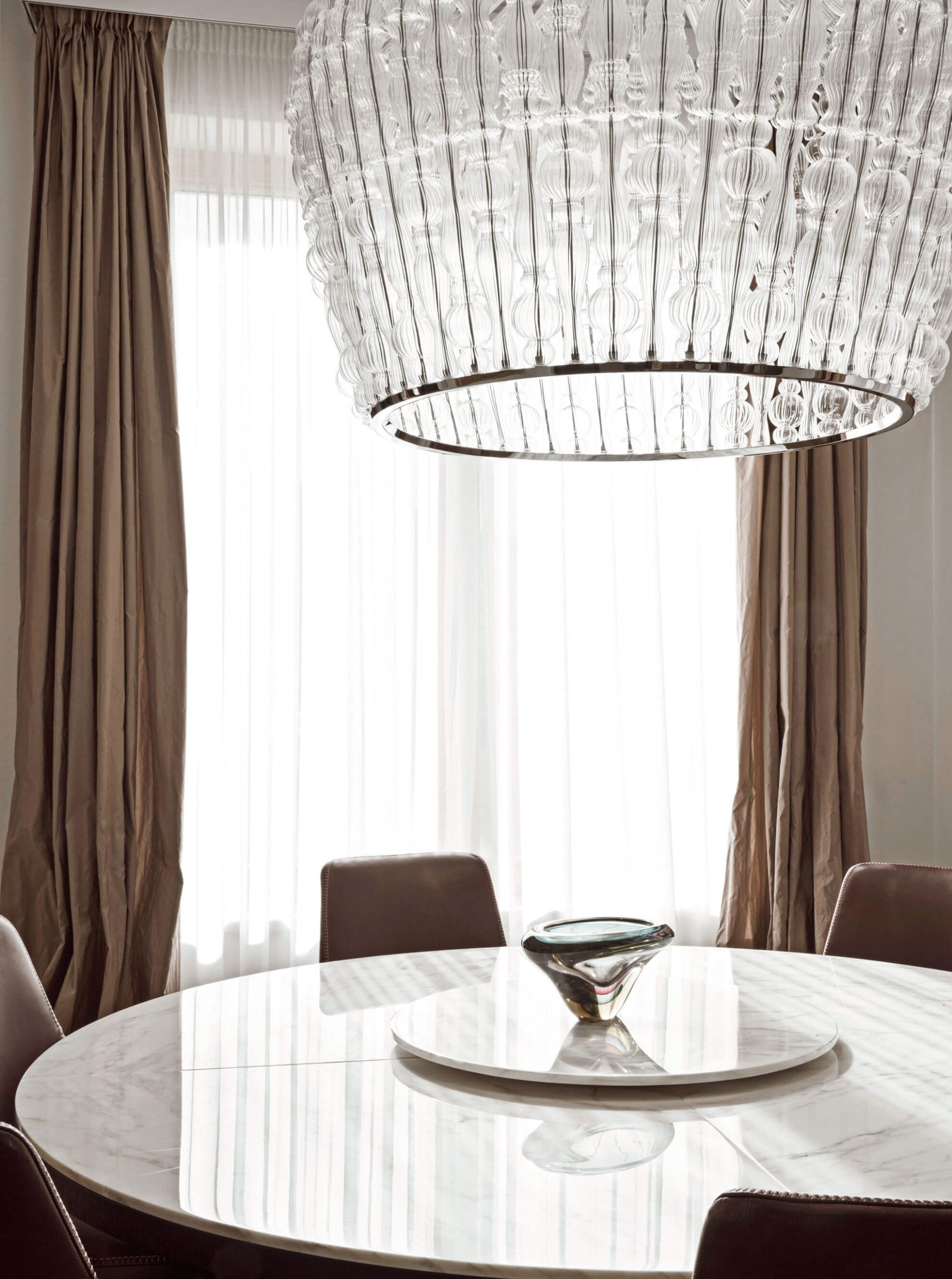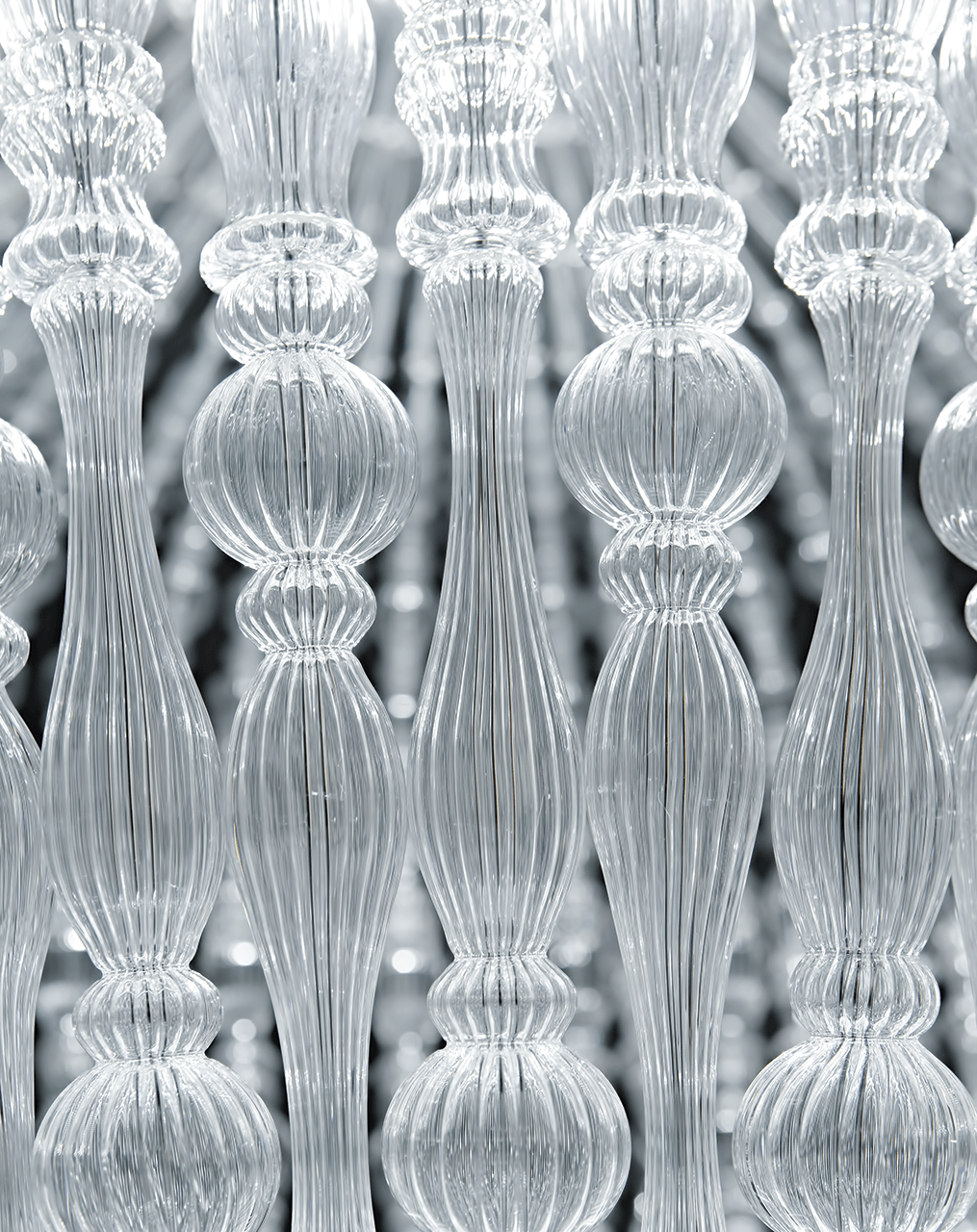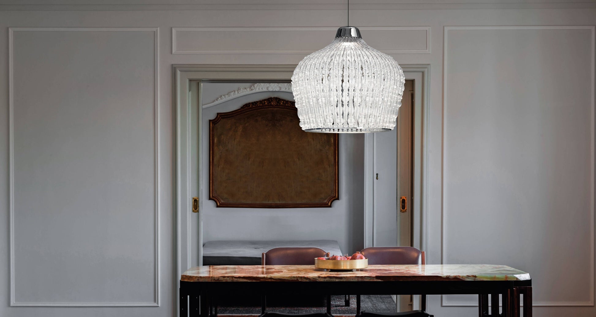 Suspension lamp with chrome metal structure and transparent blown glass elements.