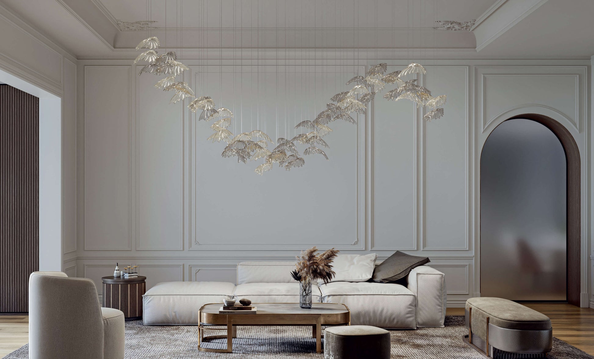 Dalia draws inspiration from the shape of a seashell bringing with it the wonder of the sea. Suspended it floats lightly in its dance transforming the surrounding space into a realm of magic.