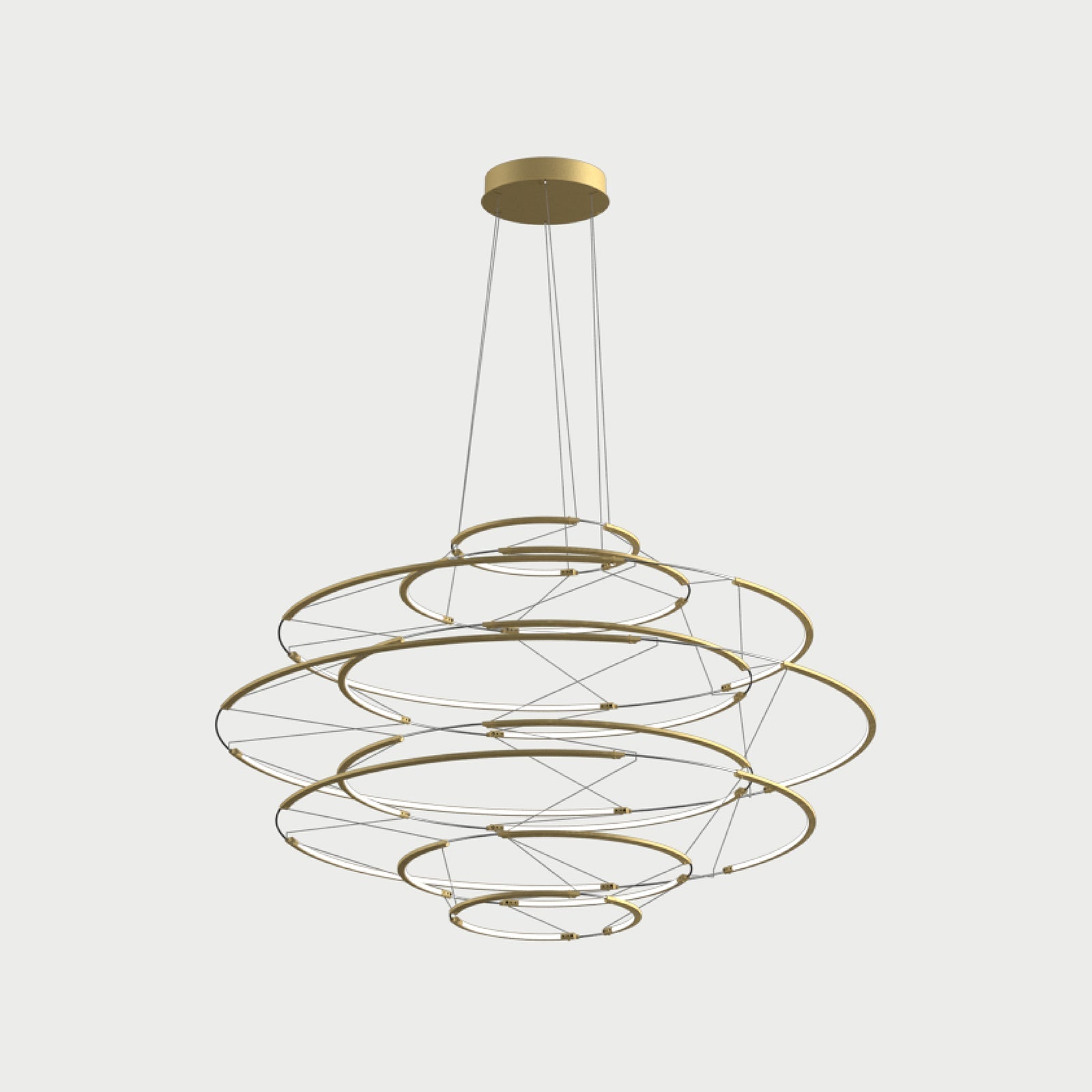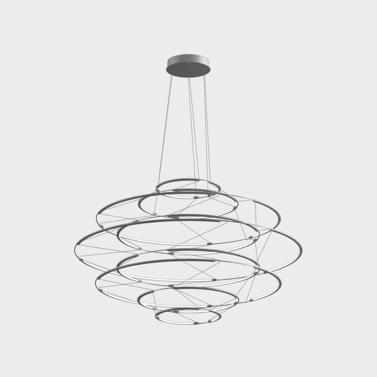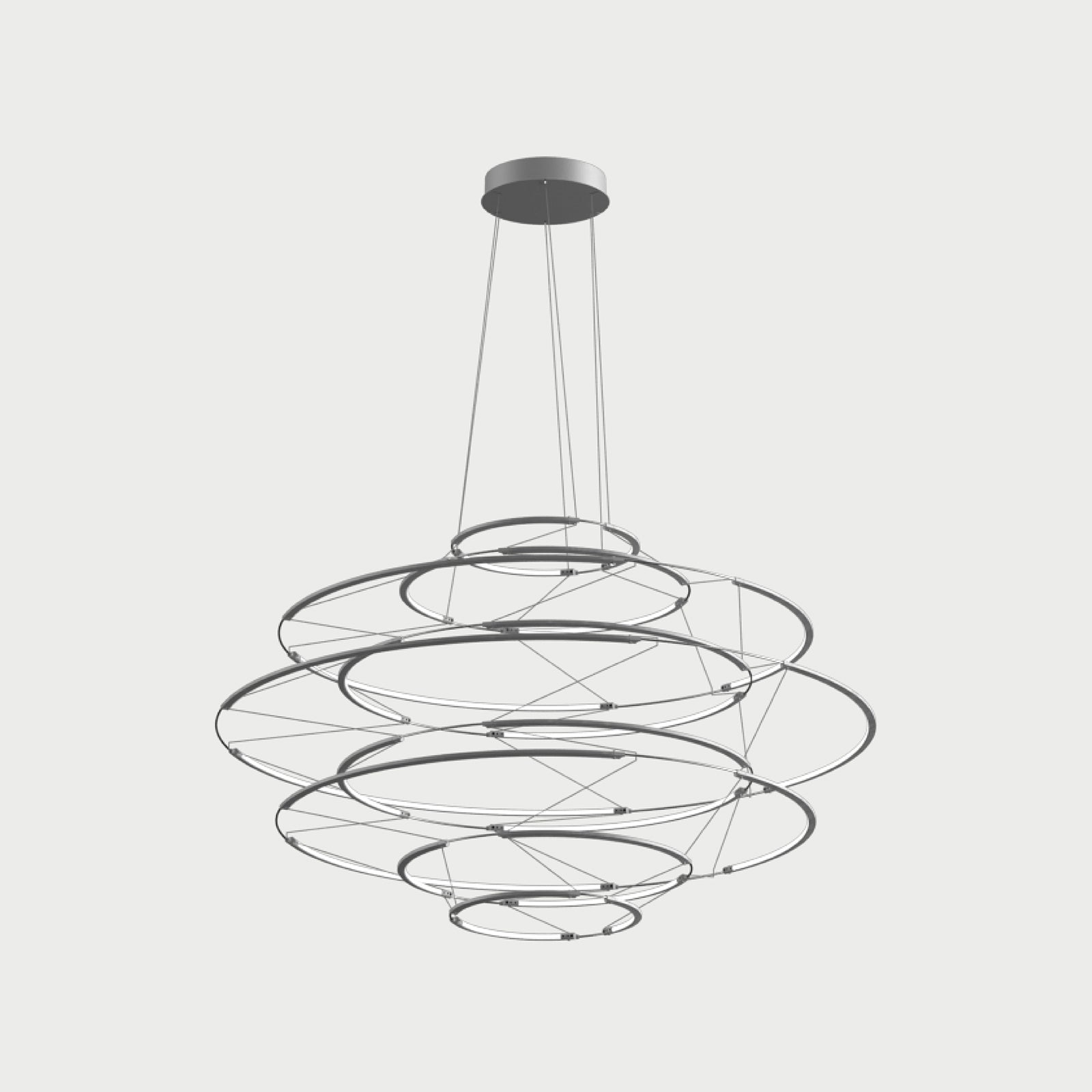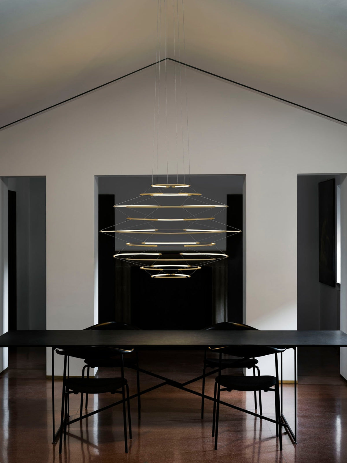 Instinct and constant design diligence in a collection that is the outcome of a sophisticated lighting engineering. A clear lines chandelier combined with an extremely slim aluminium structure for a soft echo of strong and diffused light. Each profile and connector is linked through a miniaturised connection for a unique result of suspended lightness.