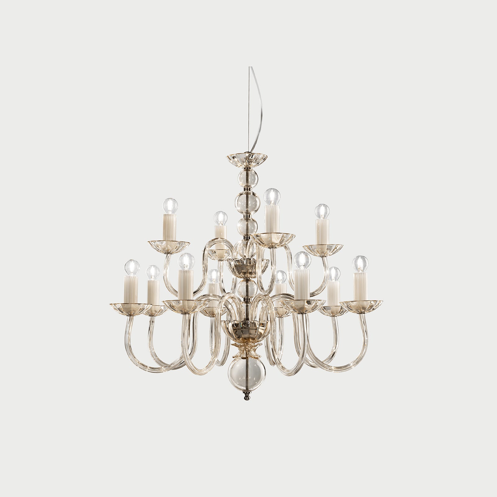 Suspension lamp in white, teak or clear carved crystal and glass. Metal structure in nickel or iron grey finish.