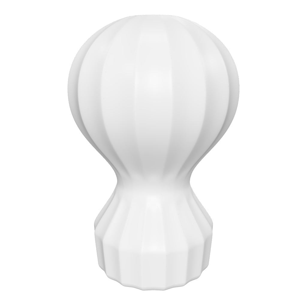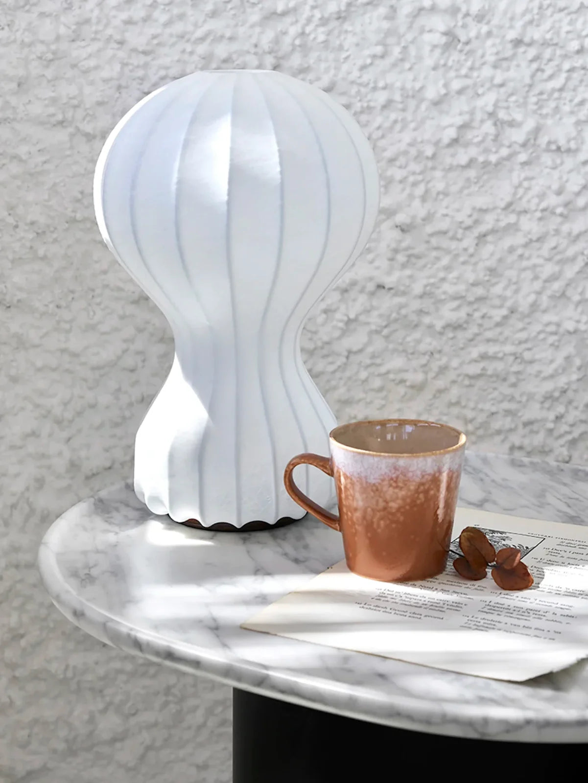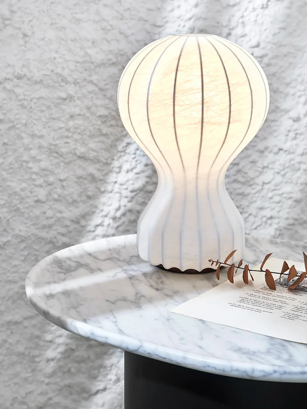 Table lamp providing diffused light. White powder coated internal steel structure sprayed with a unique "cocoon" resin to create the diffuser which is then protected by a transparent sprayed on finish. On the cable there is the electronic dimmer which allows the regulation of light brightness.