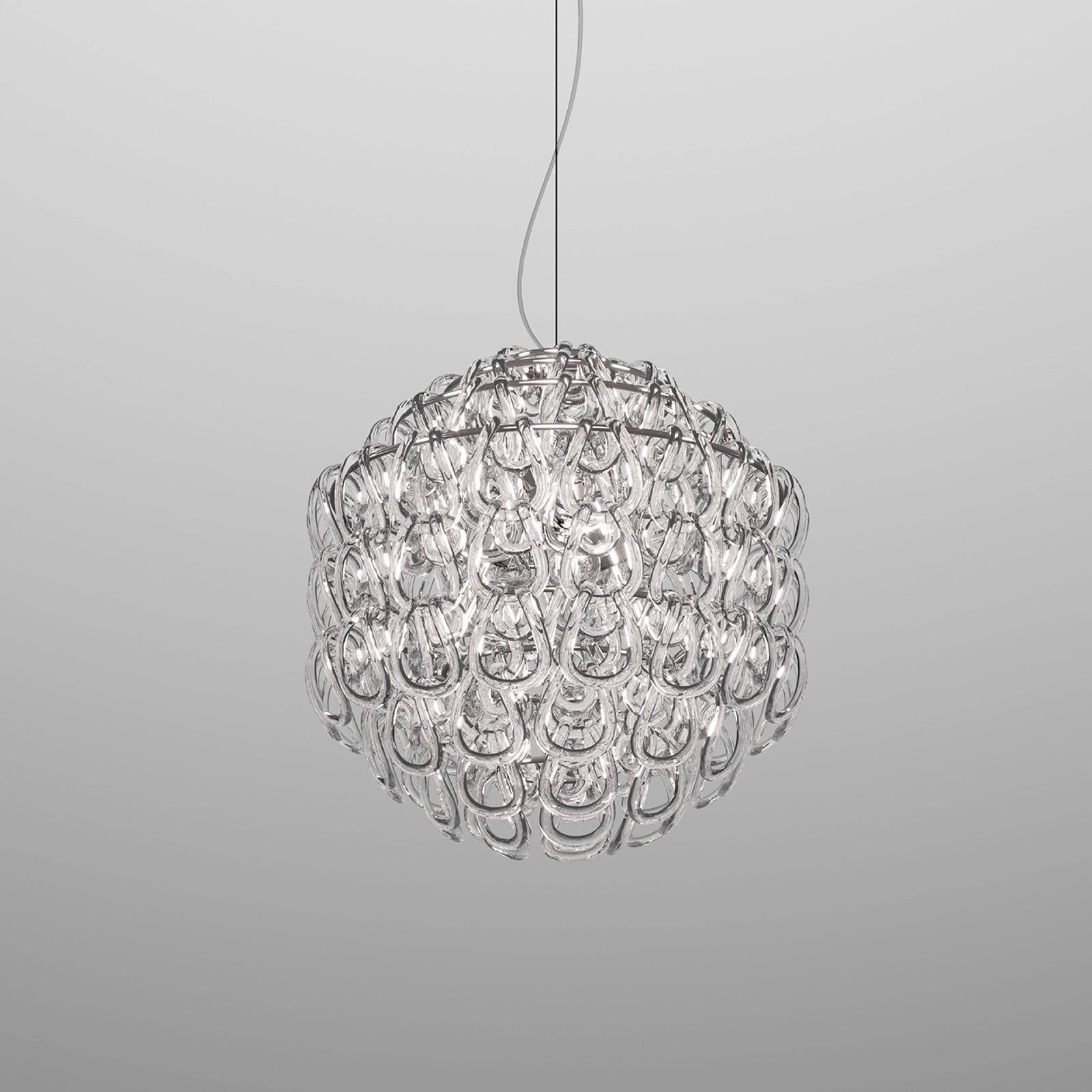 The Giogali lamp (Compasso d’Oro mention in 1969) introduced a new concept in the use of glass: a modular lighting system based on a single hand-crafted crystal element (a type of hook) that can be repeated indefinitely to give life to structures that appear like cascades of light.