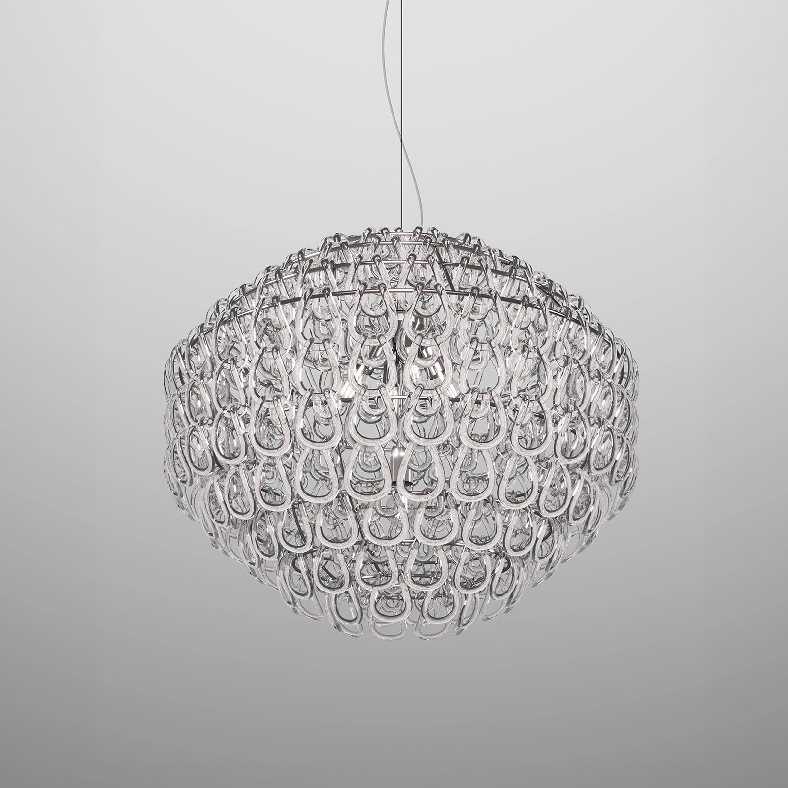 The Giogali lamp (Compasso d’Oro mention in 1969) introduced a new concept in the use of glass: a modular lighting system based on a single hand-crafted crystal element (a type of hook) that can be repeated indefinitely to give life to structures that appear like cascades of light.