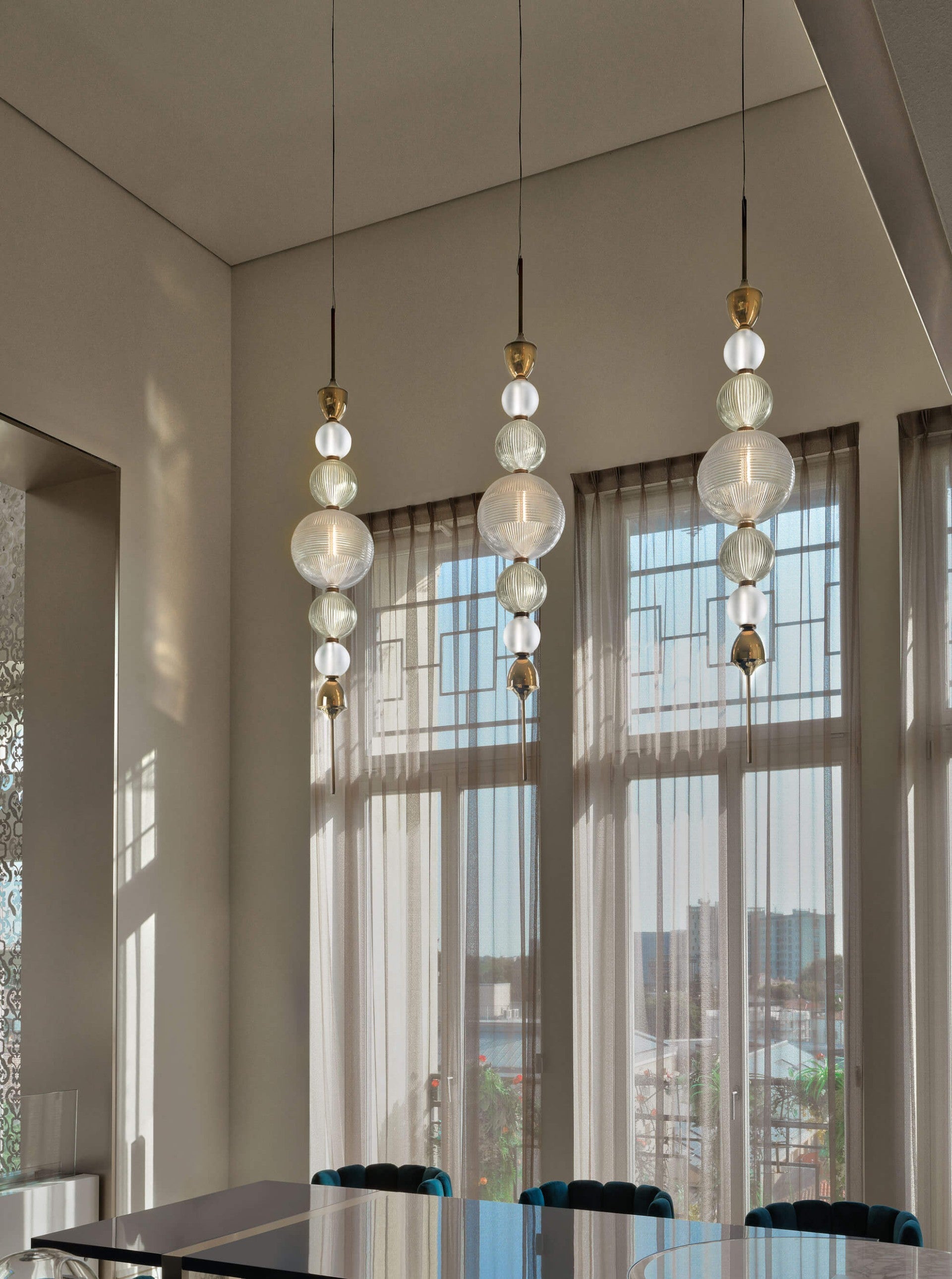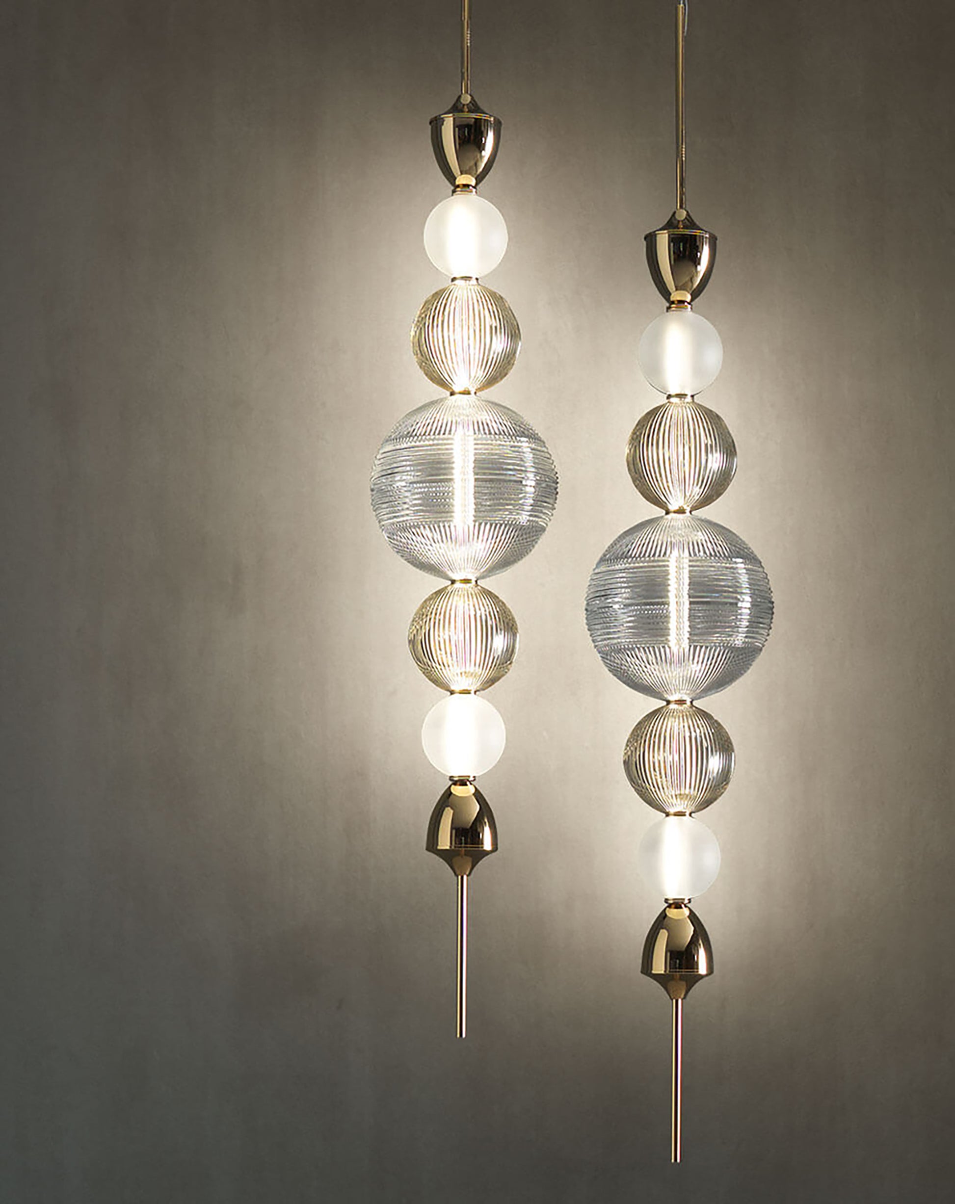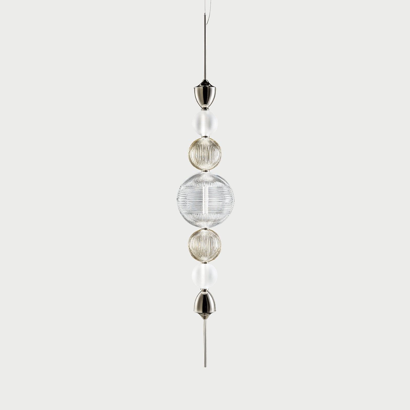 Suspension lamp with metal frame in light gold or nickel finish and hand-cut blown crystal diffuser.