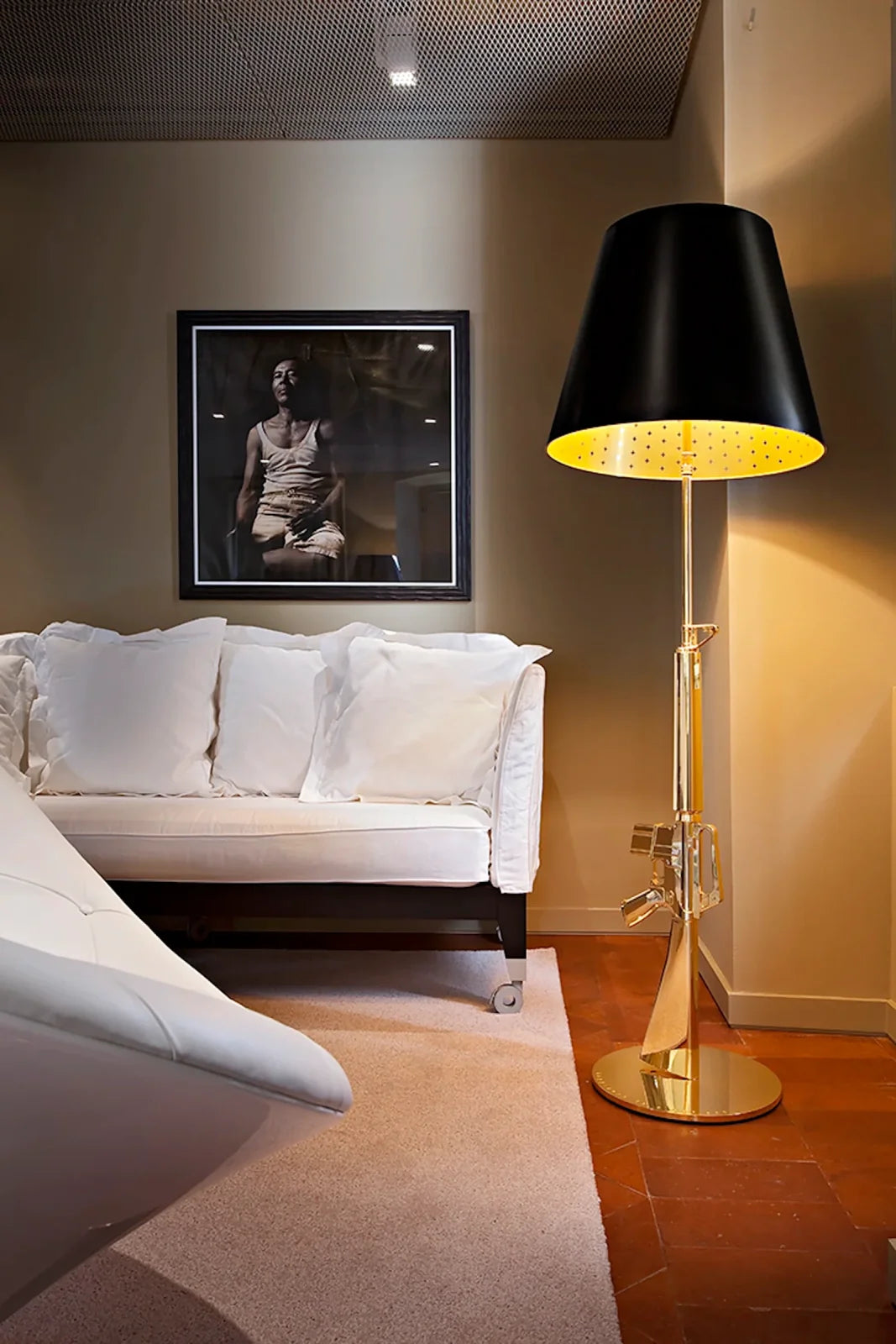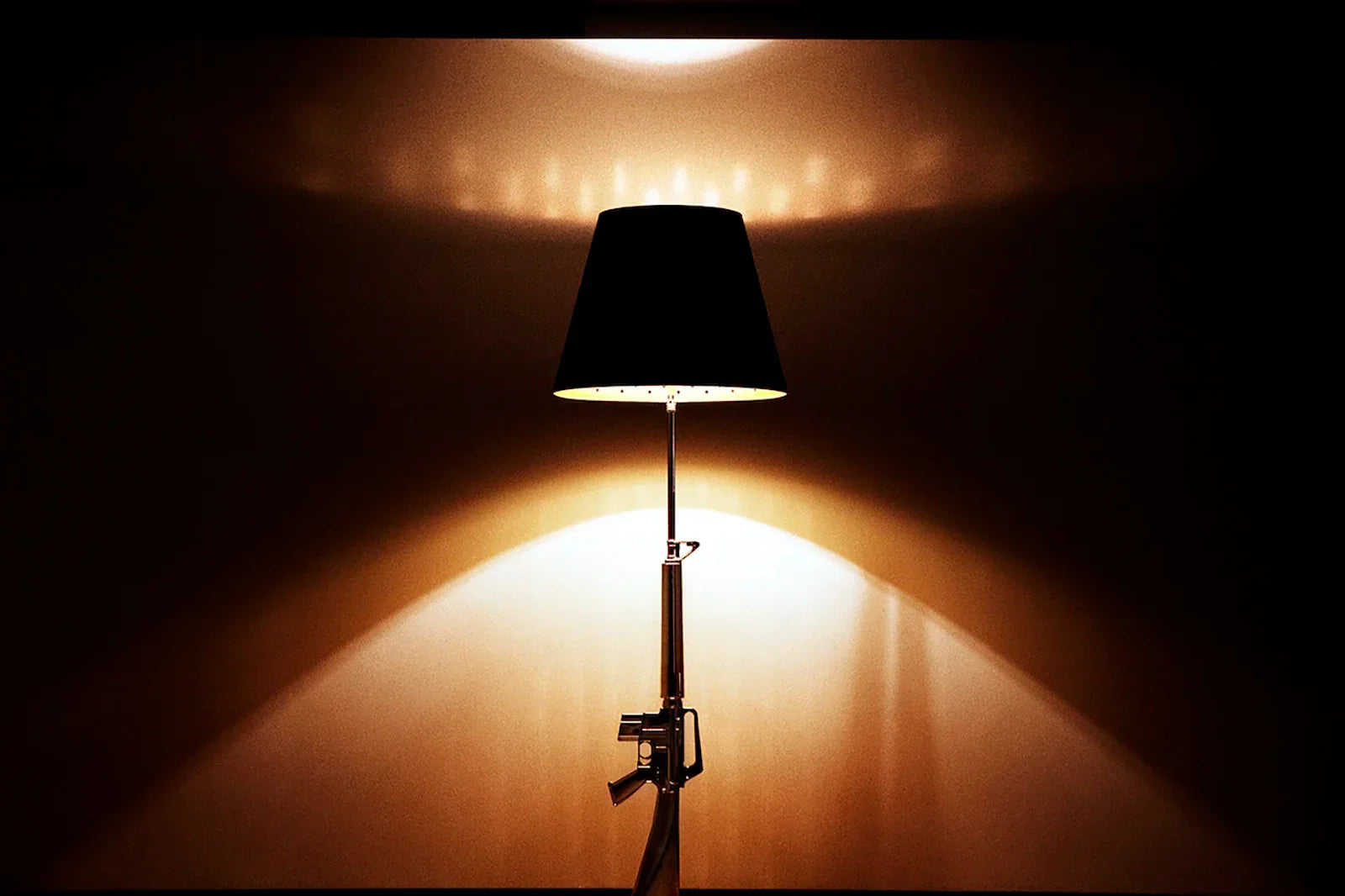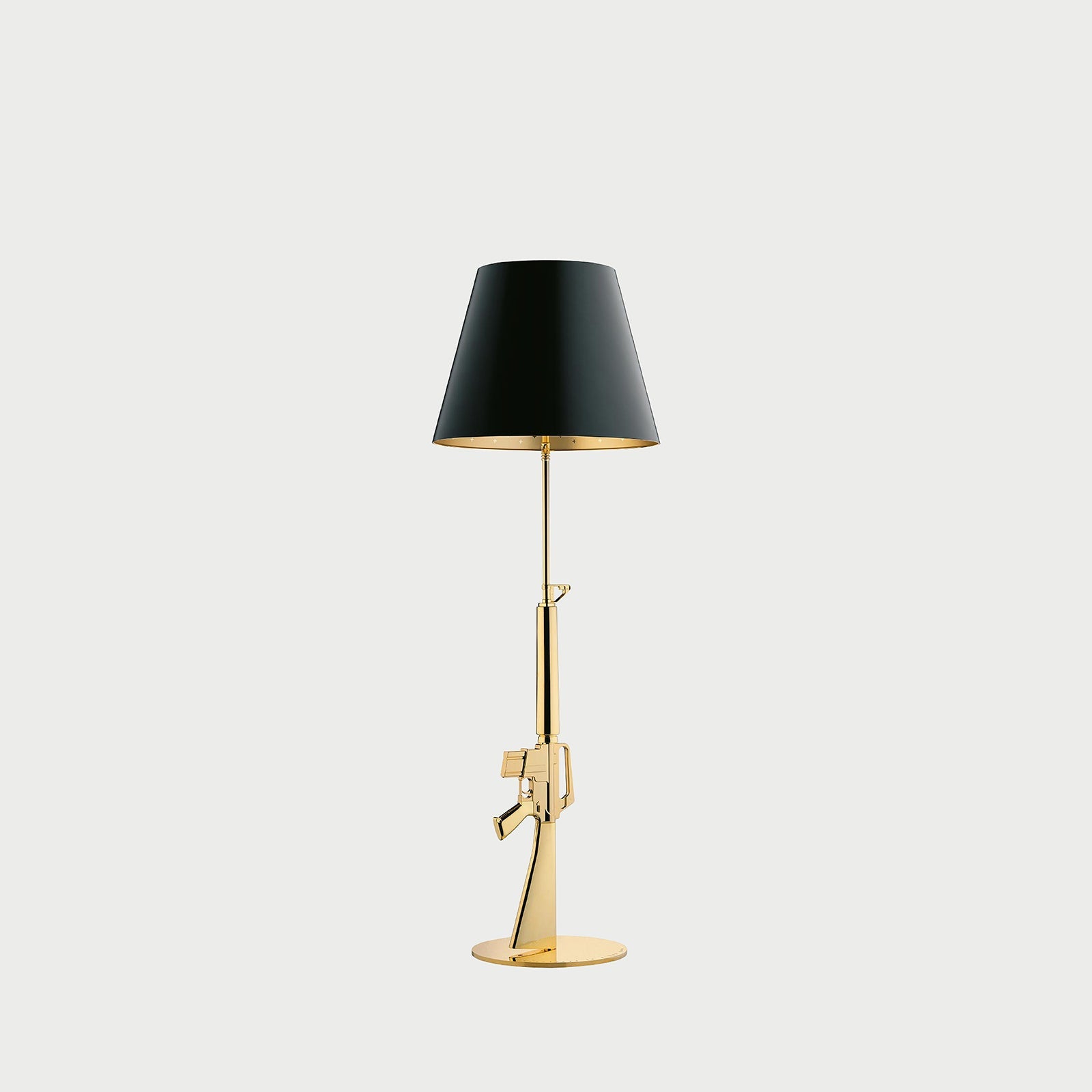 Inspiration behind the design: "Why doesn't furniture show that everything is a political choice?” asks designer Philippe Starck. Inspired to do just that, Starck created the Guns Collection to make a powerful statement. "The gold of the weapons represents the collusion between money and war. The Table Gun symbolizes the East, the Bed Side Gun symbolizes Europe, and the Lounge Gun represents the West. The black shade signifies death, and the crosses on the inside are to remind us of those who have passed."
