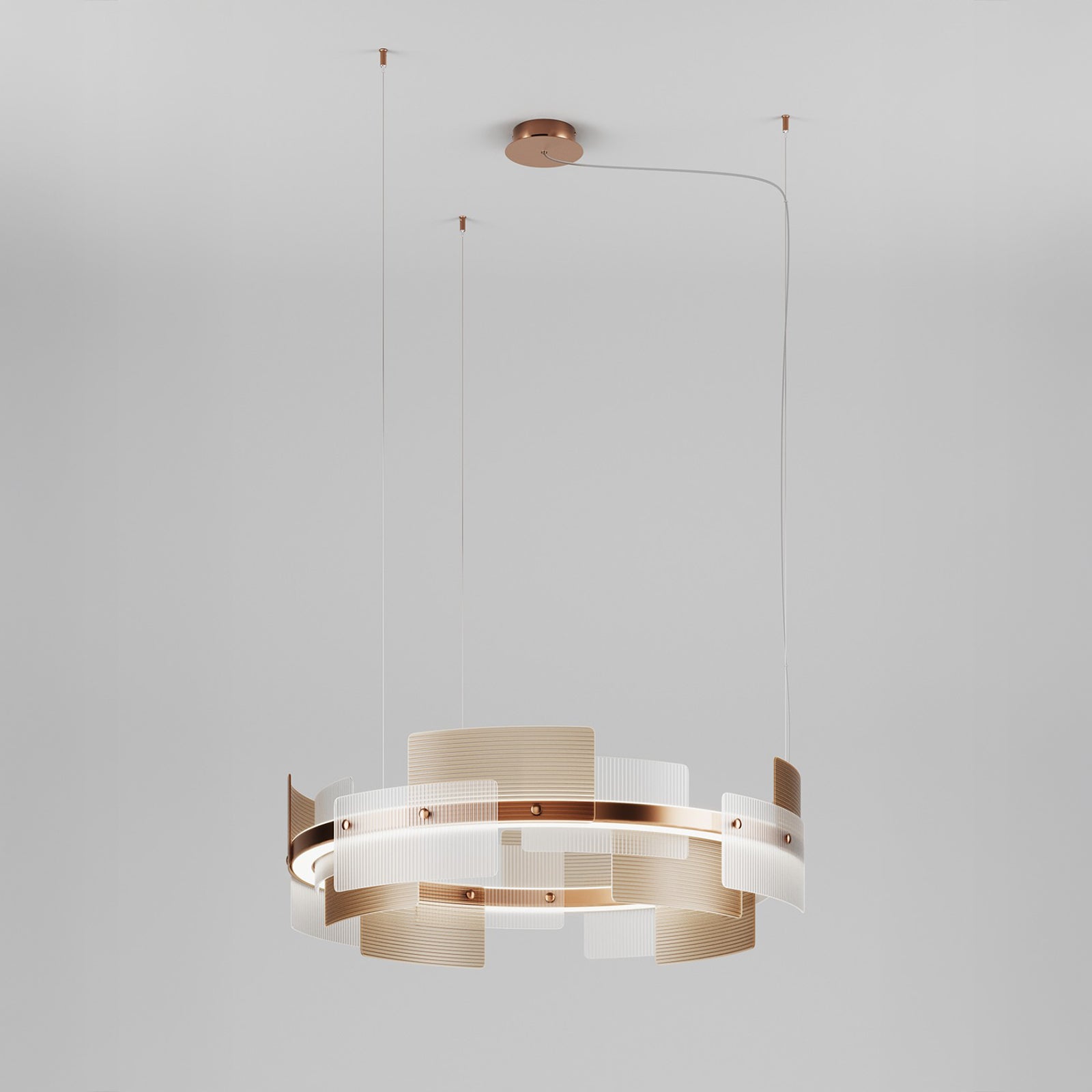 Pendant lamp available in matte midnight grey metal frame with micro ribbed satin white and satin smoked glass or a satin bronze metal frame with micro ribbed satin white and satin teak glass. Opal methacrylate diffusers.