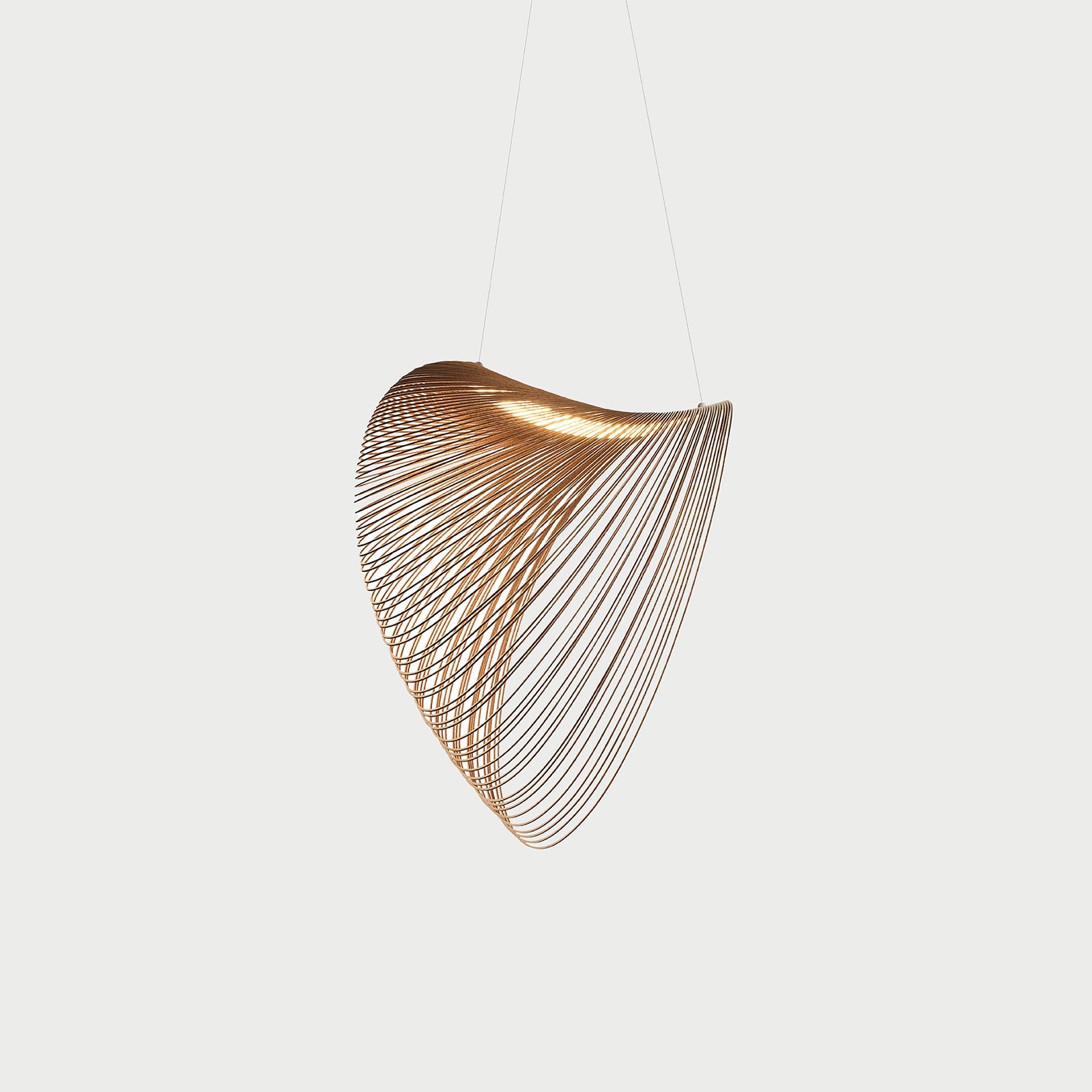 The lamp is composed of a very light body made with extremely thin, flexible plywood, cut by laser along densely packed equidistant lines. This is a precious and varying material whose unique natural character can be seen in the typical grain pattern. These characteristics are the distinctive features of the project. Once suspended from the ceiling, Illan takes on volume thanks to the force of gravity and assumes its characteristic form that floats in the air.