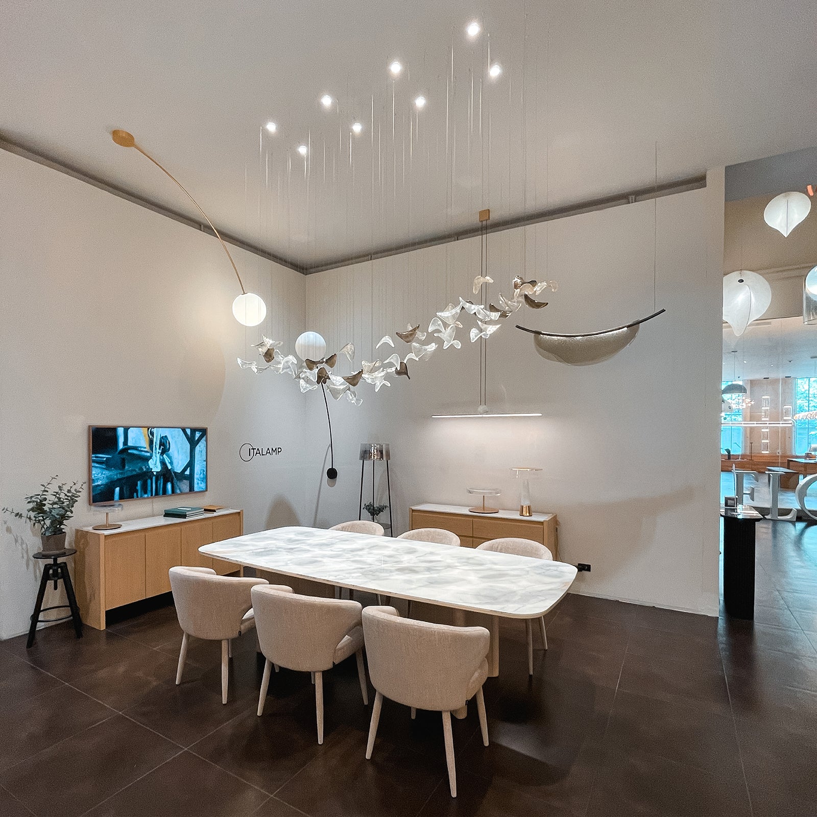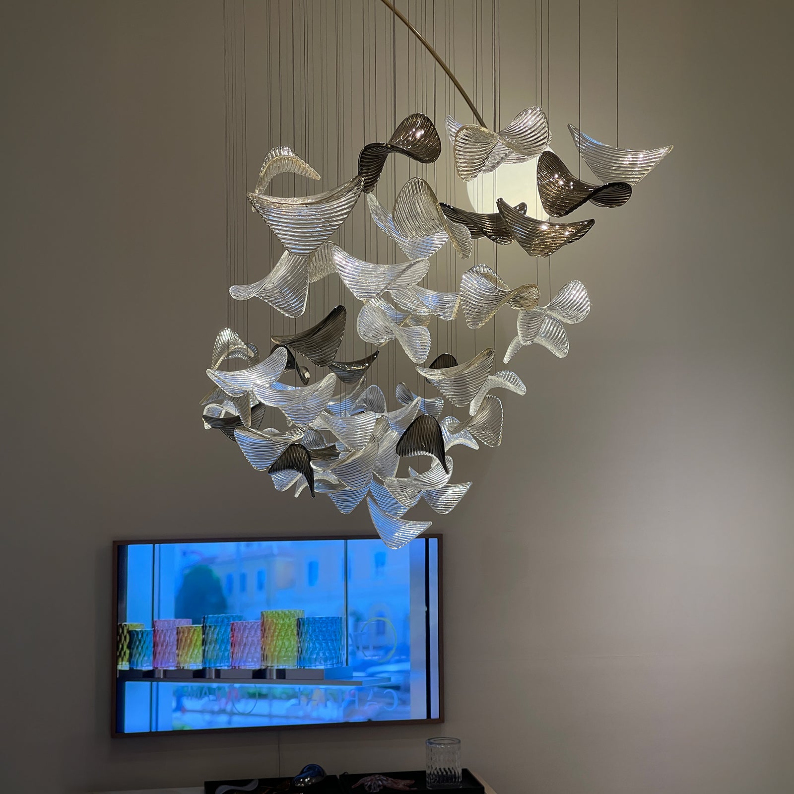 Sella brings an aura of elegance and movement. This composition creates lightness and dynamism, enriching the environment with light signs and fluid signs. The light reflects to the glass creating a kaleidoscope of shapes and reflections.
