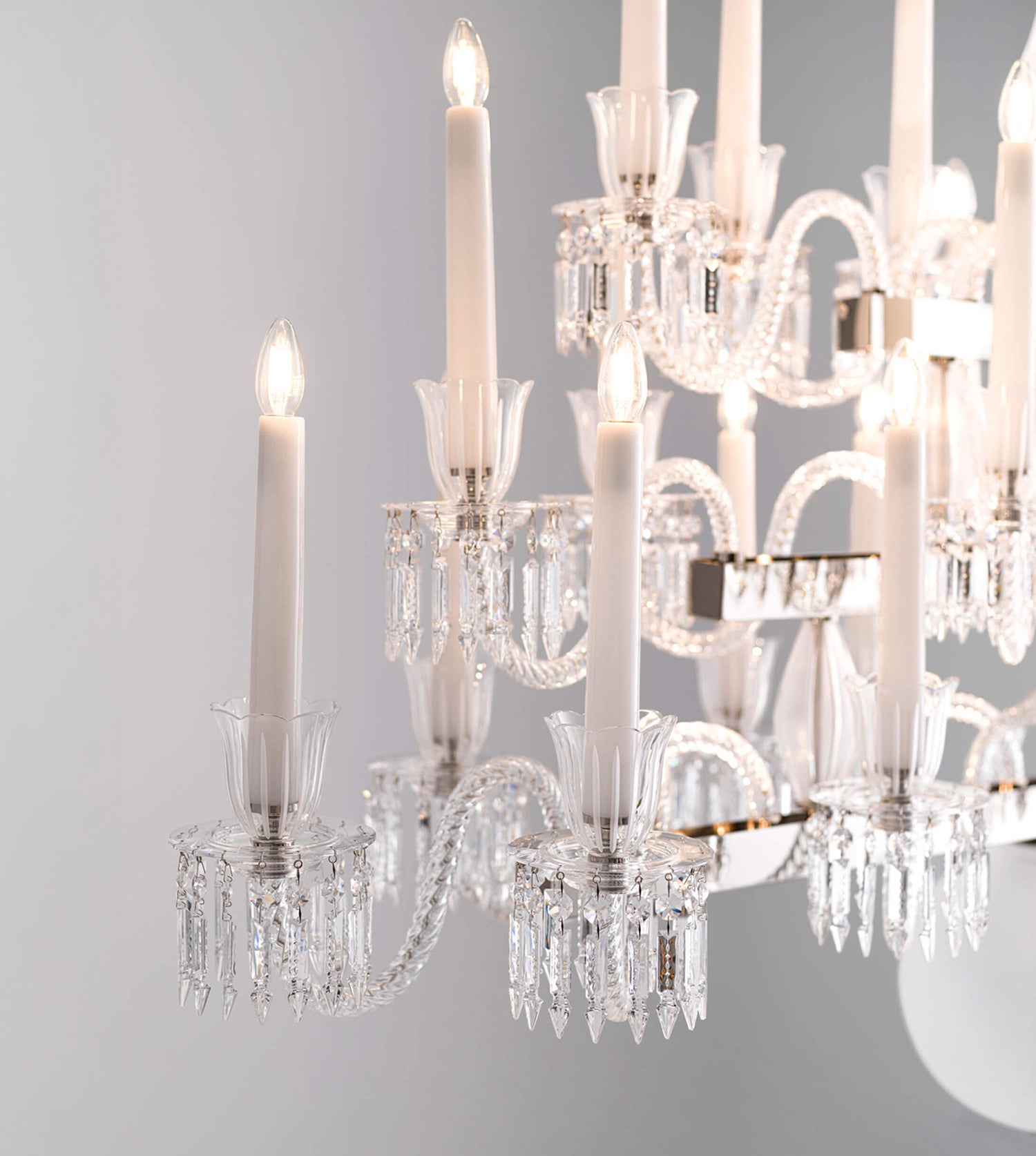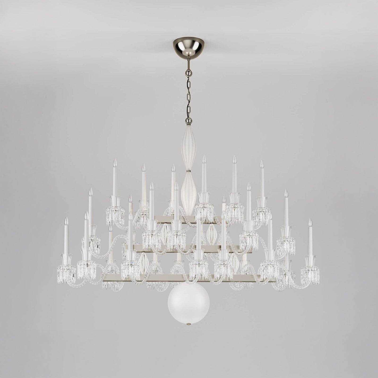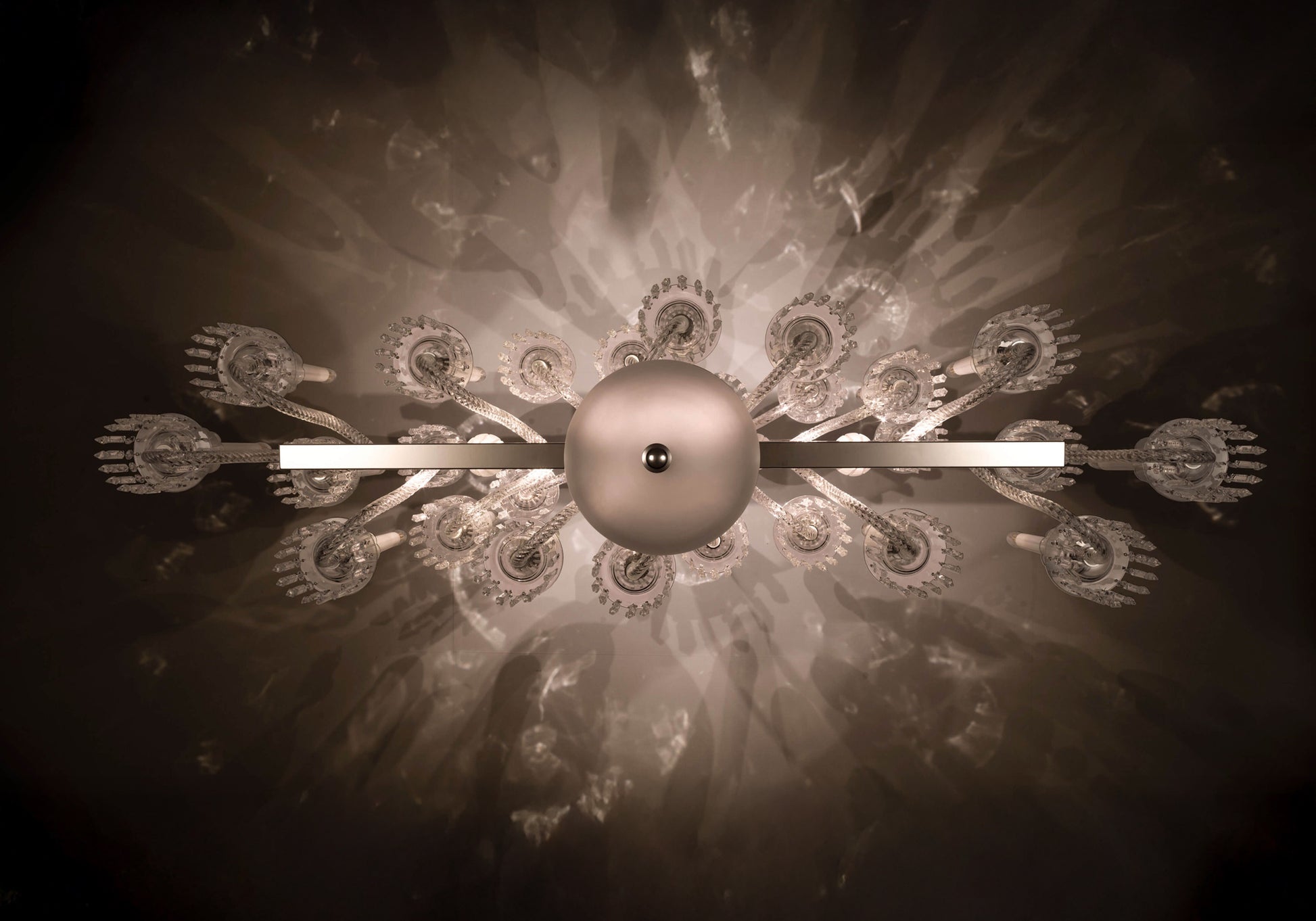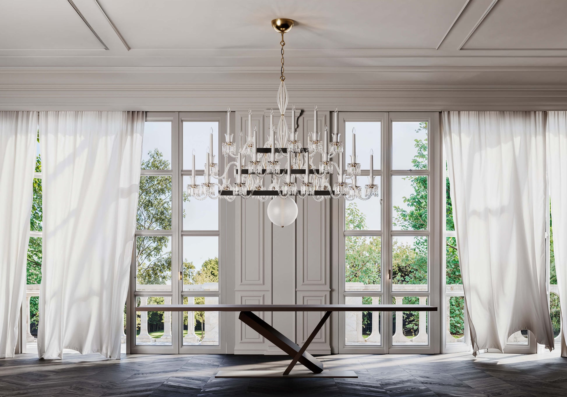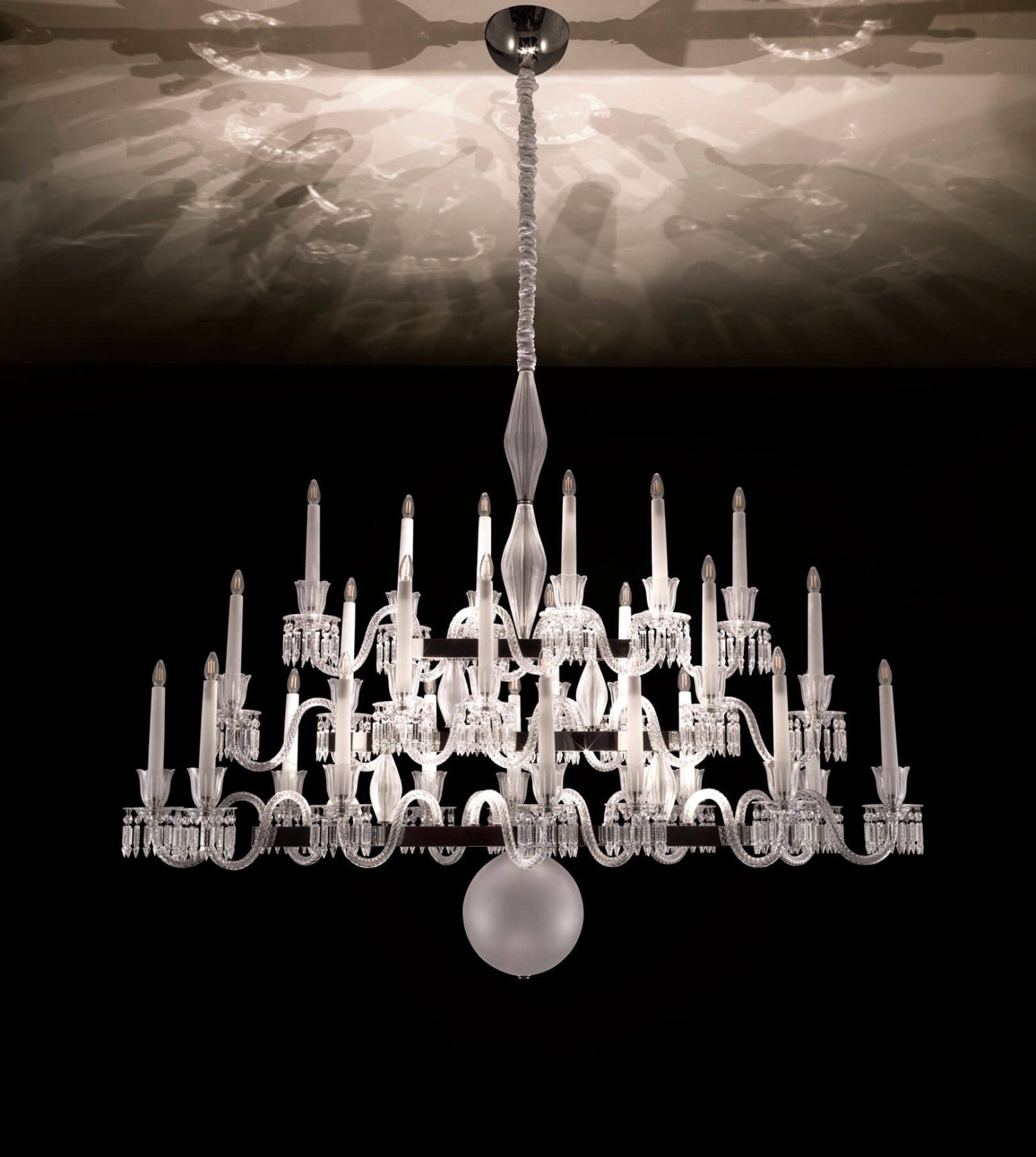 Linear chandelier in etched and clear crystal and glass with metal structure in matte black and light gold or nickel.