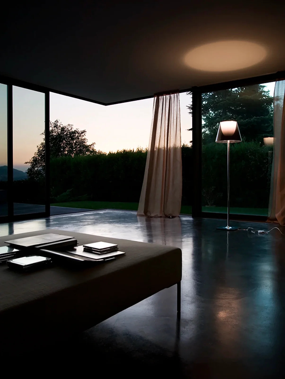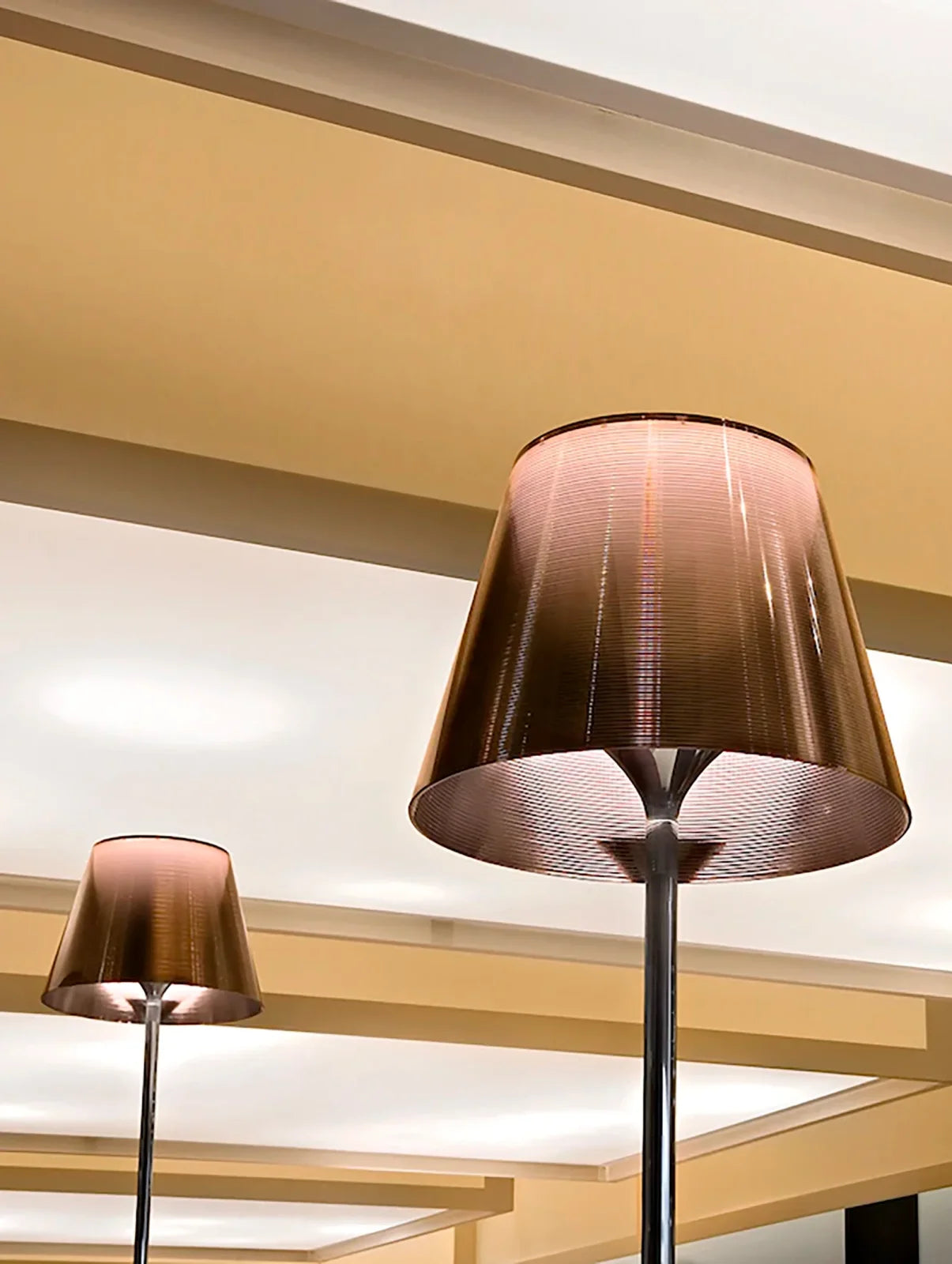 Floor lamp providing diffused lighting. Base, rod support and diffuser support in die-cast, polished and chrome-plated Zamak alloy. Galvanized P04 steel base cover. Injectionmolded PC (polycarbonate) opal inner diffuser and support for the lamp-holder. Outer diffusers in PMMA (polymethylmethacrylate), and silver or bronze on the inner surface, by vacuum aluminum coating. Injection-molded PC (polycarbonate) upper ring, completely transparent diffuser and silver diffuser) or transparent brown for the outer bronze diffuser. On the cable there is the electronic dimmer which allows the regulation of light brightness.