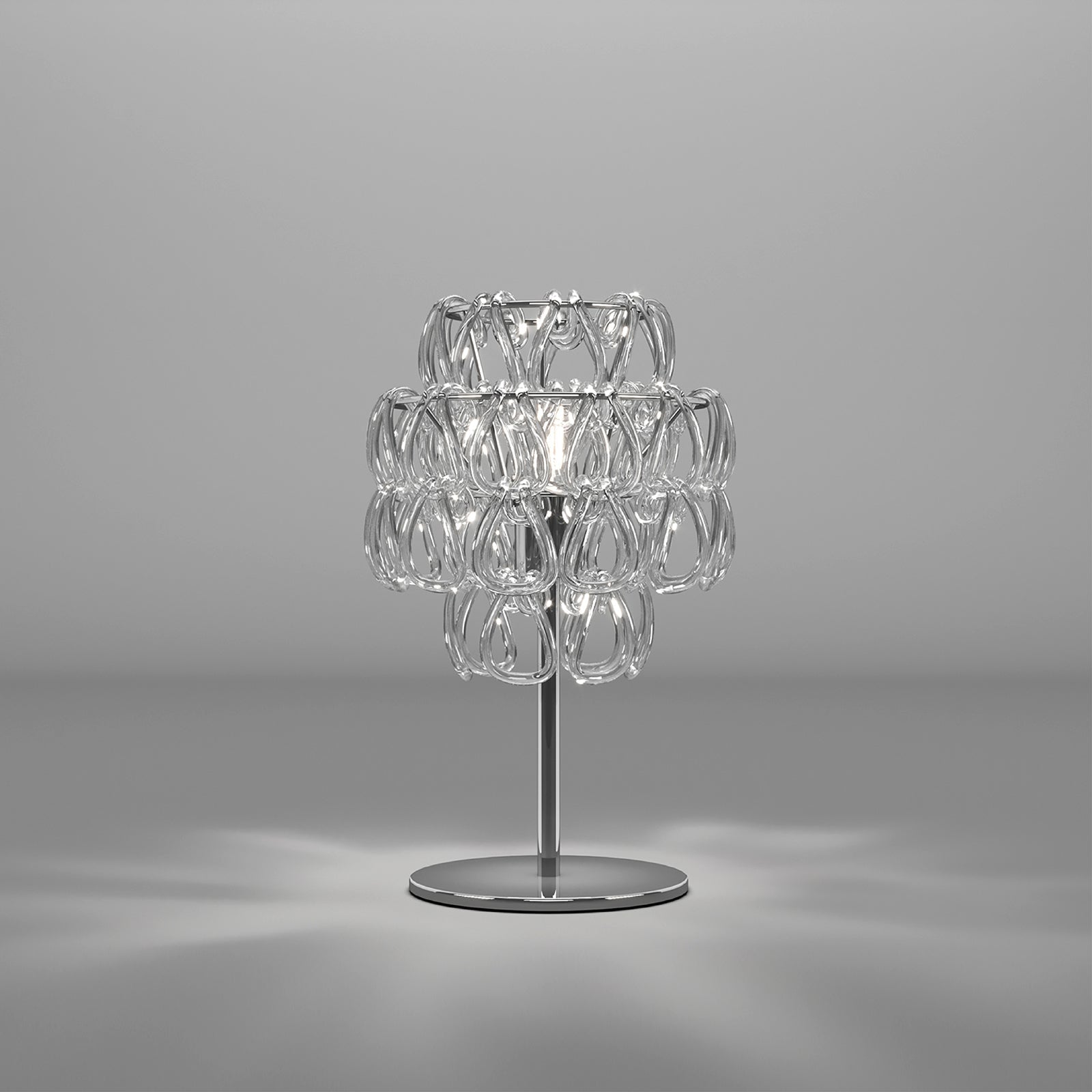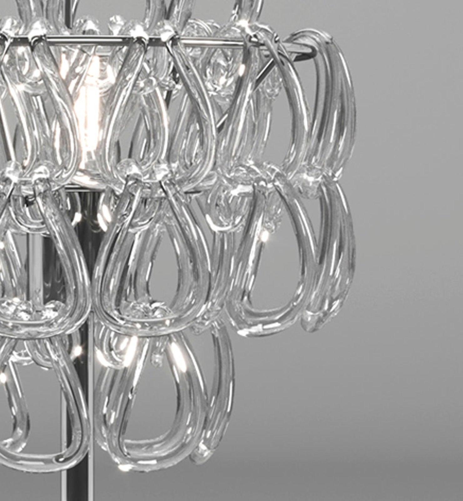 The Giogali lamp (Compasso d’Oro mention in 1969) introduced a new concept in the use of glass: a modular lighting system based on a single hand-crafted crystal element (a type of hook) that can be repeated indefinitely to give life to structures that appear like cascades of light.