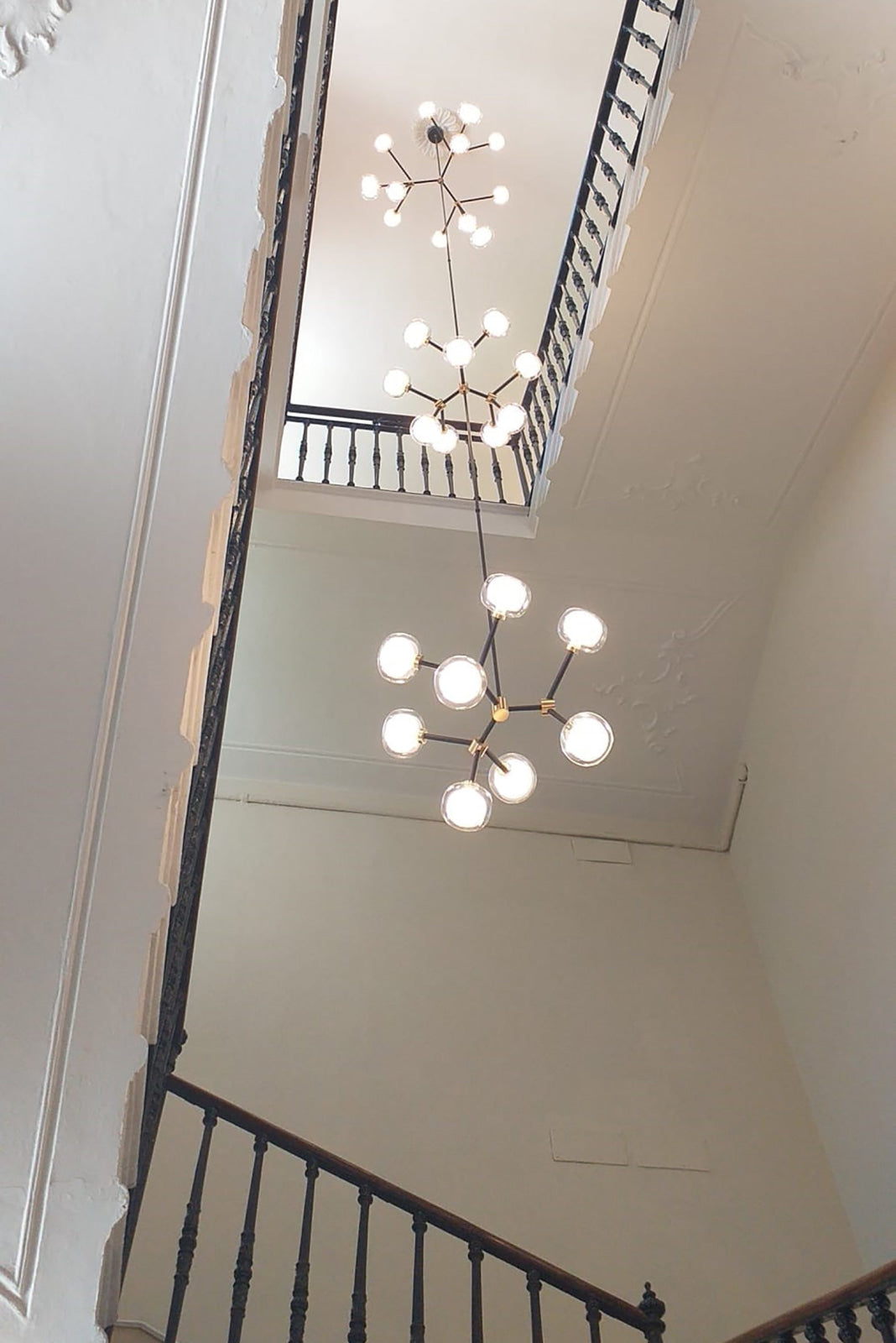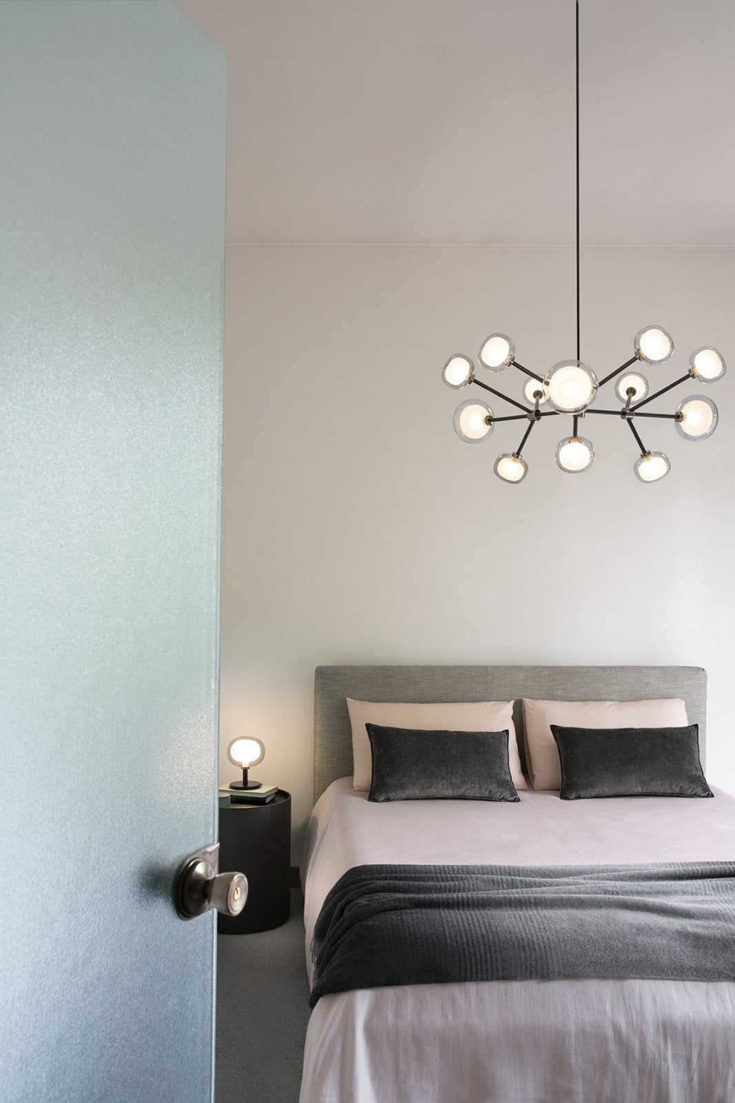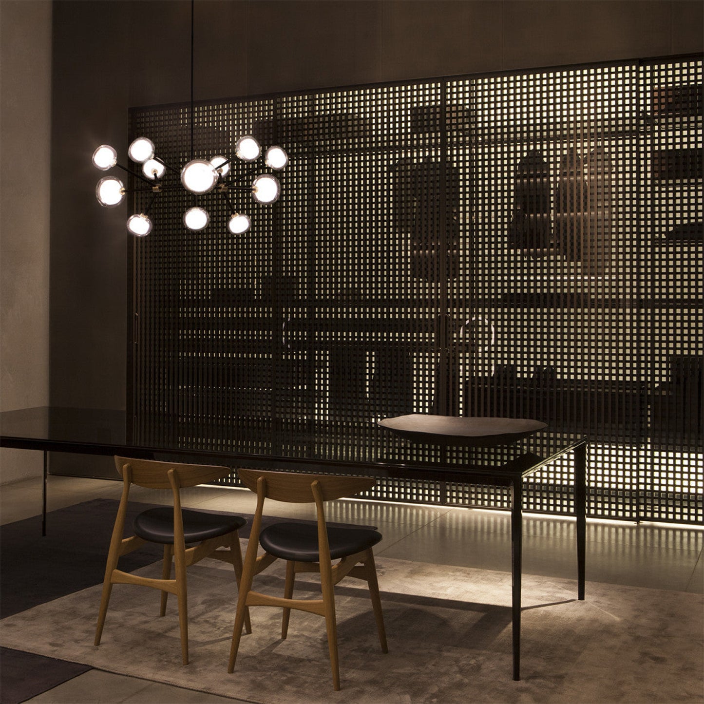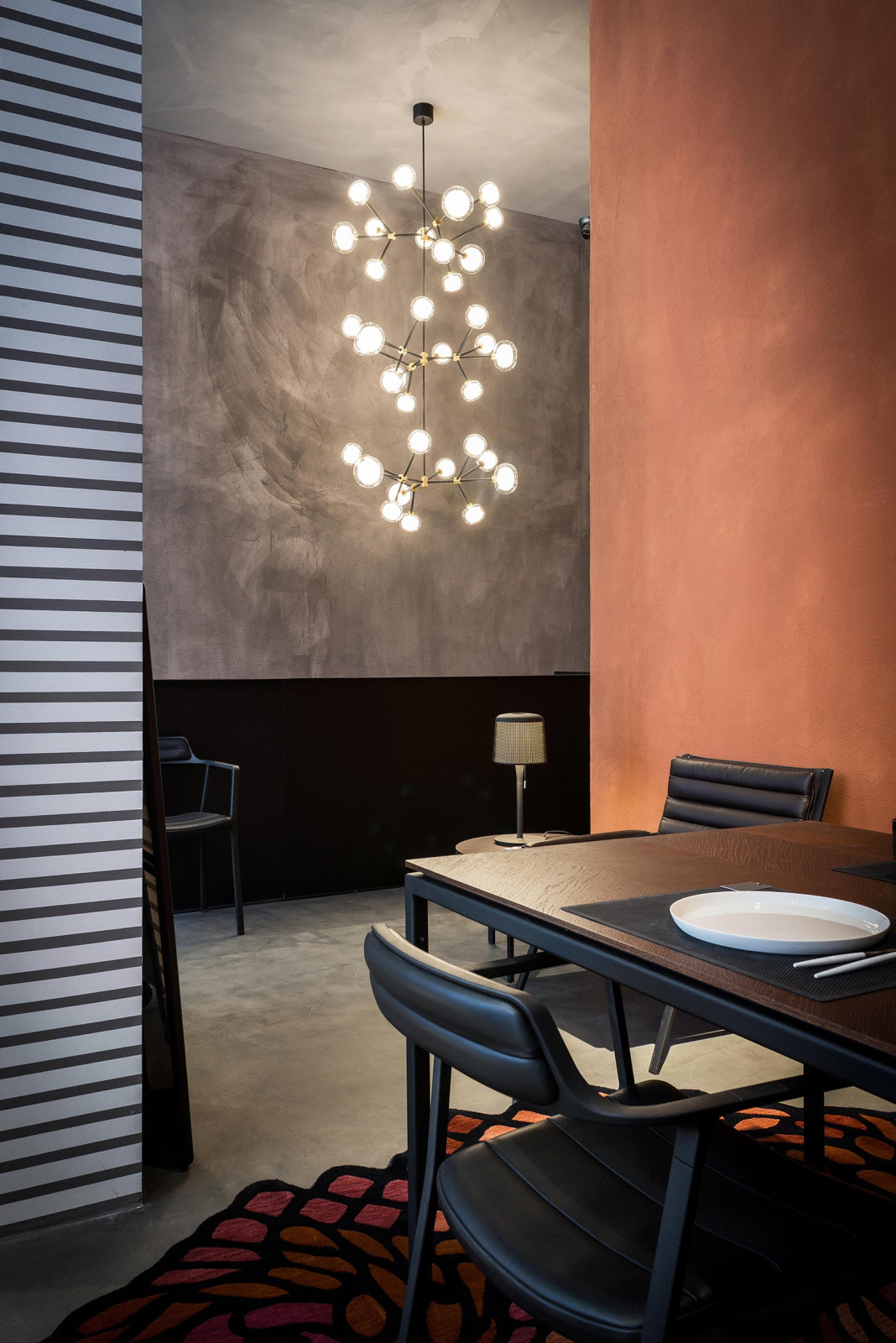 50s inspired collection of elegant and sophisticated lamps representing the detail to enrich any location. A double-sided spherical bright object in borosilicate glass makes these lamps available in different compositions and a structure made by metal coated with epoxy powder enriched with brushed brass or black chrome details. Different varieties are available for any situation: chandeliers (in five different models) or table lamp, bedside (smaller), floor or wall (available in three different models for single or composite personalized installation). Richness and sobriety all in one single element.