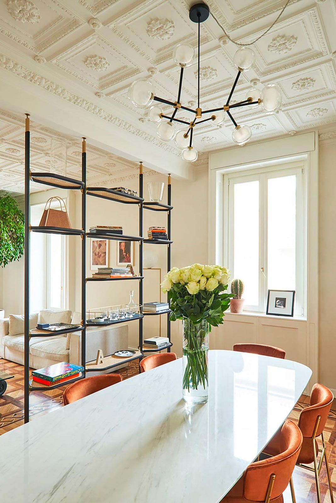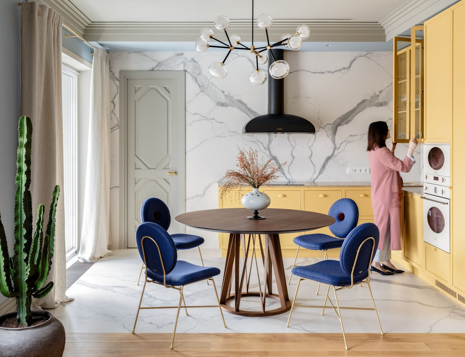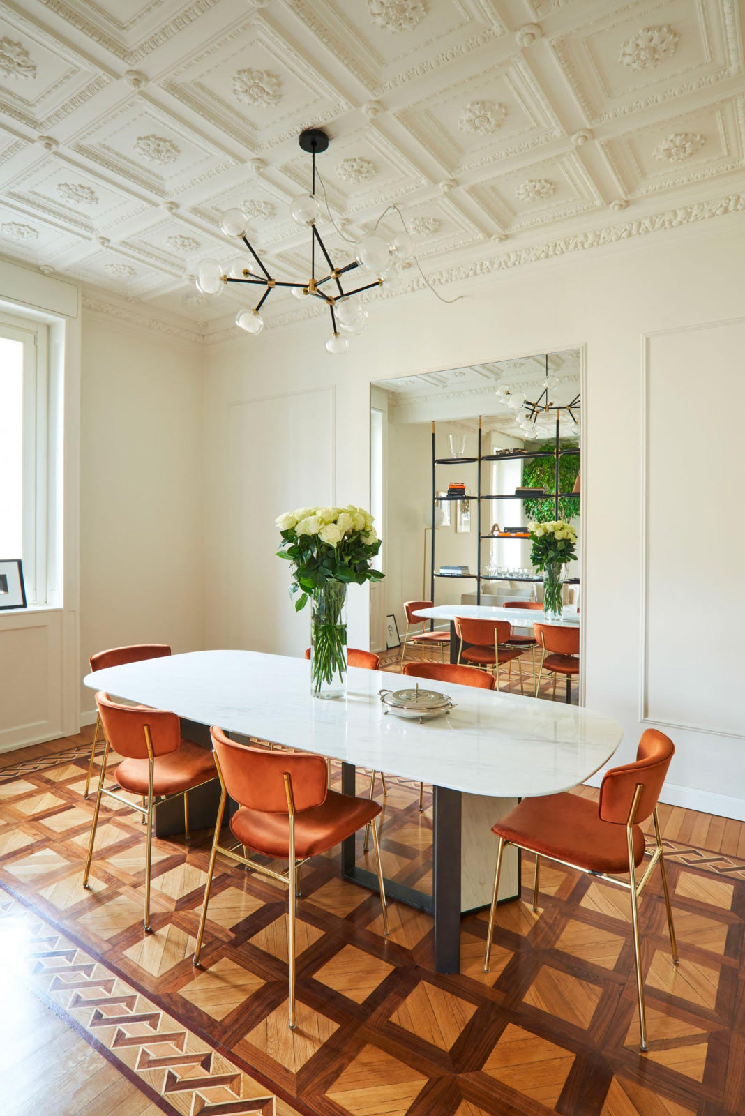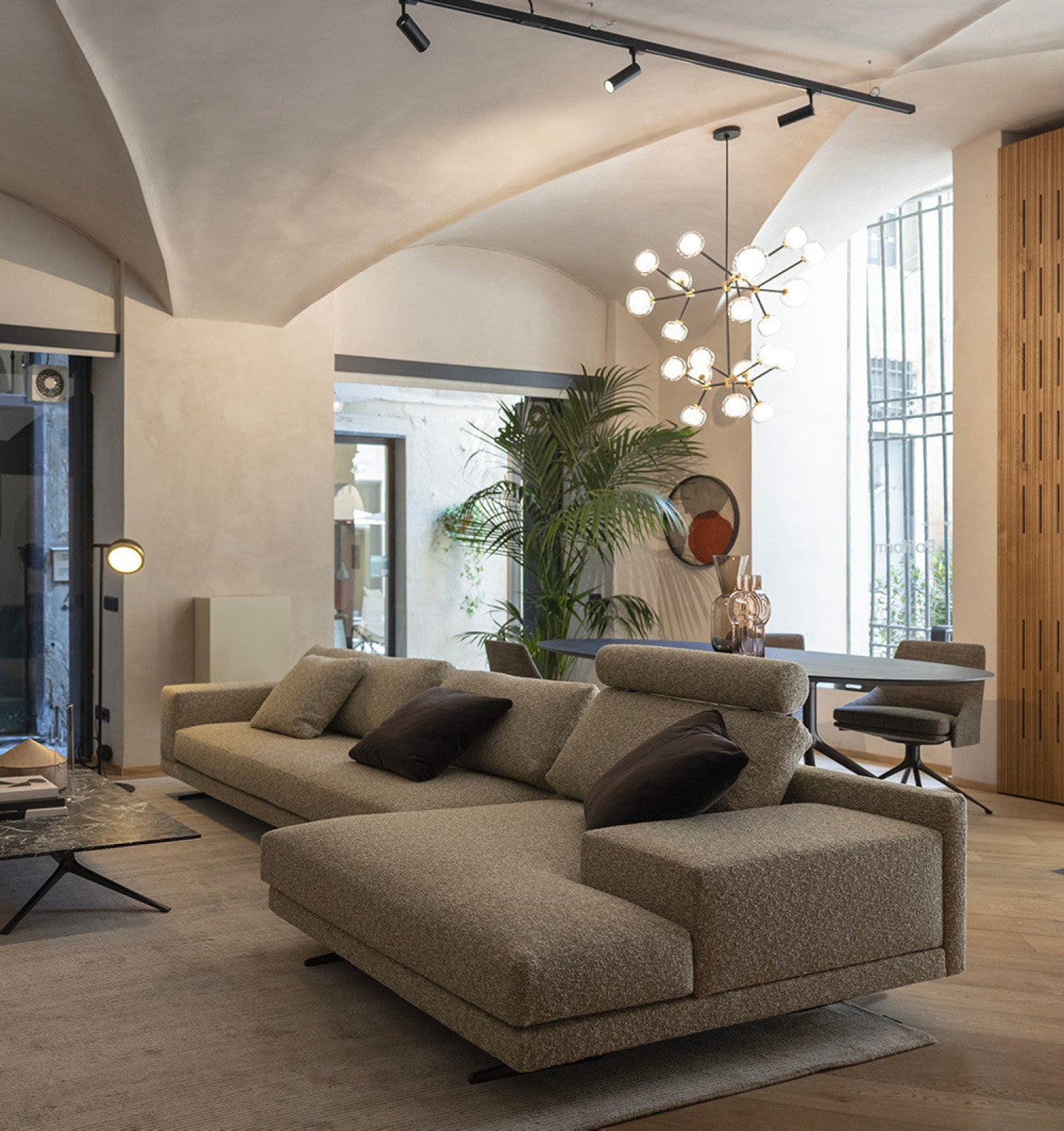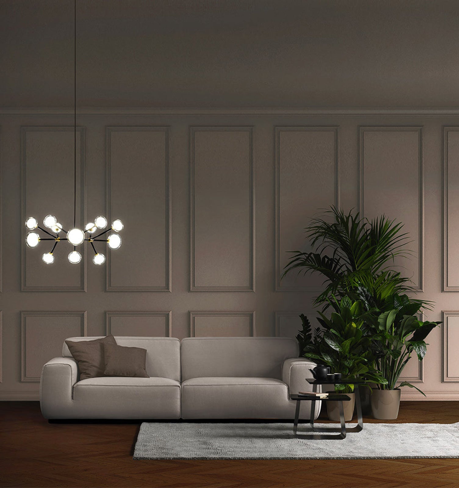 50s inspired collection of elegant and sophisticated lamps representing the detail to enrich any location. A double-sided spherical bright object in borosilicate glass makes these lamps available in different compositions and a structure made by metal coated with epoxy powder enriched with brushed brass or black chrome details. Different varieties are available for any situation: chandeliers (in five different models) or table lamp, bedside (smaller), floor or wall (available in three different models for single or composite personalized installation). Richness and sobriety all in one single element.