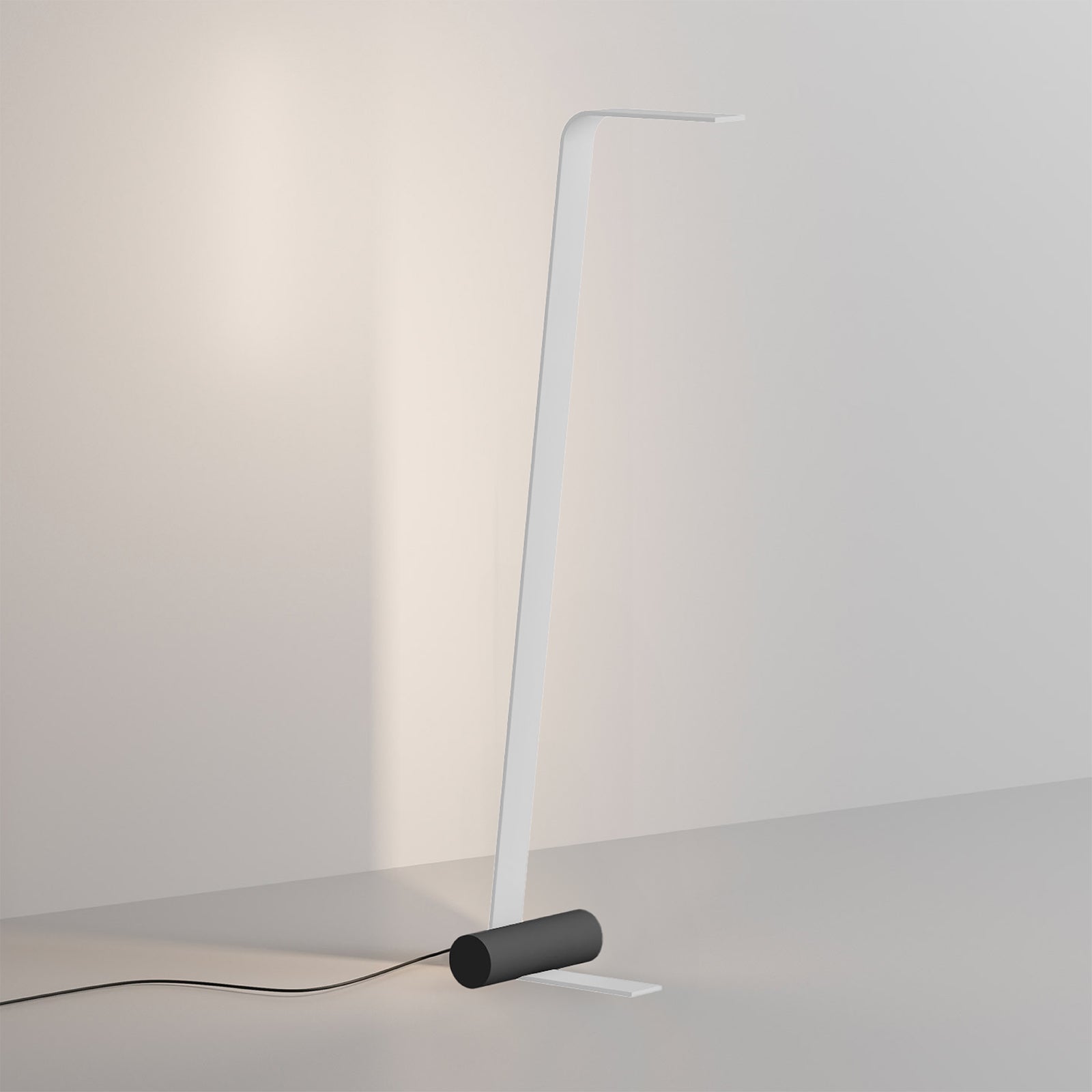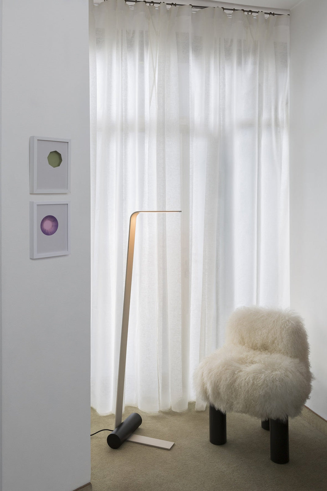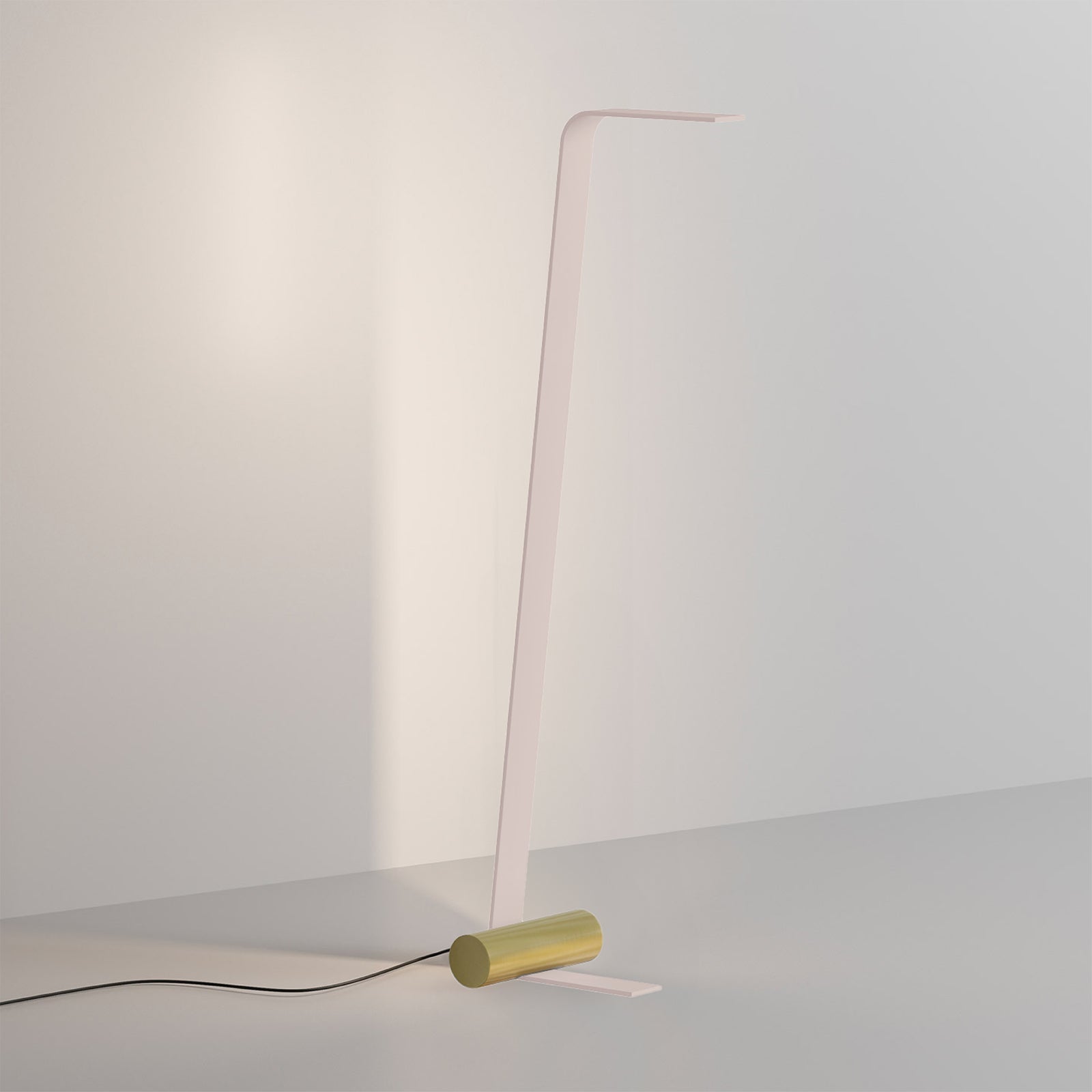 The Nastro collection of suspension, wall, floor and table lamps designed by Studiopepe sees an epoxy powder coated aluminum band structure accompanied by a cylindric weight that counterbalances its flexuosity, in a refined visual balance. The light source consists of a dimmable LED strip; the cylinders are available in epoxy powder coated metal, in wood, in brushed brass and in raw concrete.
