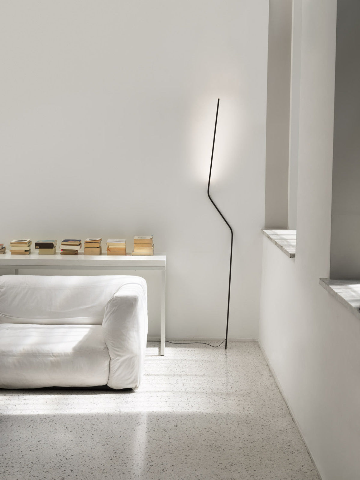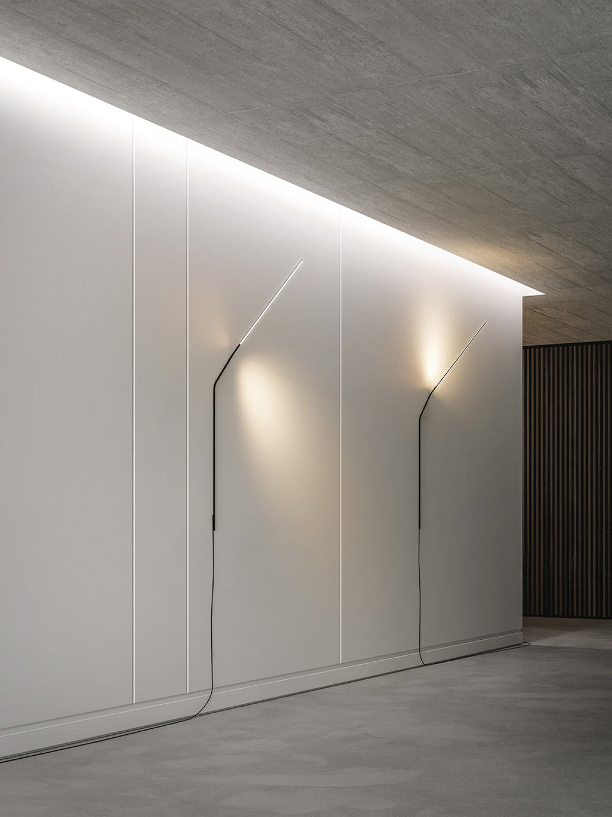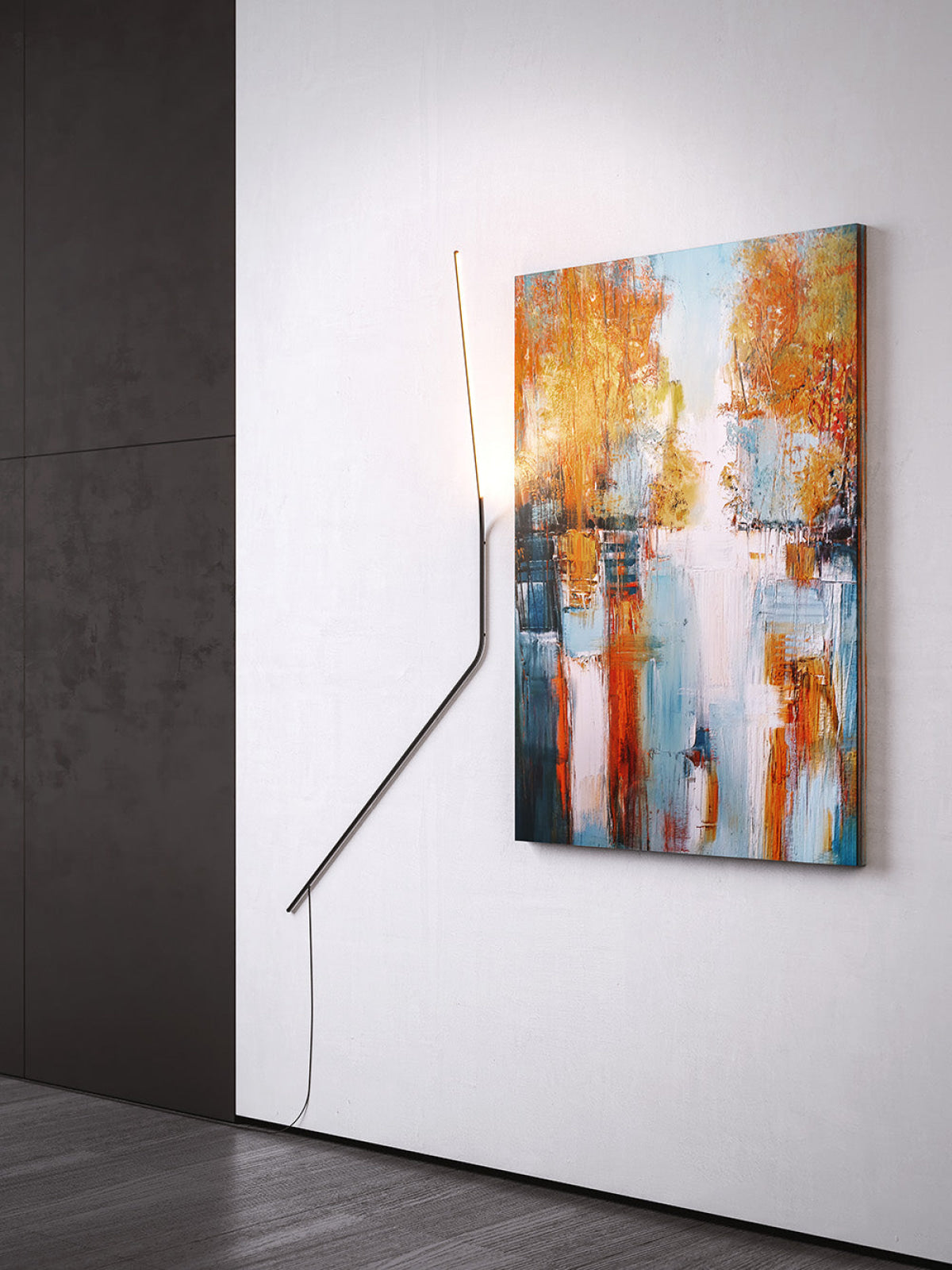 Neo is inspired by the aesthetic reduction of articulated arms. Clean design and functionality interact with the space: the lamp adds movement to the room by leaning against the wall, which both supports it and spreads the light.