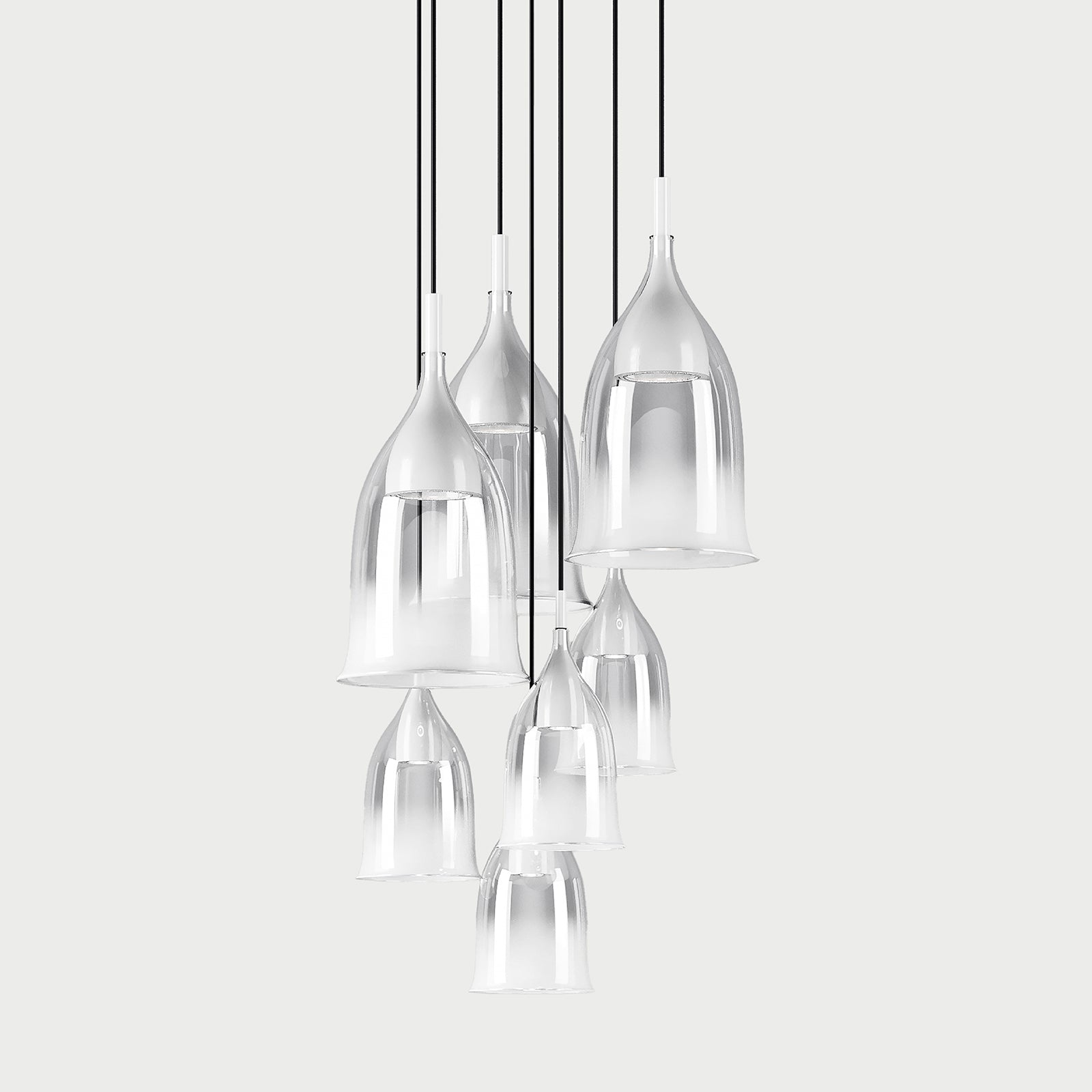 Nola is a suspension characterized by a blown glass lampshade in the shape of a bell and an internal metal diffuser that recalls the same shape.