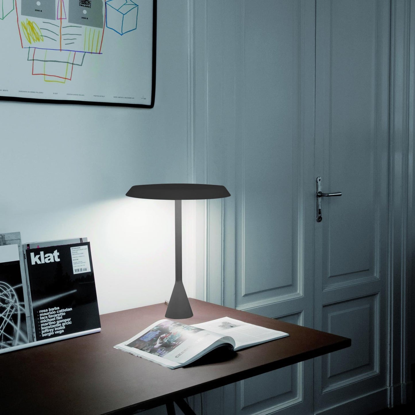 Panama combines a clean, linear silhouette with a cone-shaped base, a slim stem and a flat lampshade. Made of methacrylate, they are equipped with a polycarbonate reflector with anti-glare treatment and are therefore suitable for both domestic and work environments.