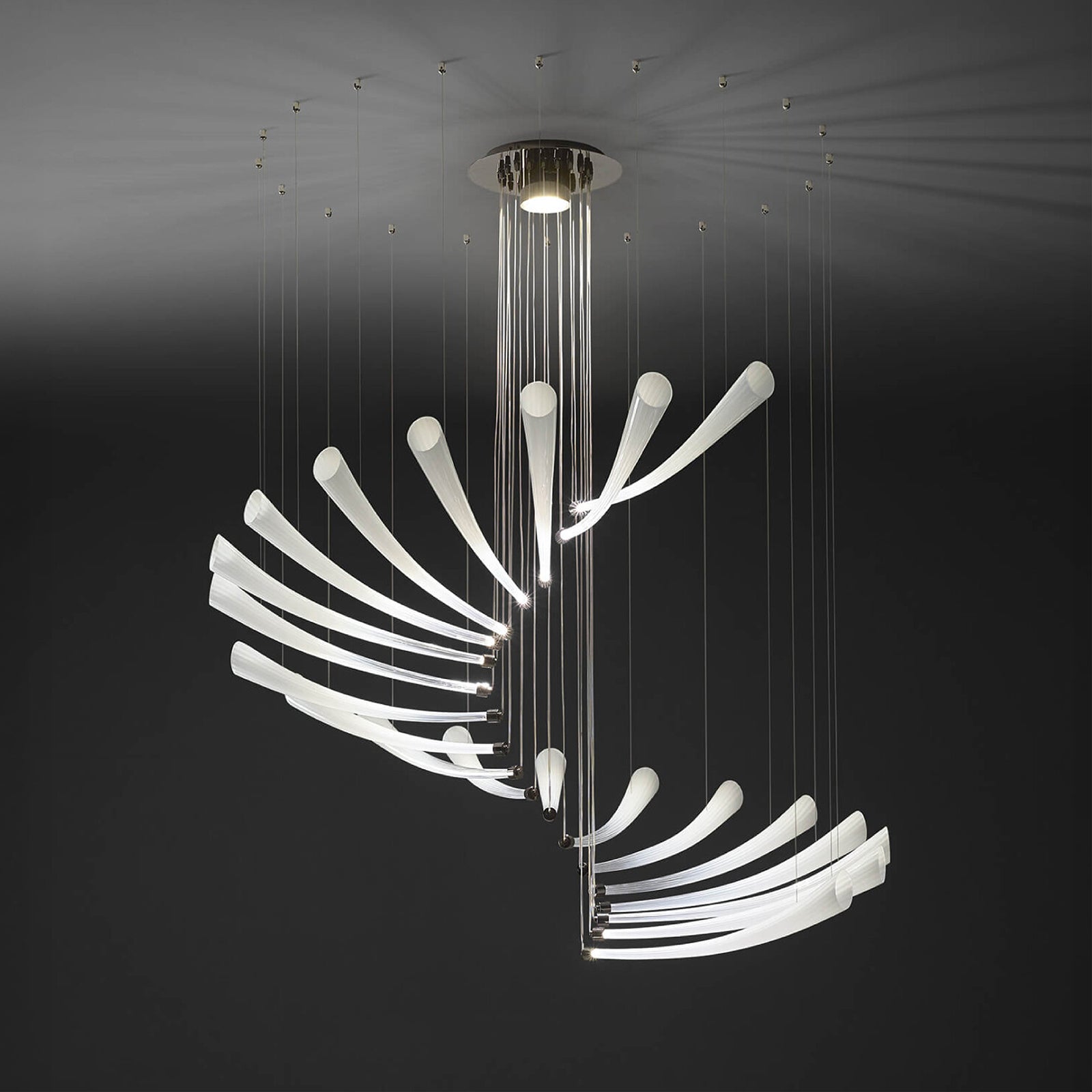 Ethereal and majestic, Pulsa Spira represents in the form of light the twirling of a maple seed in the air. The blown glass elements are arranged in a spiral and diffuse the light from LED sources and thanks to it Pulsa generate suggestive plays of light and shadows.