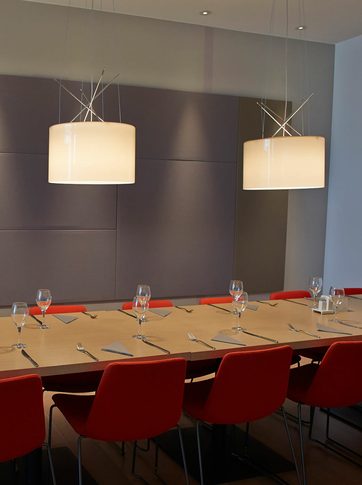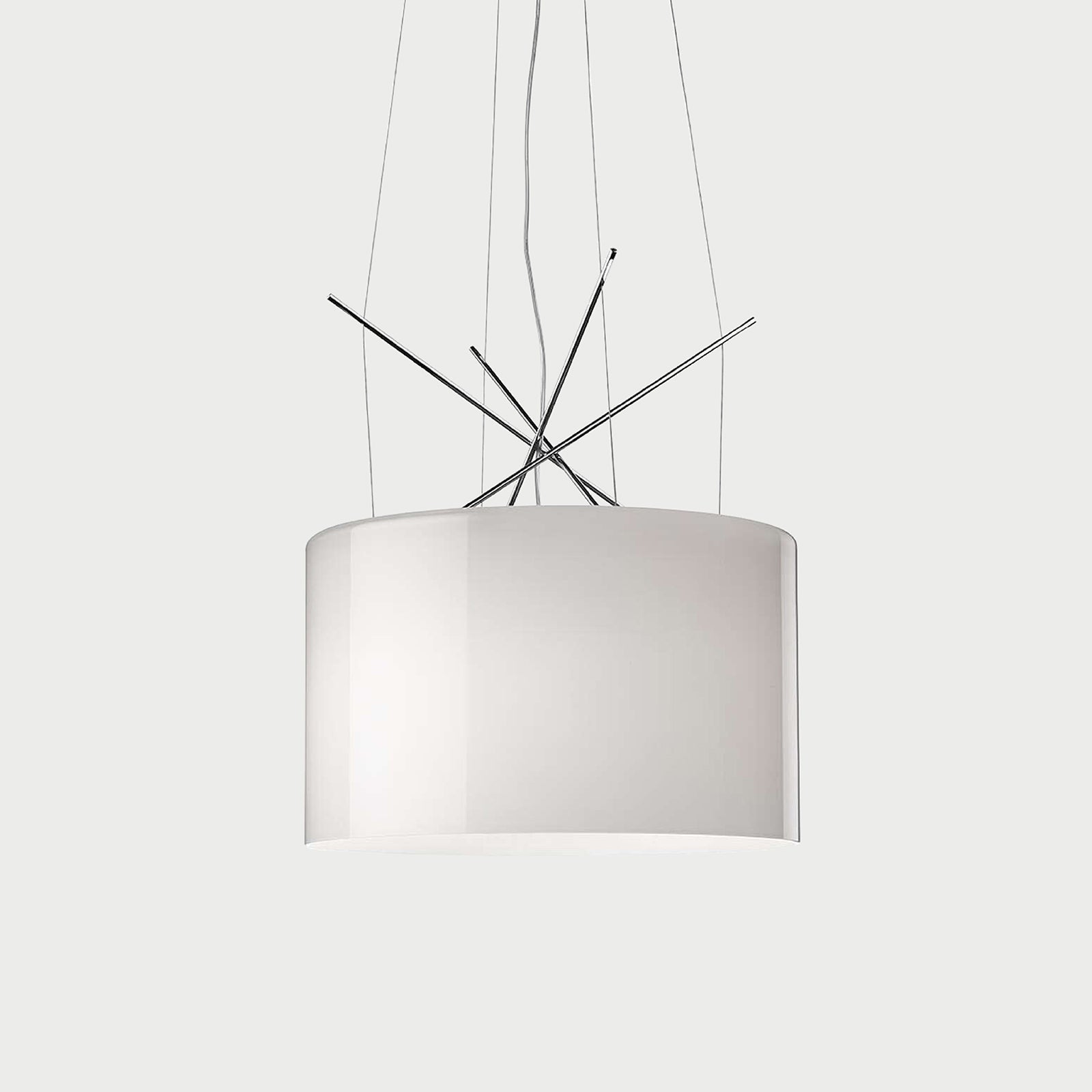 Suspension lamp providing direct or diffused lighting. Chrome-plated metal structure and lathe-shaped aluminum diffusers, blown and overlaid glass with glossy external finish. Opal blown glass inner diffuser. White painted steel ceiling attachment protected with transparent paint, and polished aluminum cover.