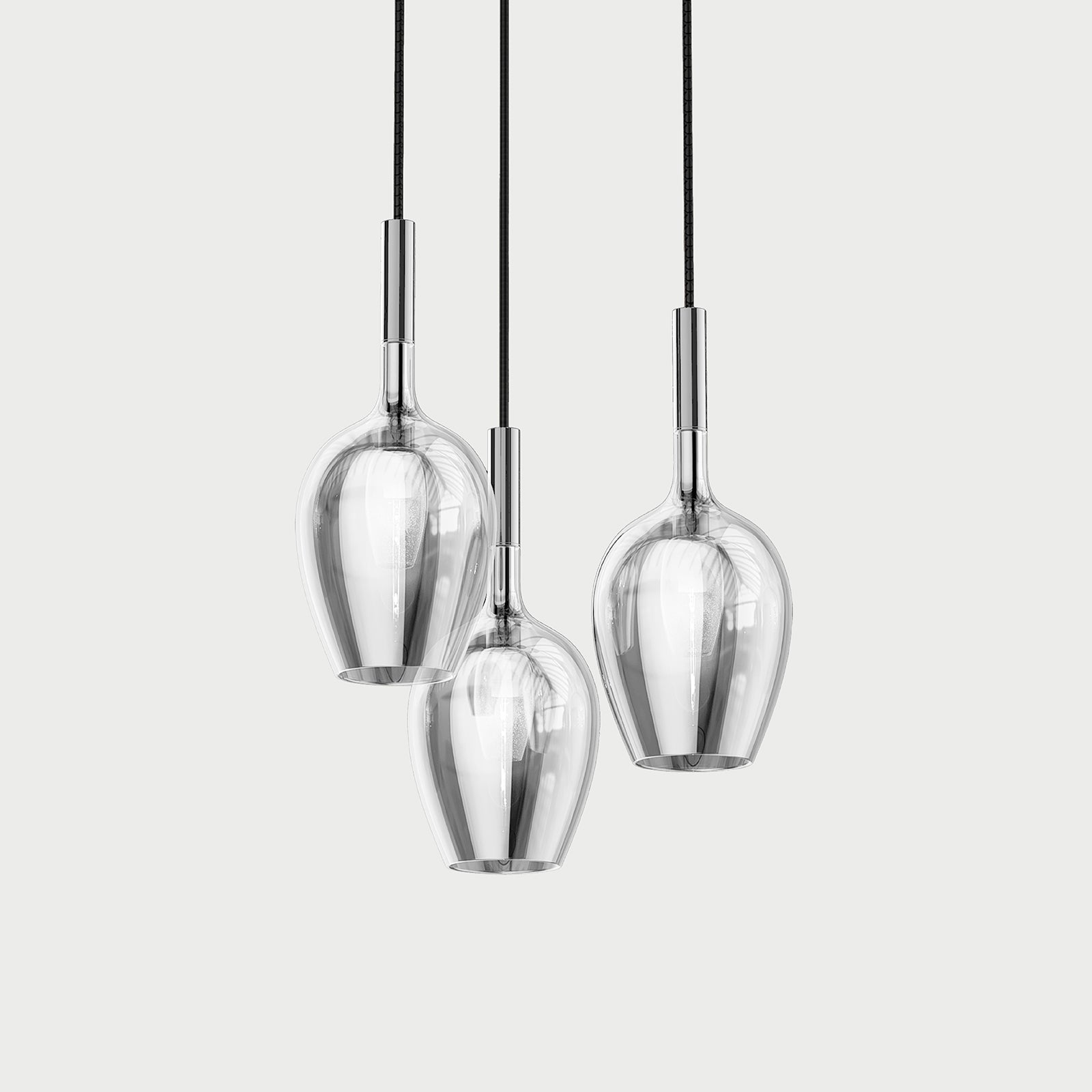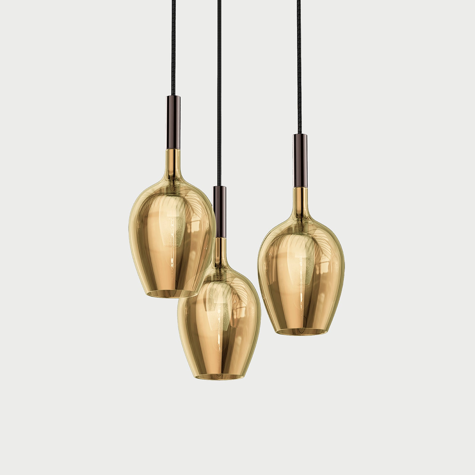 Suspension lamp with rose gold, gold, titanium and transparent shiny coating glass diffusers and metal structure with iron grey, gold or chrome finish.