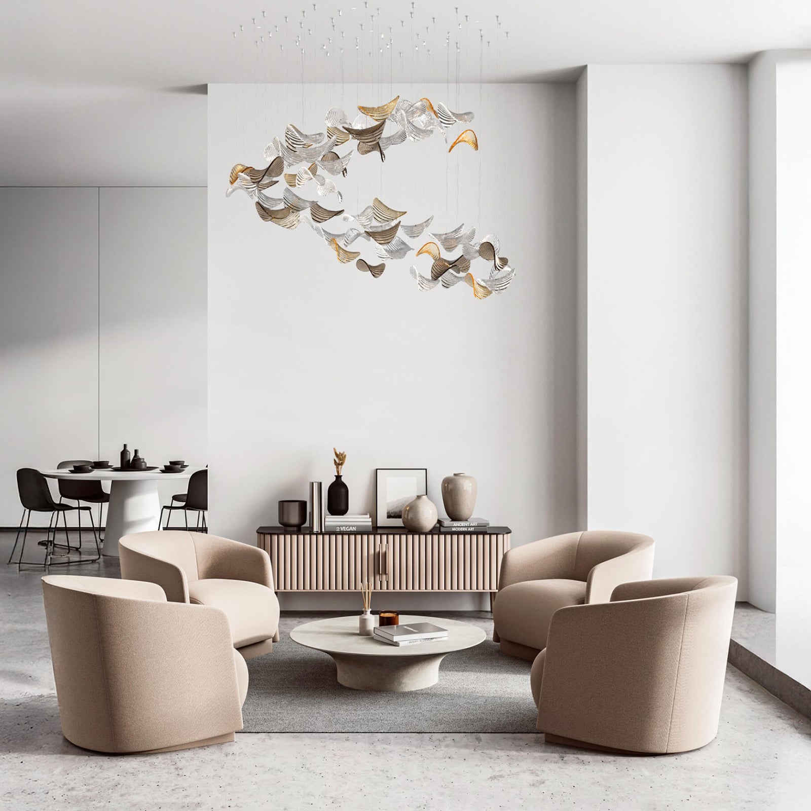 Sella brings an aura of elegance and movement. This composition creates lightness and dynamism, enriching the environment with light signs and fluid signs. The light reflects to the glass creating a kaleidoscope of shapes and reflections.