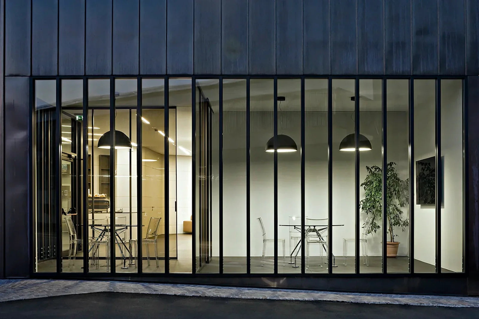 Suspension luminaire providing diffused lighting. Hemispherical, mechanically-processed cast plaster diffuser, painted white inside. Outer finish: rust, glossy black, glossy white or matte gold. Plaster diffuser support in die-cast aluminum alloy, liquid-painted white. Molded upper bushing in die-cast, polished aluminum alloy, protected with transparent paint on the entire visible part. Upper cable gland and blocking ring nut in black injection-molded PC (polycarbonate). Shaped, galvanized adjustment screws. Transparent, injection-molded, upper and lower silicone shock absorbers. Lamp holder and fixing support in black injection-molded PPS (polyphenylene sulfide). Flashed and blown opal glass diffuser. Molded fixing ring nut in die-cast aluminum alloy with alodine plating. Skygarden 1 frieze in photo-etched and mechanically drawn AISI 304 steel. Molded and galvanized steel ceiling attachment Gray, injection-molded PA6 (Nylon) rose.
