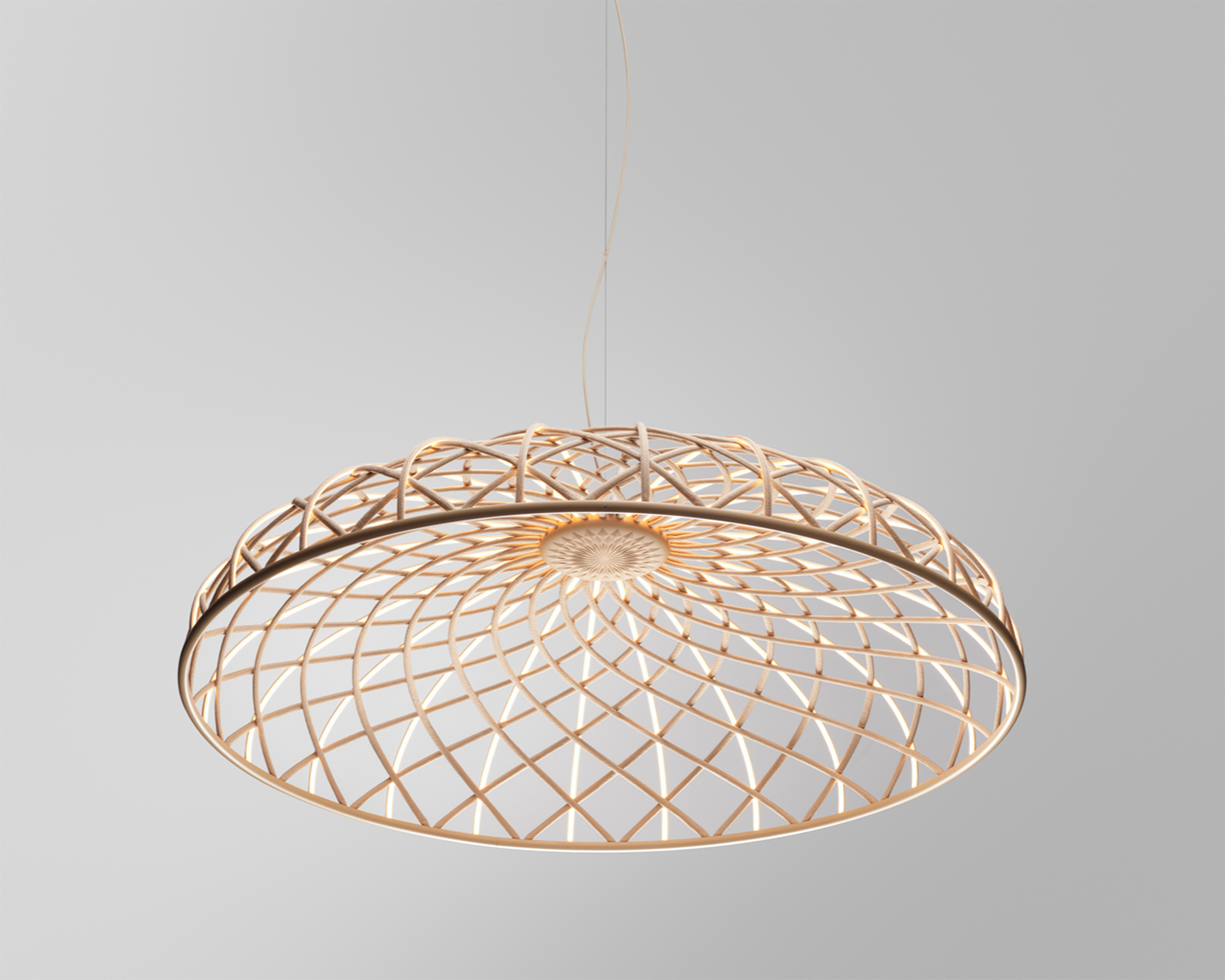 Skynest is the newest creation by Marcel Wanders studio for Flos. By weaving filaments of light, this unique lamp seamlessly combines both elegance and technical innovation. Skynest has the typical pendant light shape, with a central core and with what, at first glance, looks like a lampshade. The light, however, is not emitted by a bulb or by an LED board, but by the elements that form the structure of the lampshade: LED strips covered in fabric. Delicate textile tubes, integrated with LED lights, reminiscent of thread, are woven throughout the design of the lamp, creating a unique element of surprise, which challenges the bulb lighting archetype.
