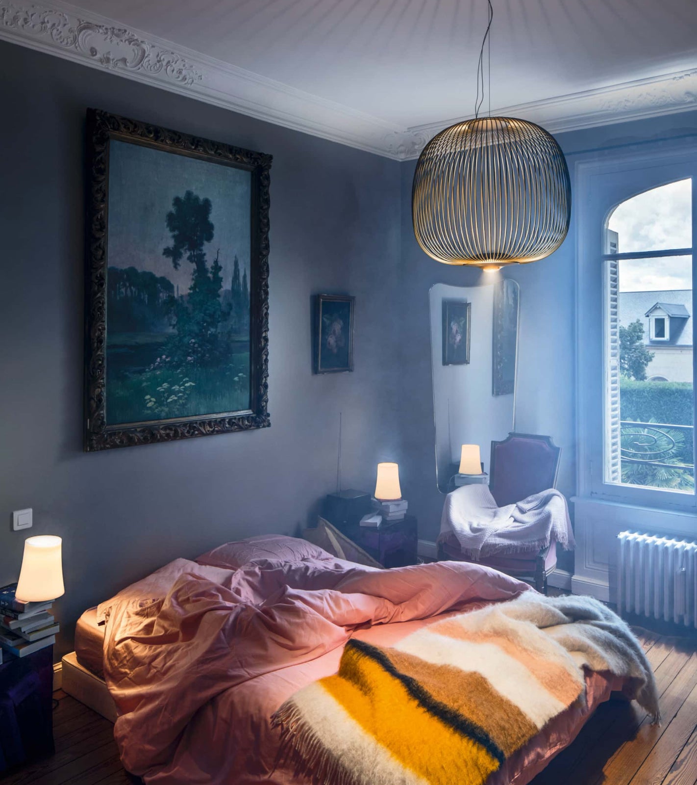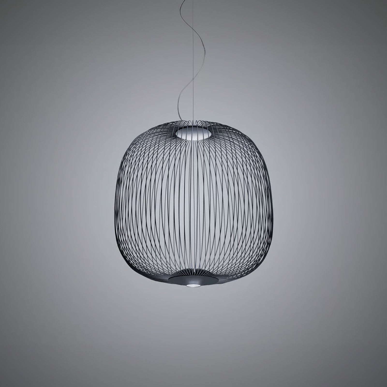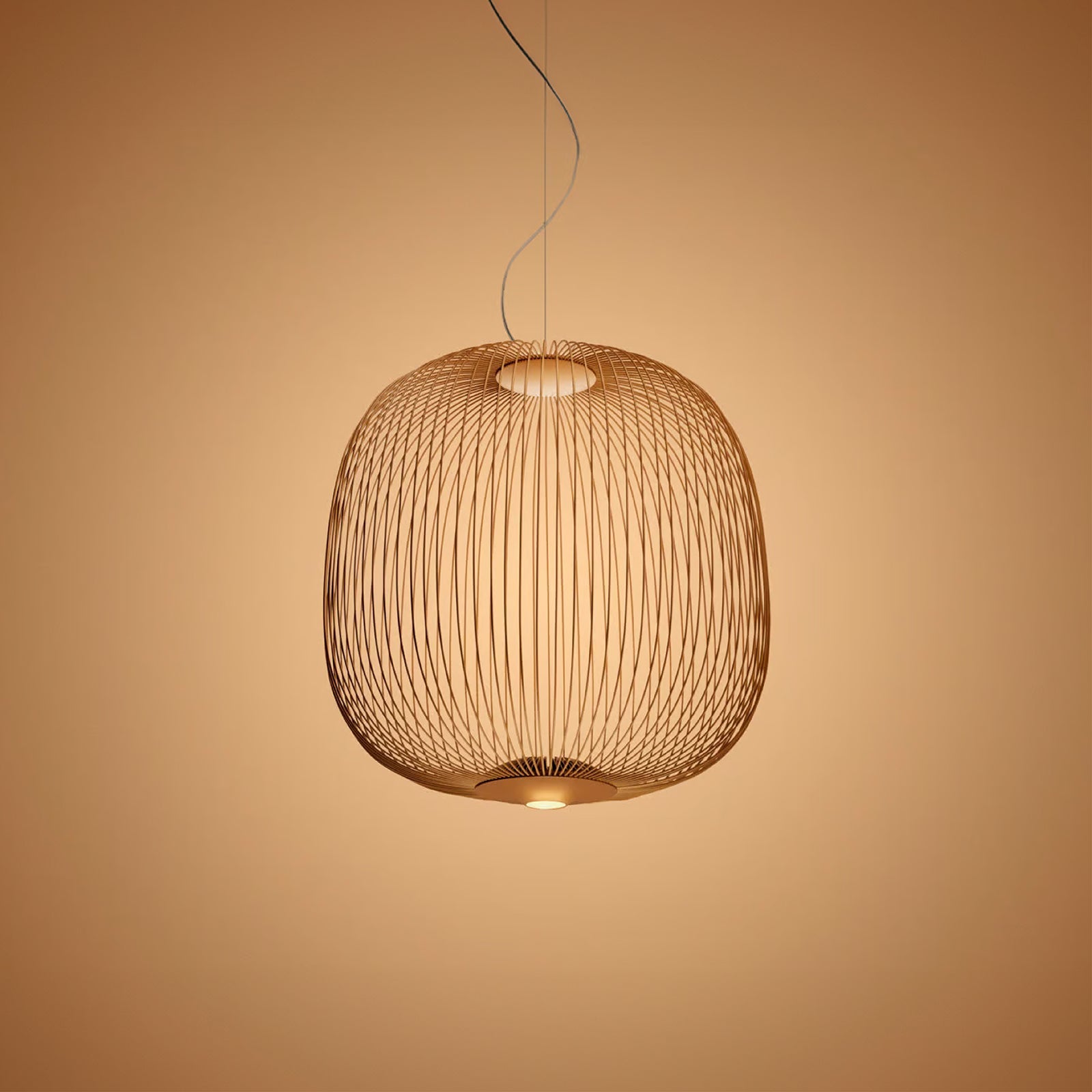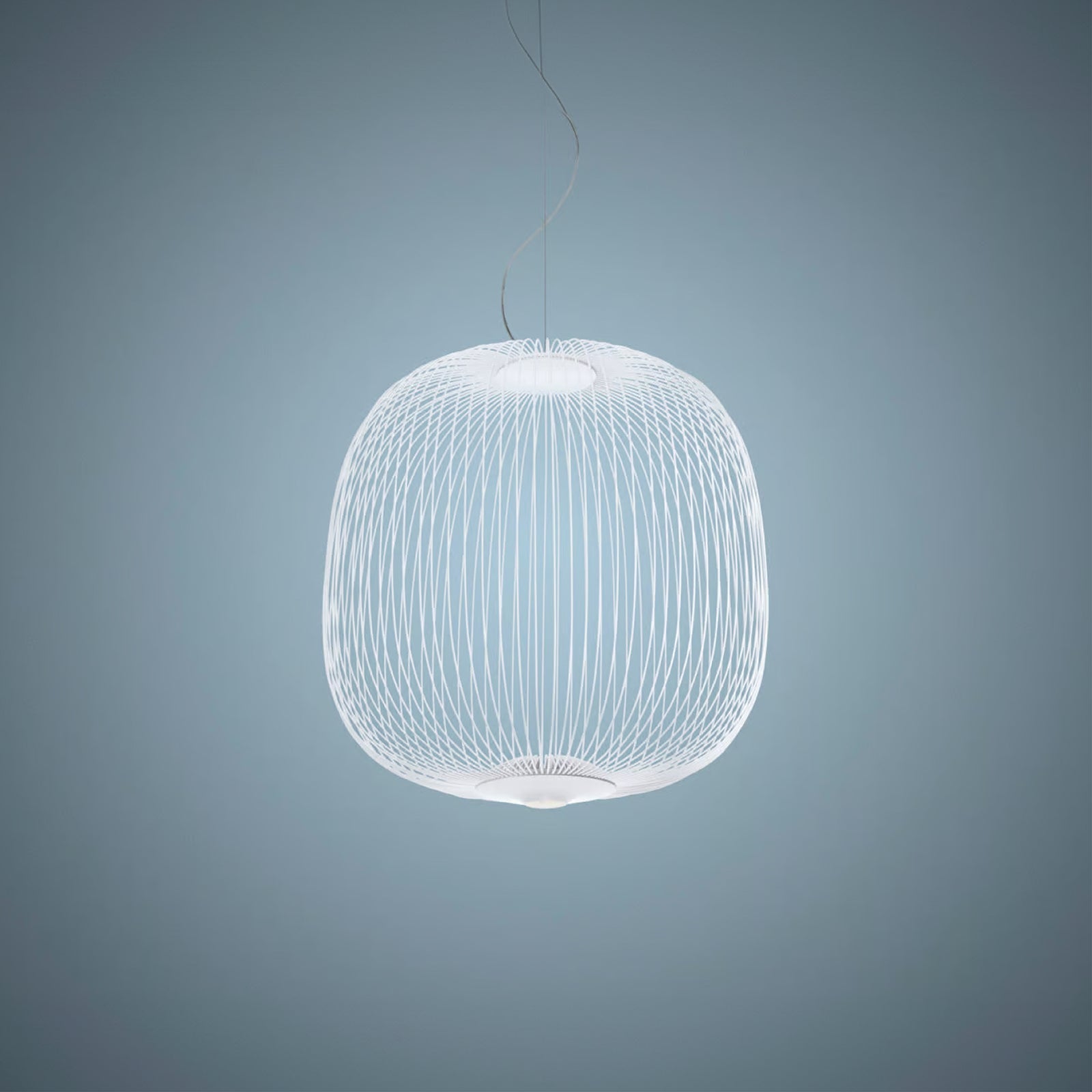 Spokes expresses a feeling of light weight and motion. As if crossing a magical and geometrical mesh, the light filters out from the inside, projecting a kaleidoscope of blocks and voids. The shape of the Spokes 2 suspension lamp recalls a lantern or an aviary.