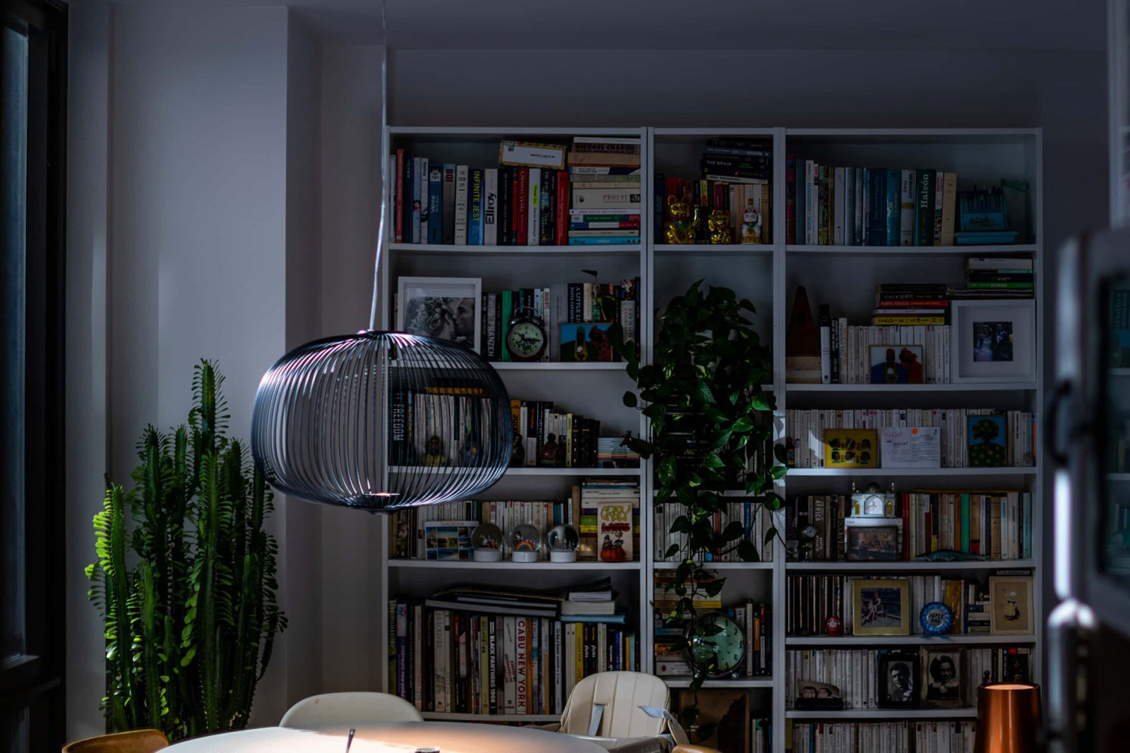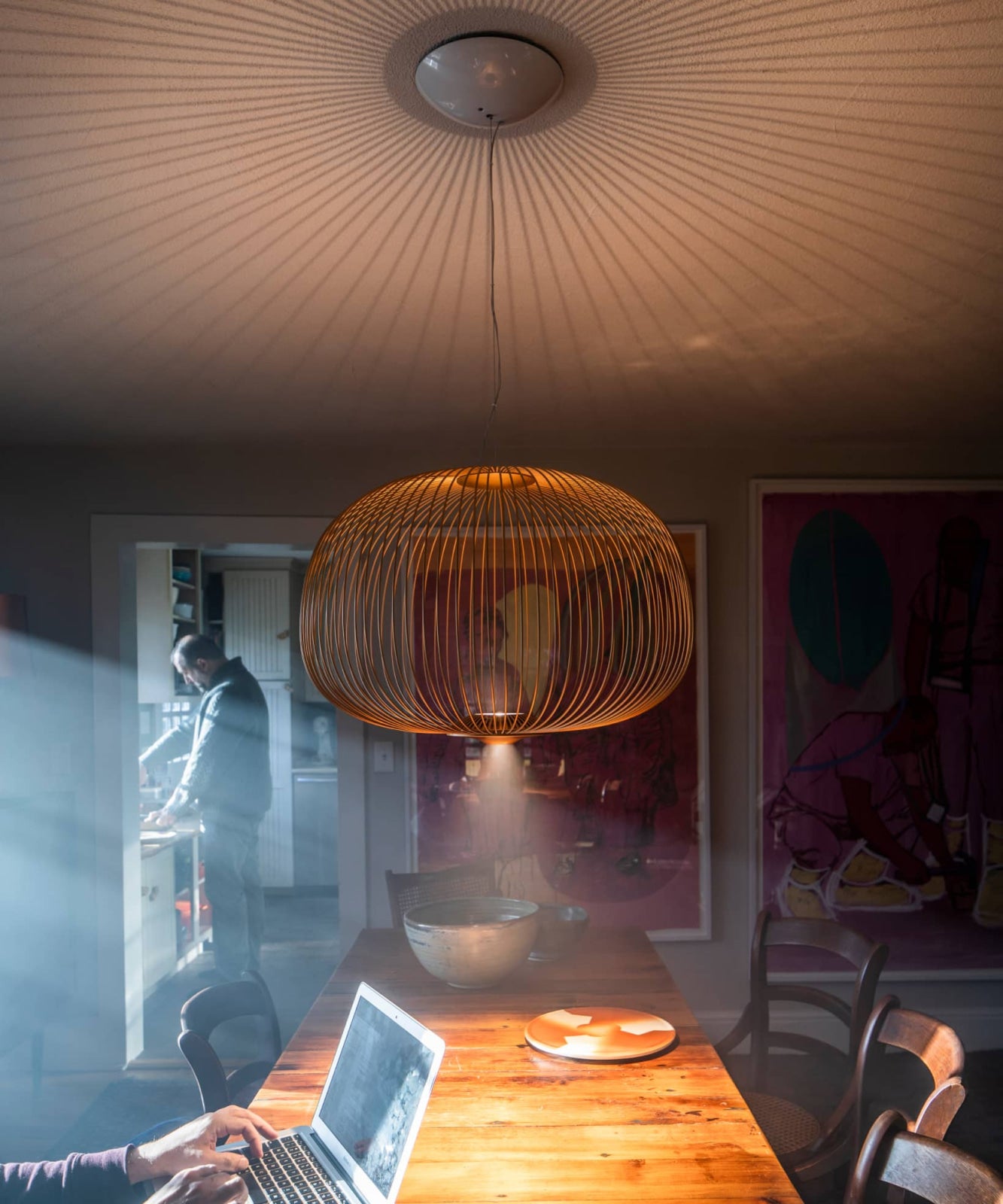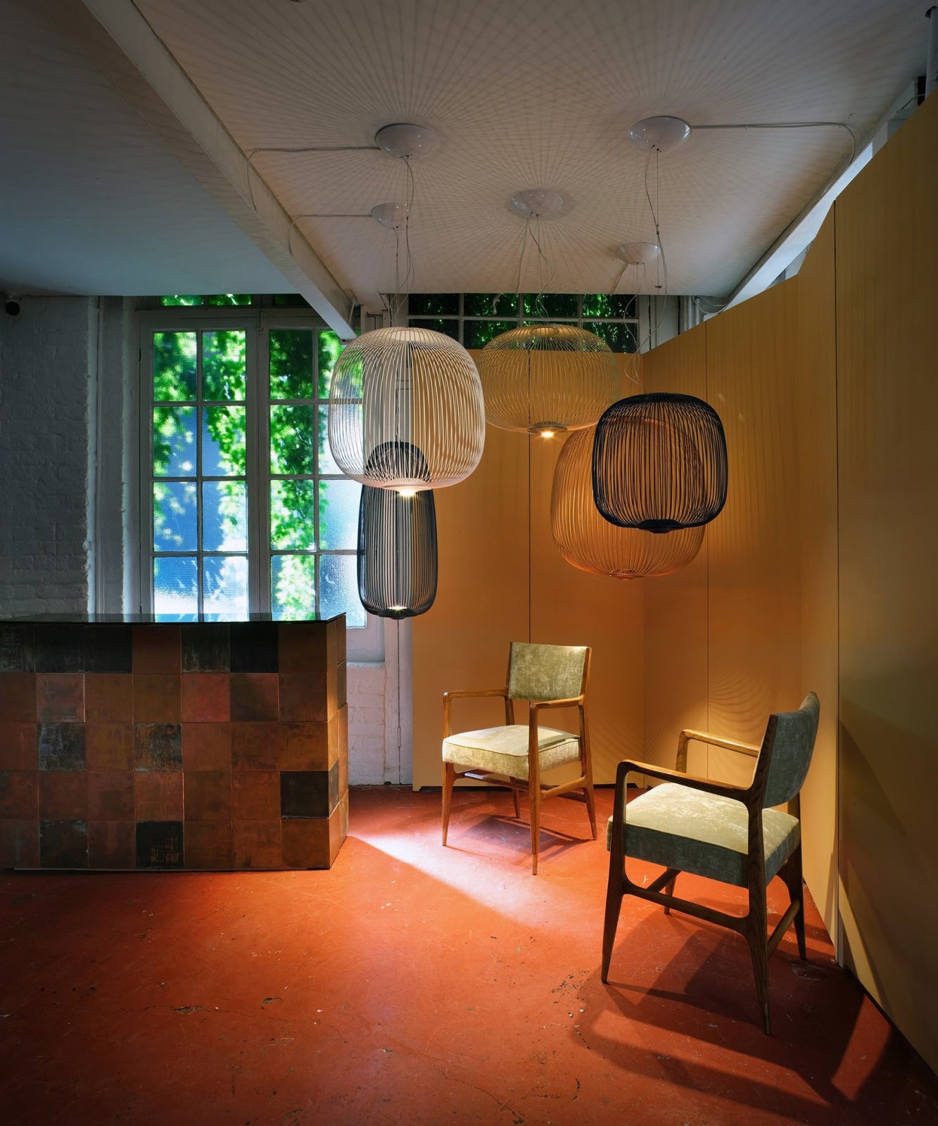 Spokes expresses a feeling of light weight and motion. As if crossing a magical and geometrical mesh, the light filters out from the inside, projecting a kaleidoscope of blocks and voids.