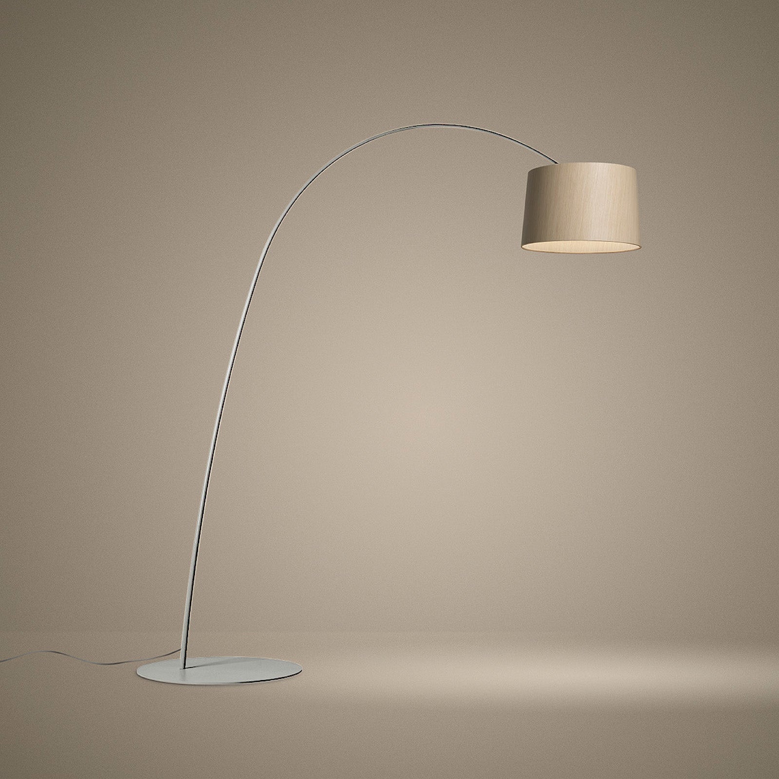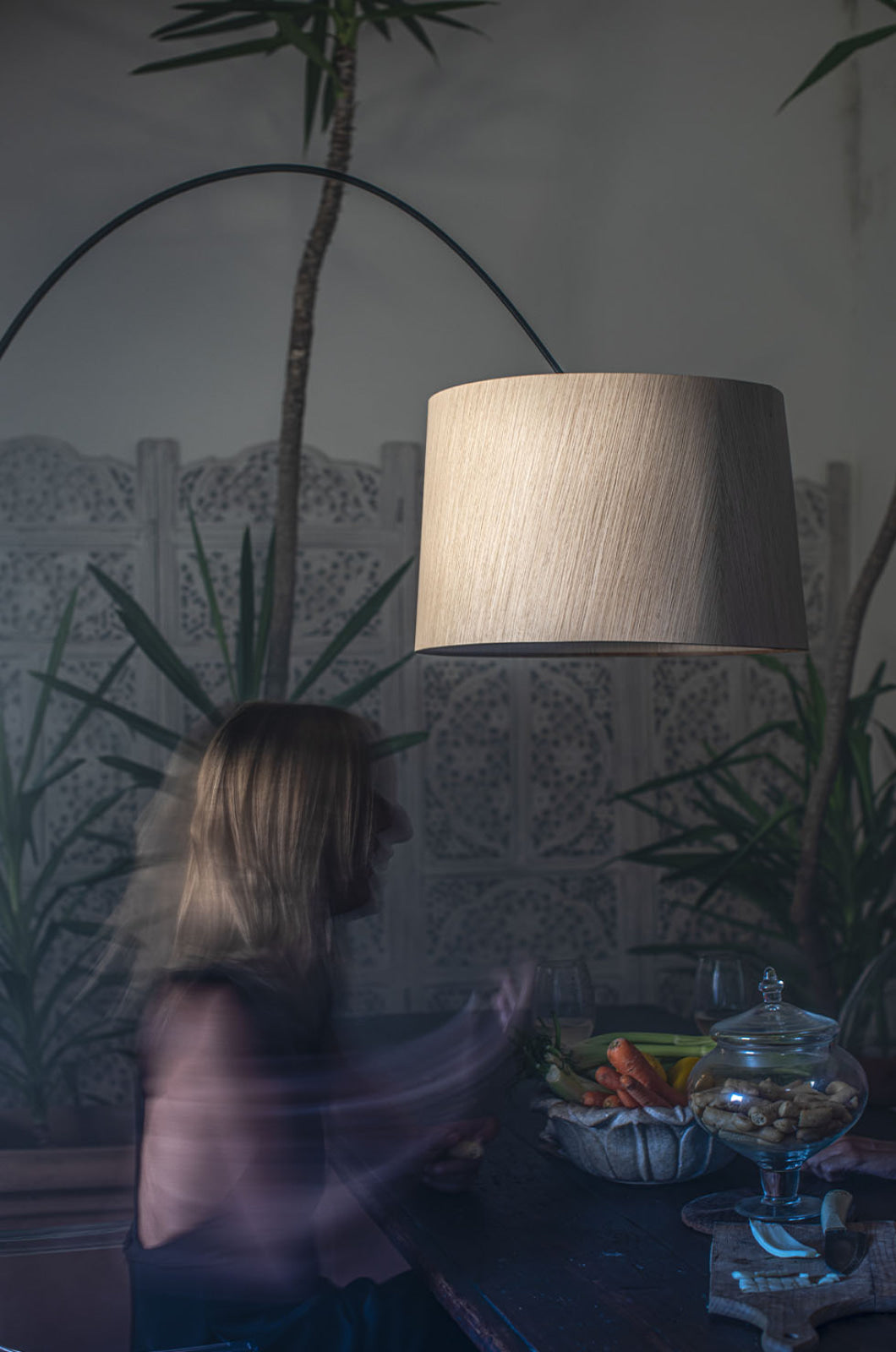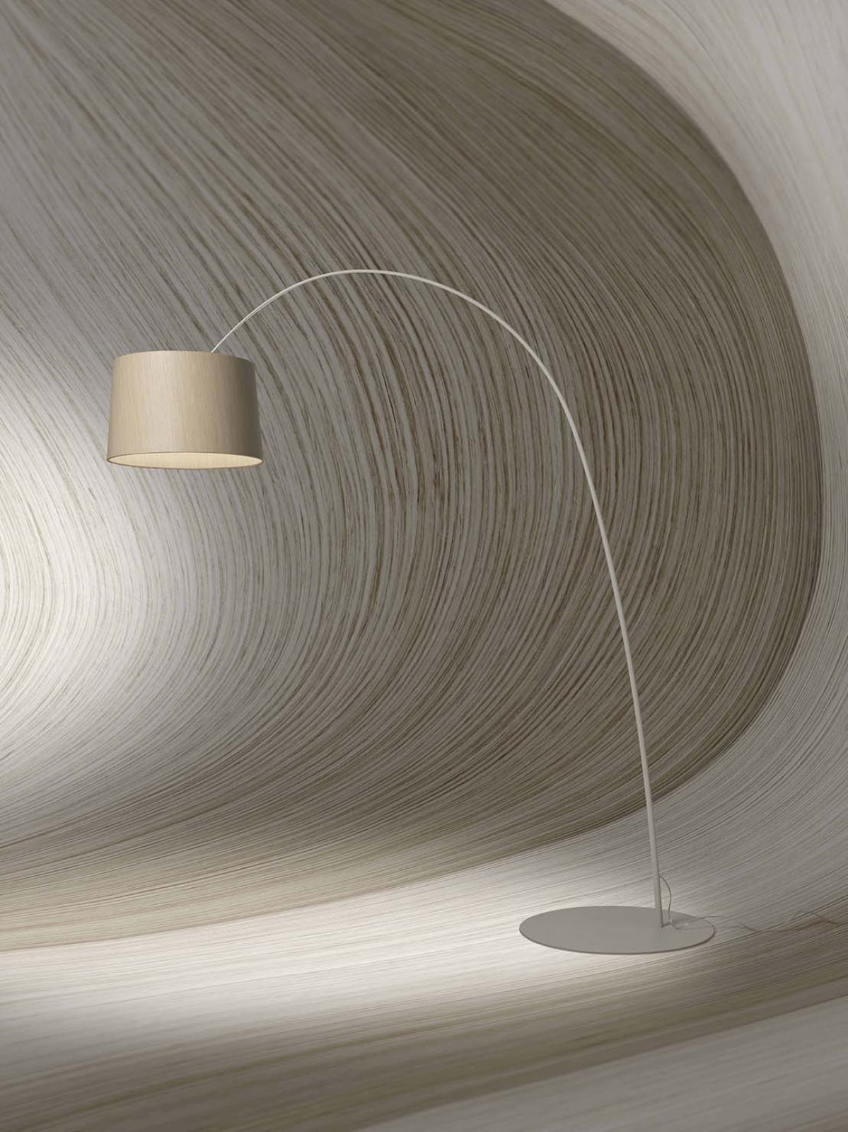 A fine arched line, a flexible sign which by magic suspends a large diffuser in mid-air: this is Twiggy, a floor lamp that meets multiple setting and lighting requirements.
