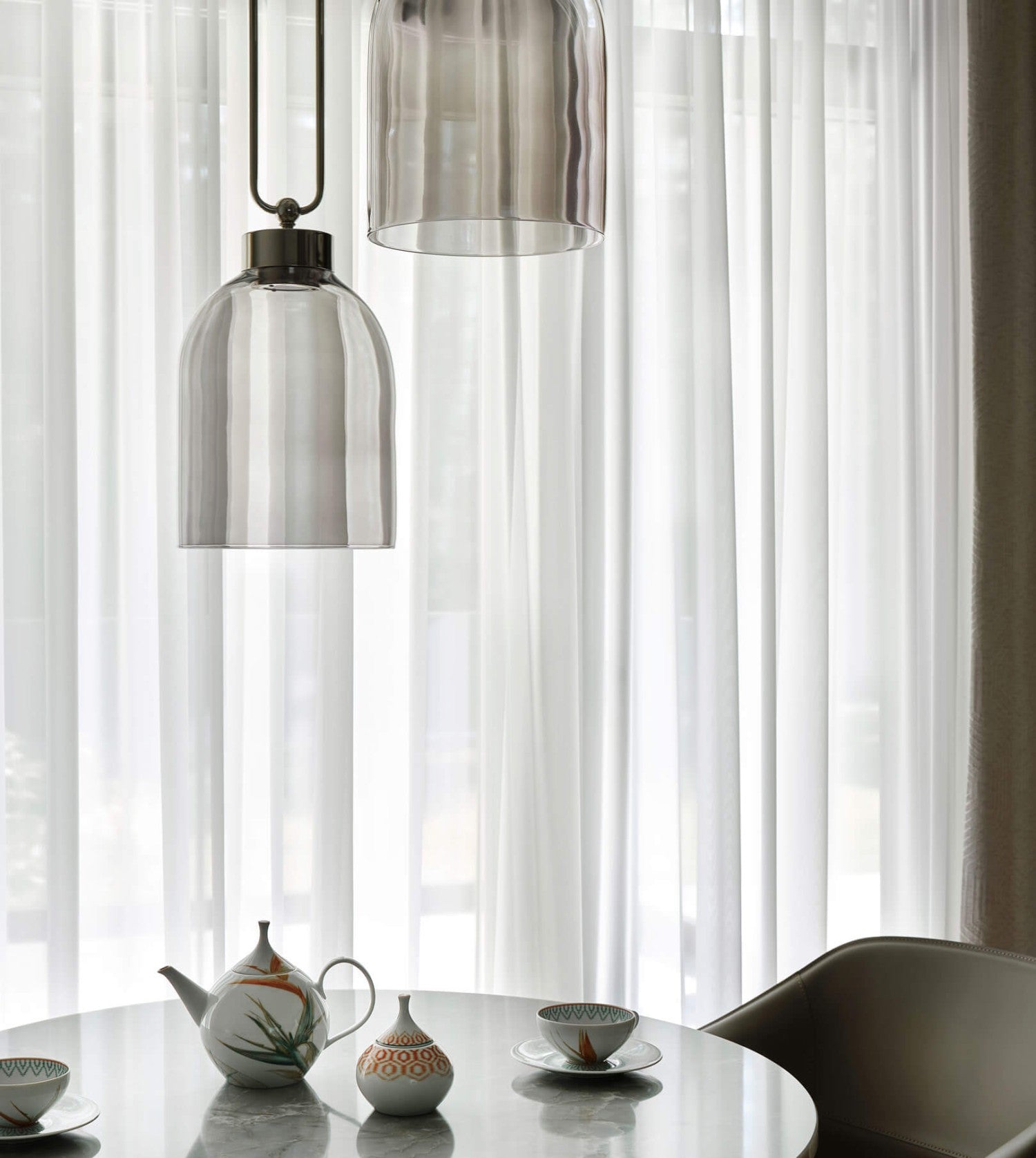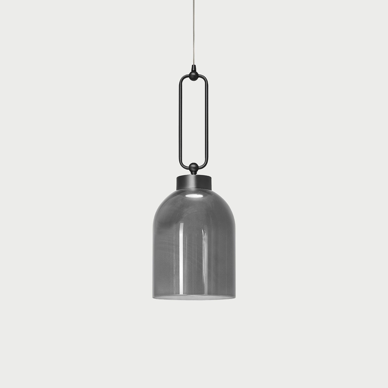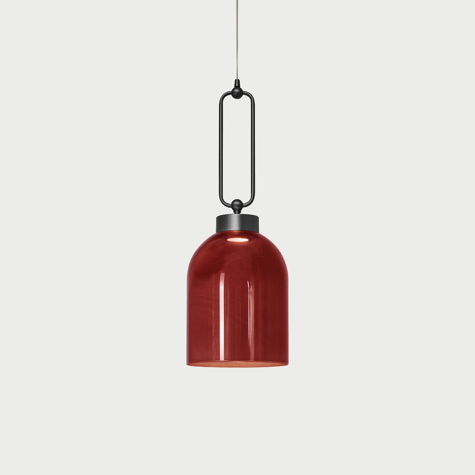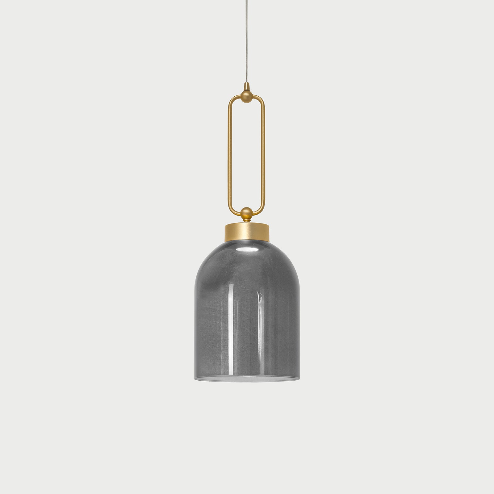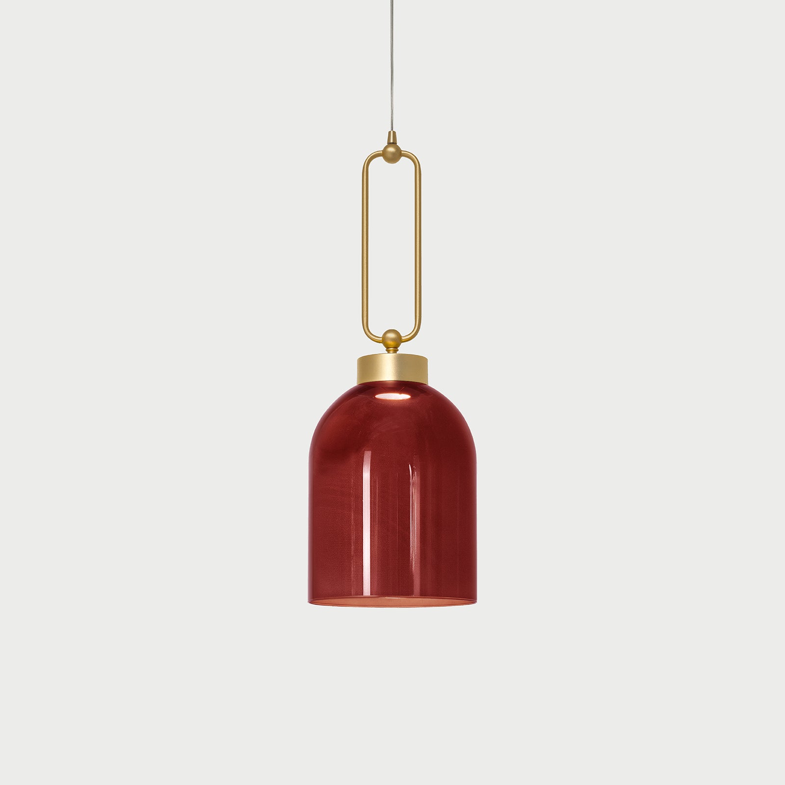 Suspension lamp in metal with brushed gold or iron grey finish and red, smoked or agatha glass diffuser.