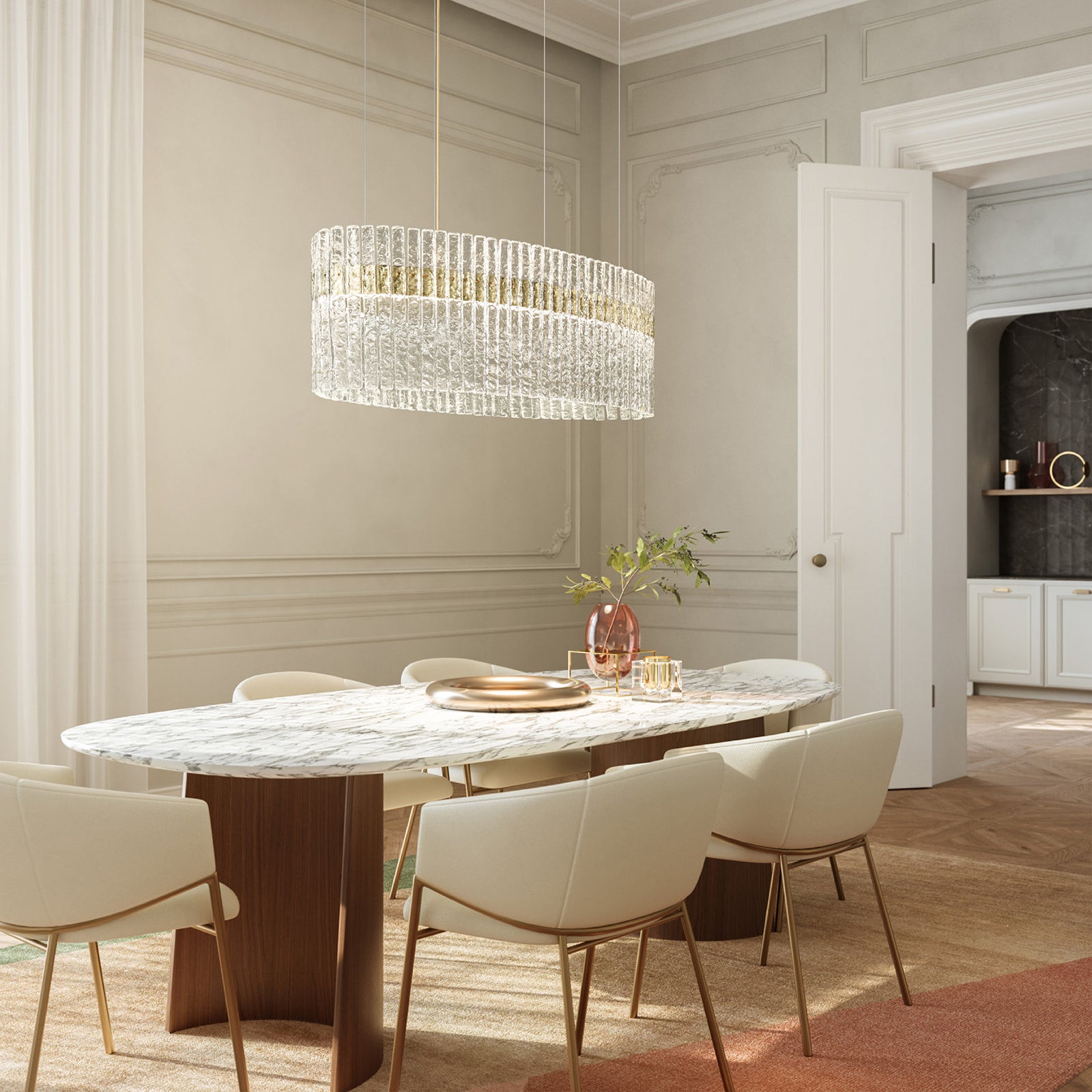 Vegas is loosely inspired by the architecture of Las Vegas, the city that never sleeps. With their classic geometric style, the iconic Art Deco lights are reinterpreted in a contemporary key, combining glass and metal using the most modern manufacturing techniques.