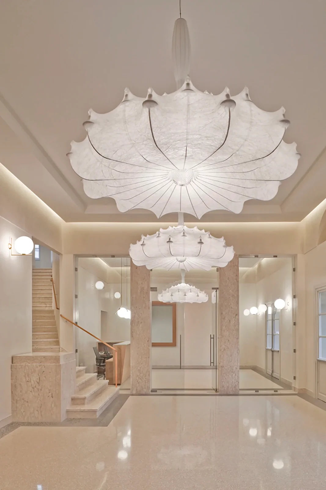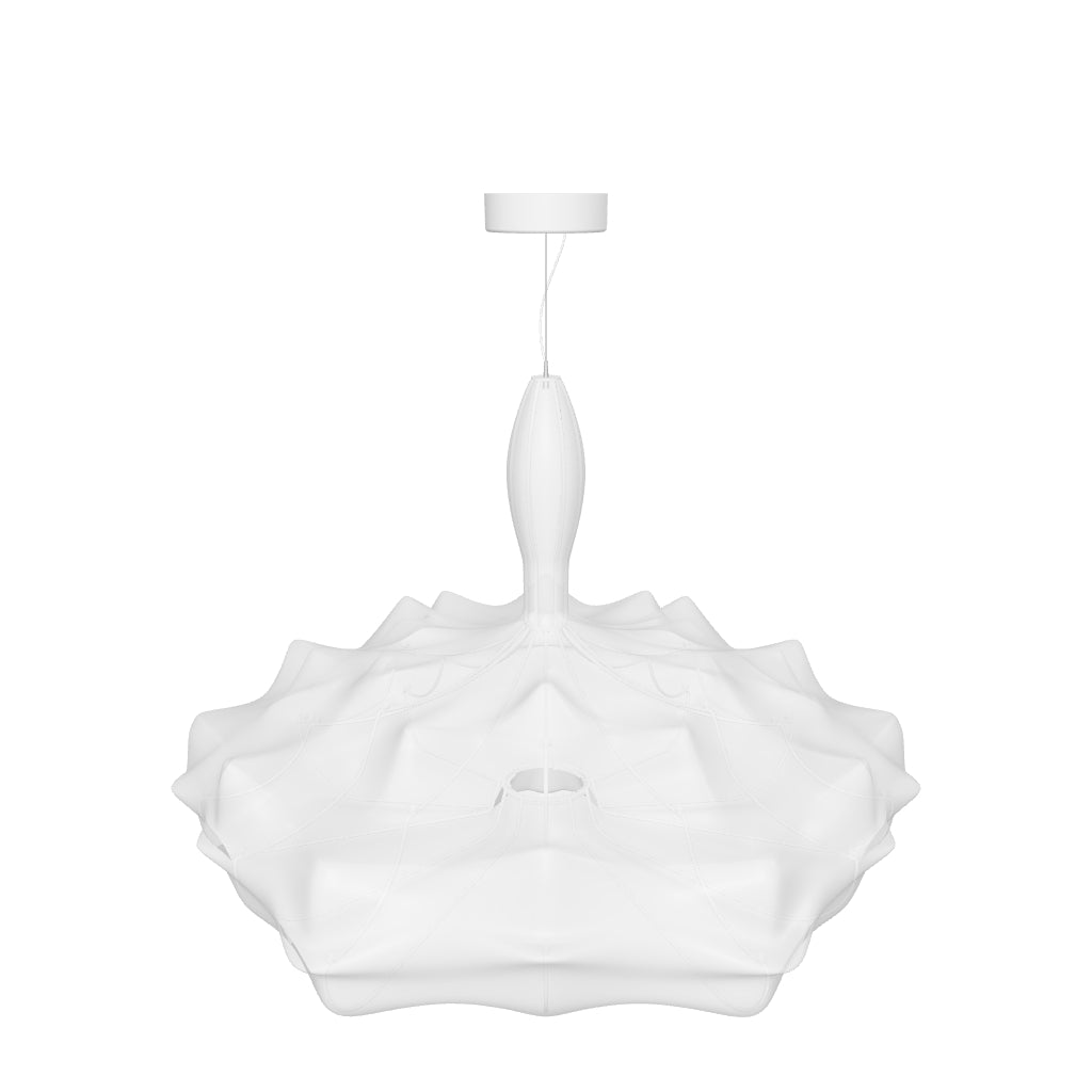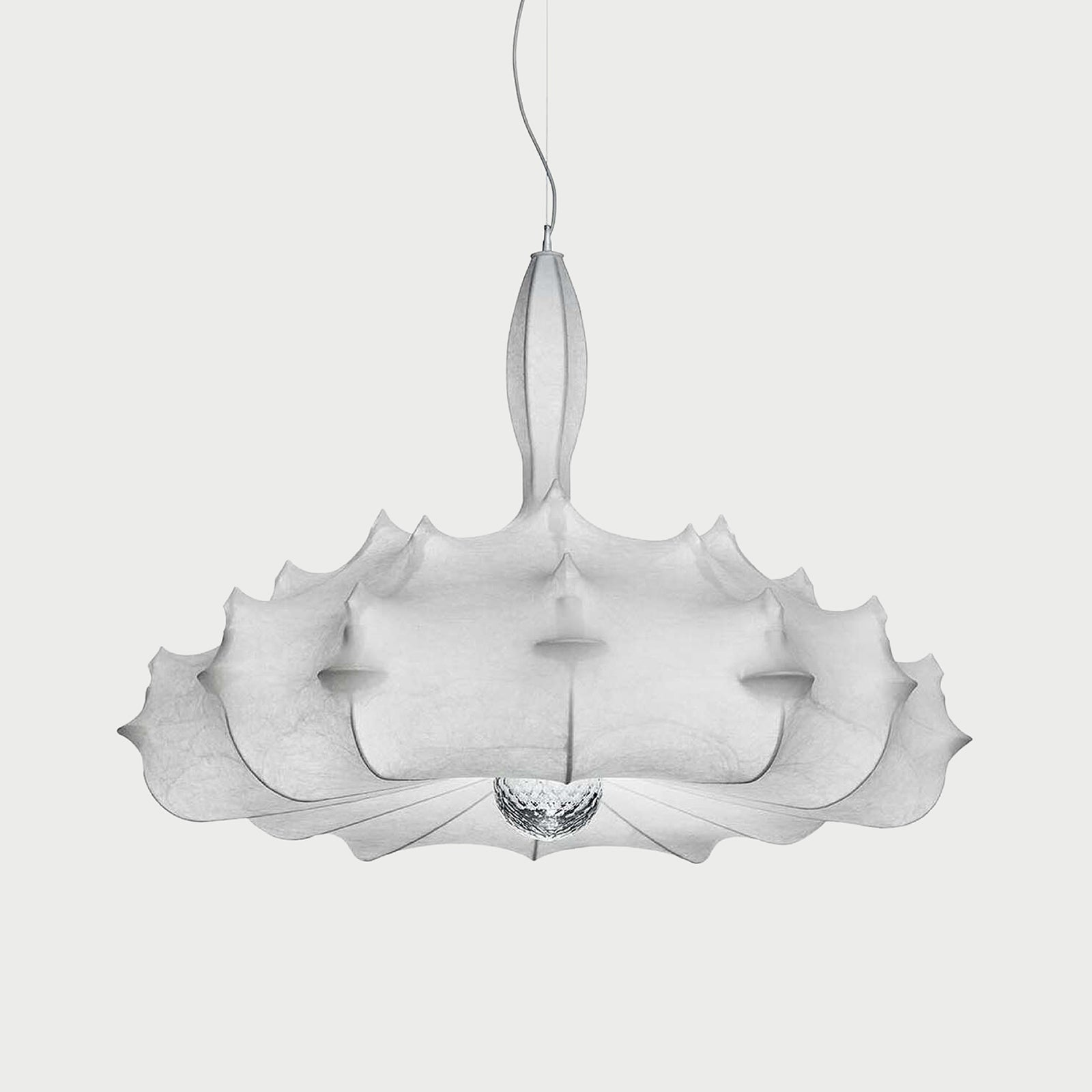 Suspension lamp providing diffused lighting. White powder coated internal steel structure sprayed with a unique "cocoon resin to create the diffuser which is then protected by a transparent sprayed on finish. Transparent polymethylmethacrylate(PMMA) "candles. Faceted crystal globe located at the lower center for a sparkle effect.